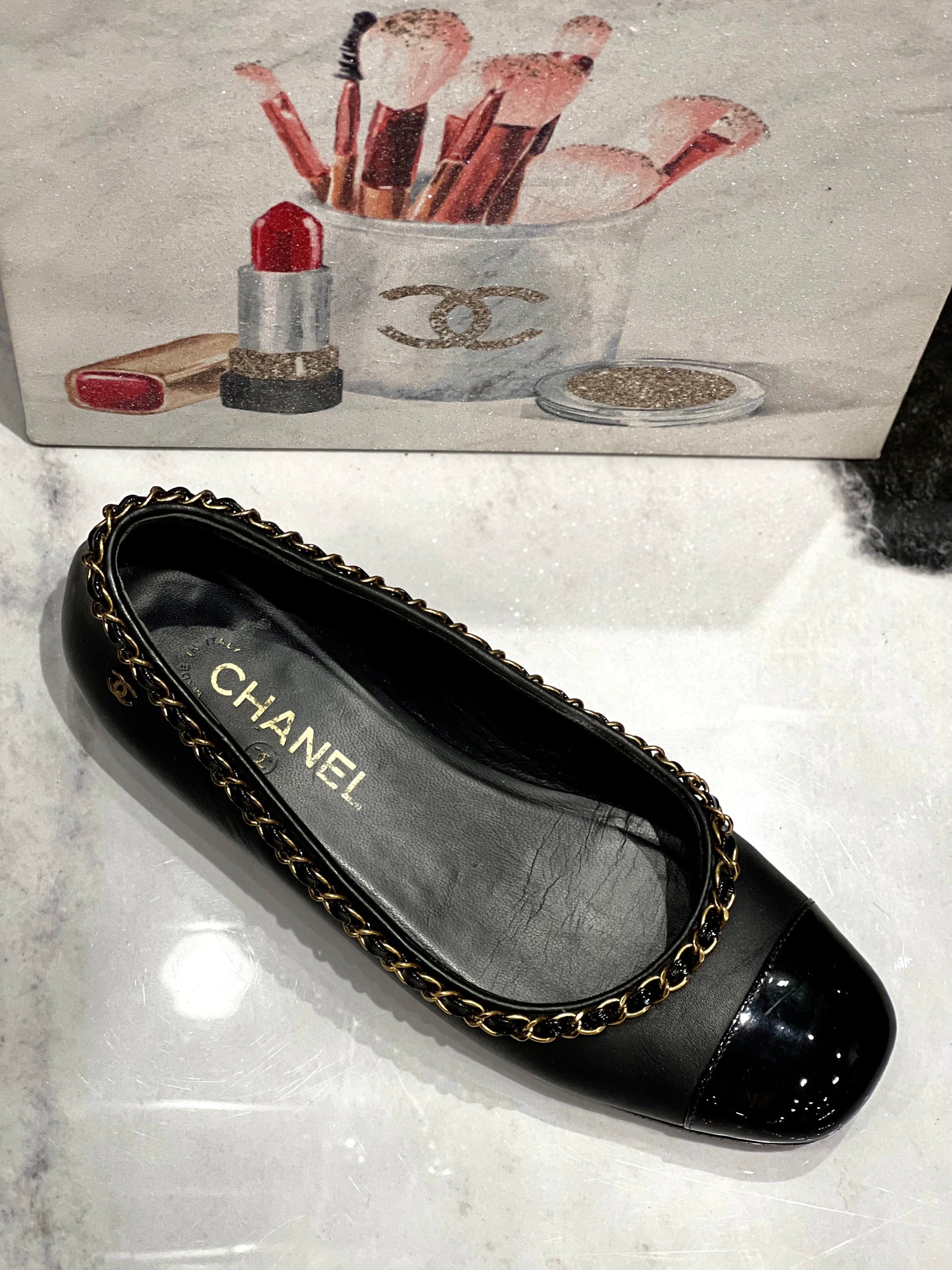 Gorgeous details and unparalleled elegance makes these Chanel Shoes simply amazing. Crafted from leather and patent leather and styled with cap toes, gold-tone chain-link embellished trims, and the iconic CC logo detailing.