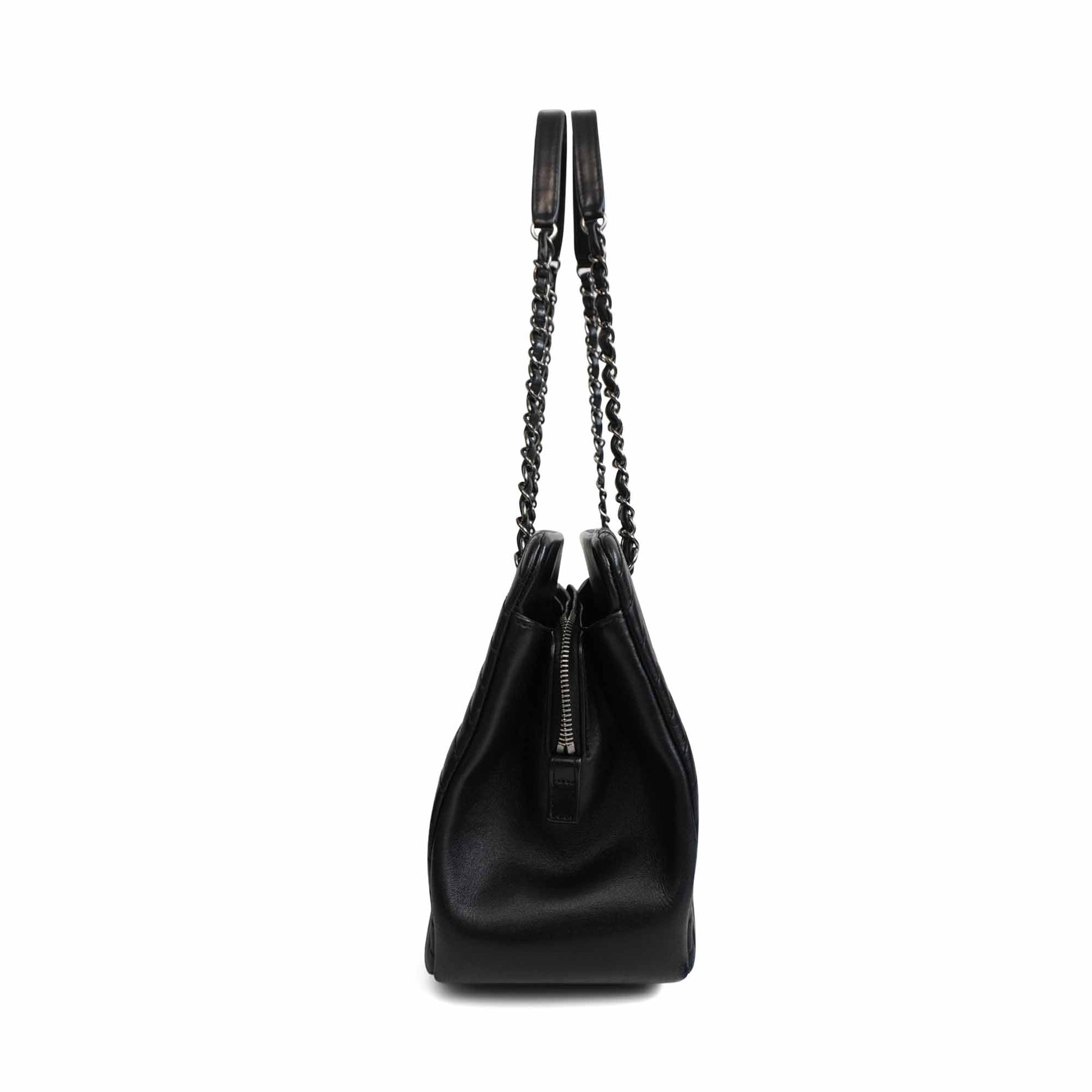Chanel 'CC Crossing' shopping tote bag in black chevron quilted leather with dual mademoiselle chain woven straps and a signature 'CC' logo plaque on the front in gunmetal hardware. The bag has an open top with dual main compartments and a centre zip pocket.