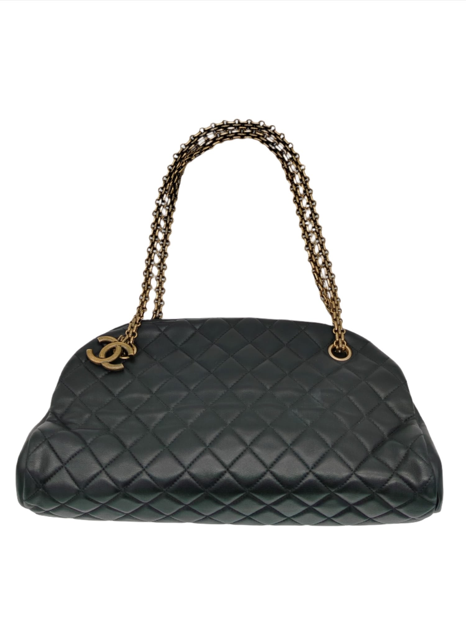 The bag features an aged brass bar along the top with the Chanel name embossed and aged brass chain link shoulder straps with a leather shoulder pad and a facing aged brass squared Mademoiselle turn lock for the facing flap.