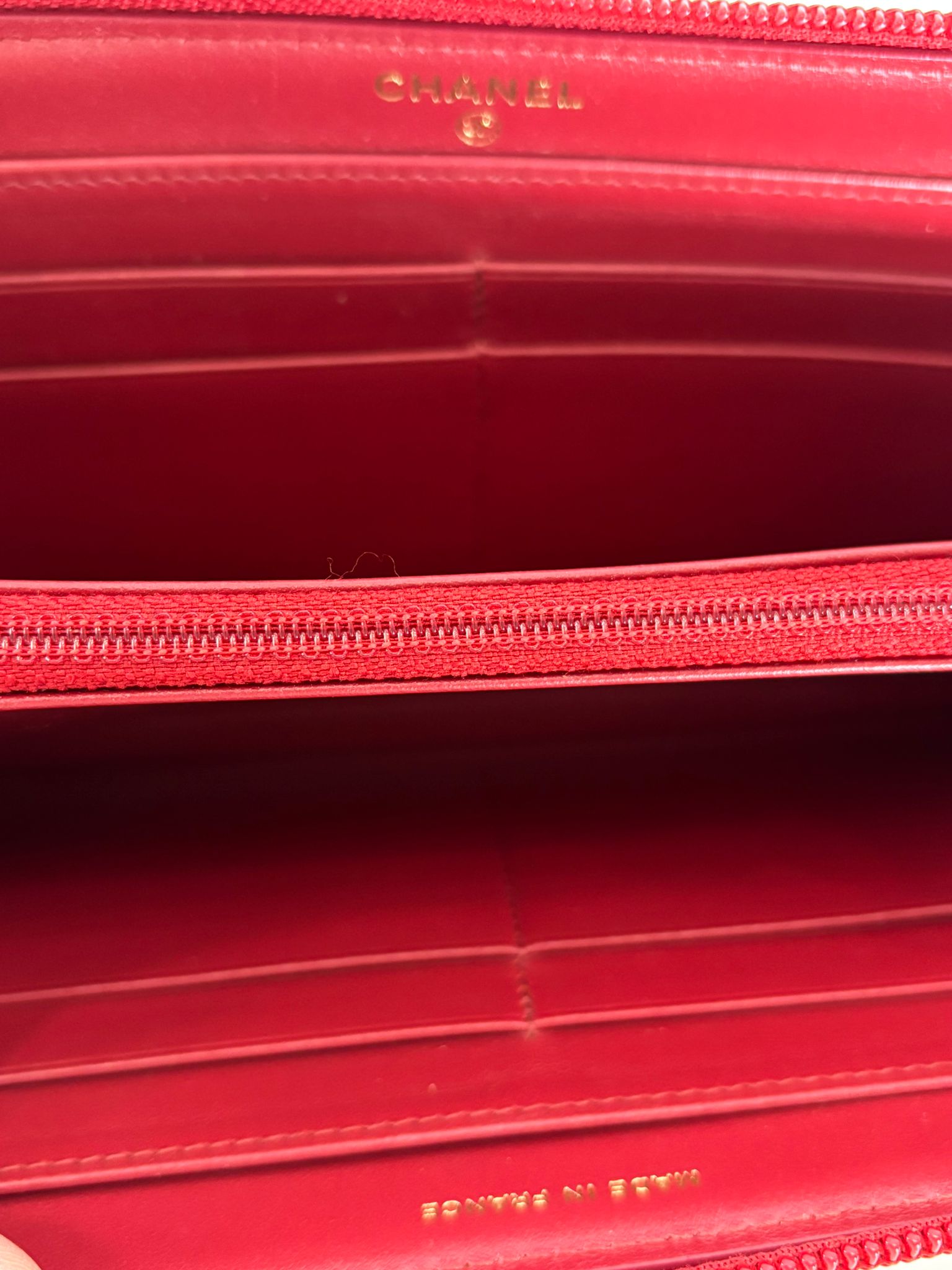 This Stunning Chanel Boy Yen Wallet is crafted in Chevron-Quilted Lambskin leather in a rich bright red hue. It features Chanel’s signature Boy CC logo in Gold-tone hardware and a zip-around closure for both elegance and security.