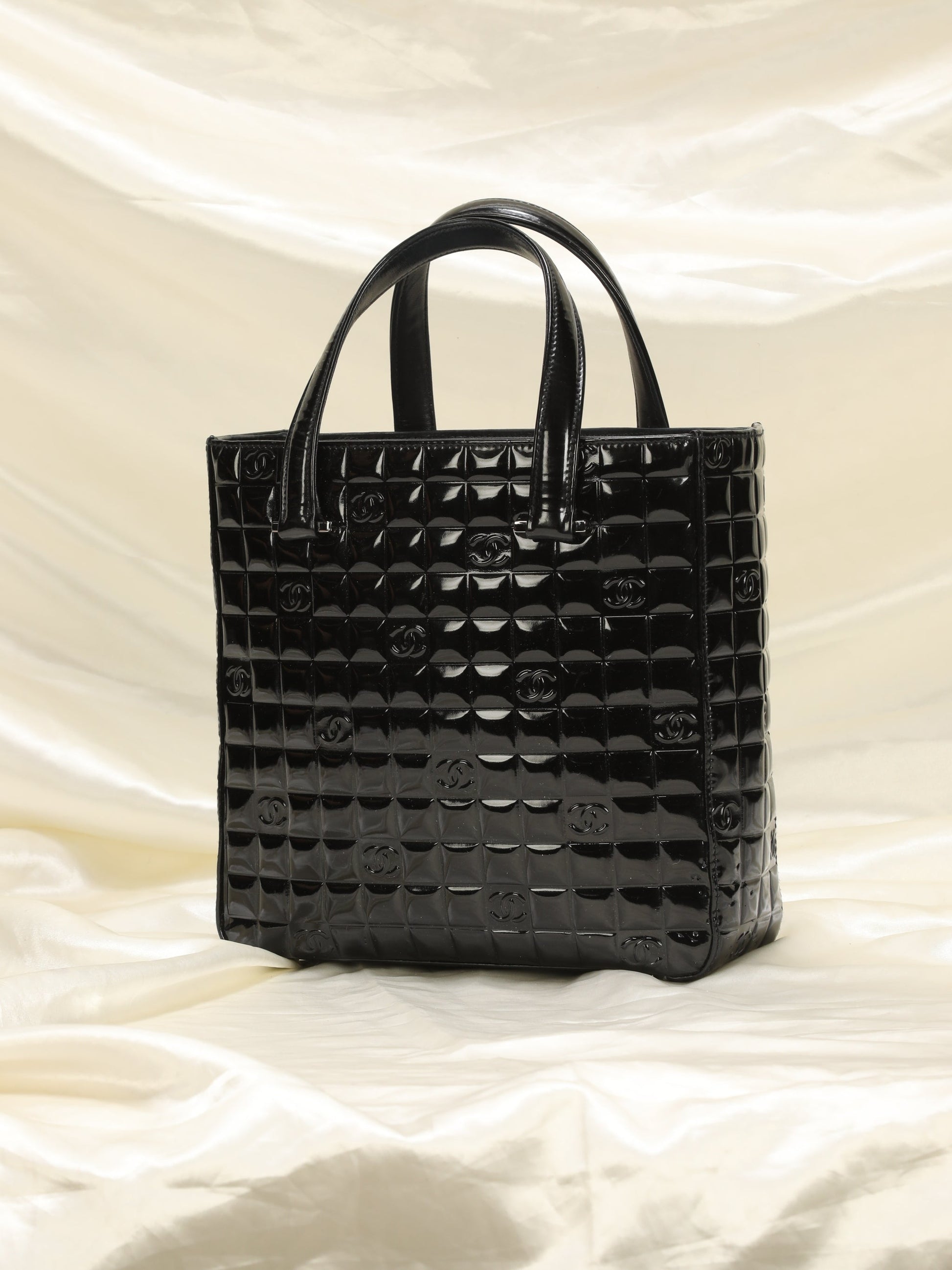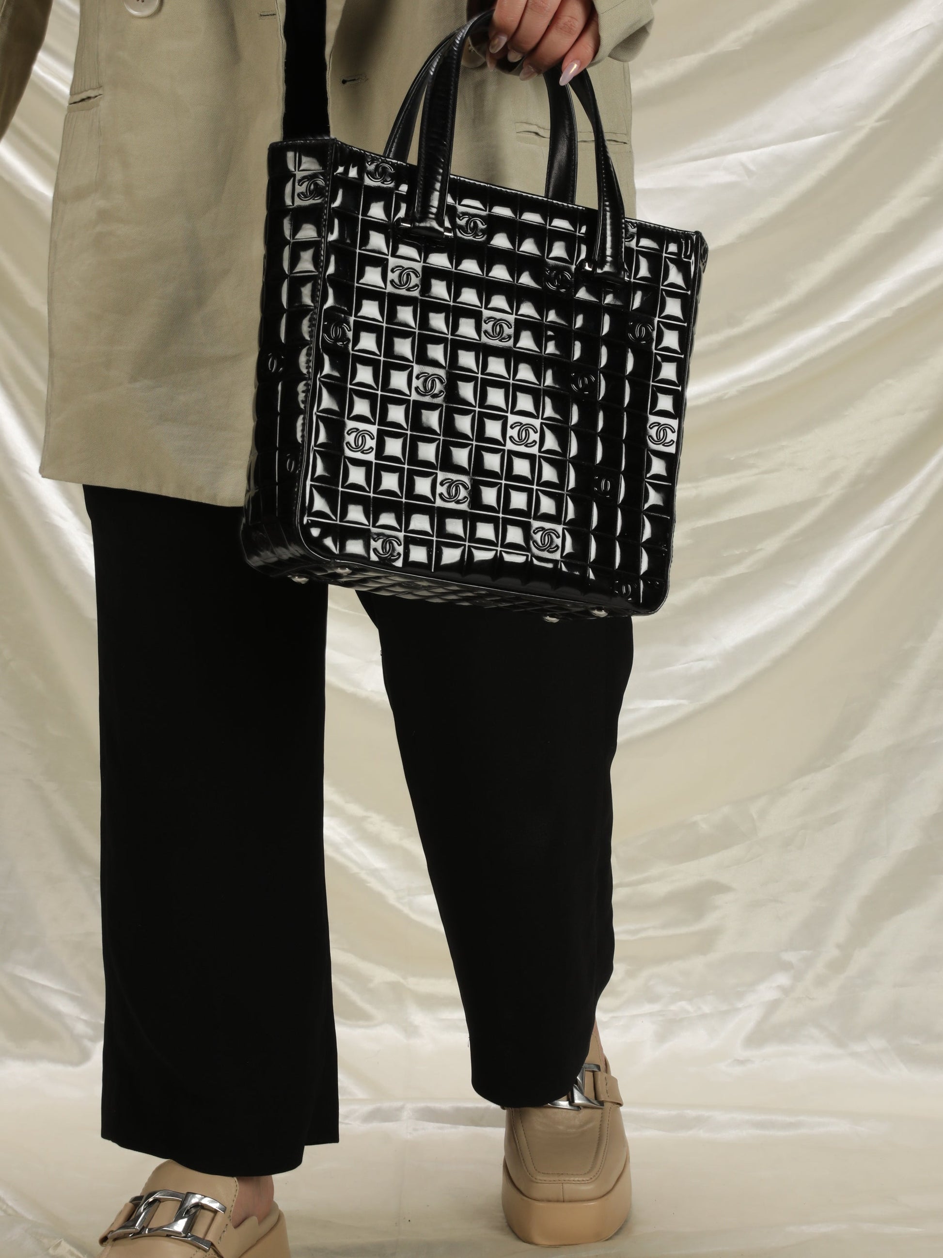 A rare vintage Chanel patent chocolate bar handle bag!?ÿTiny CC logos adorn this tote. Lightweight and spacious enough to fill all your everyday essentials. A timeless piece that will be for years to come.?ÿ