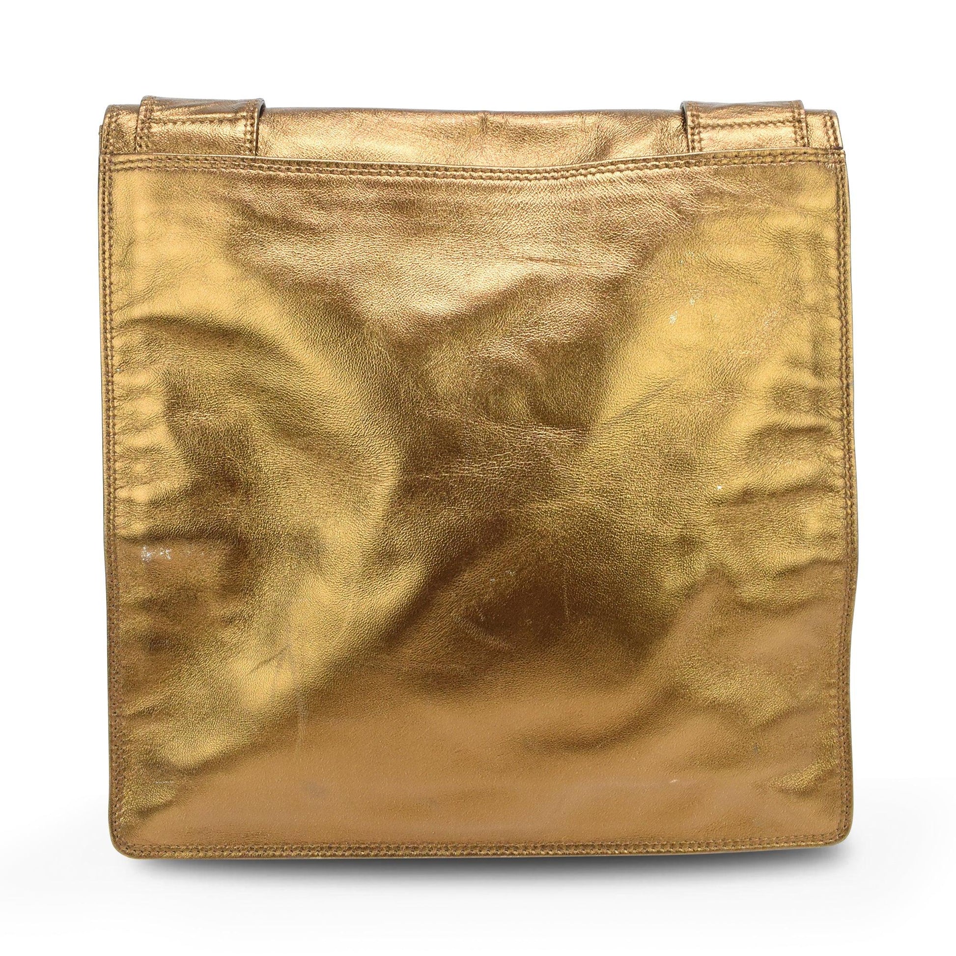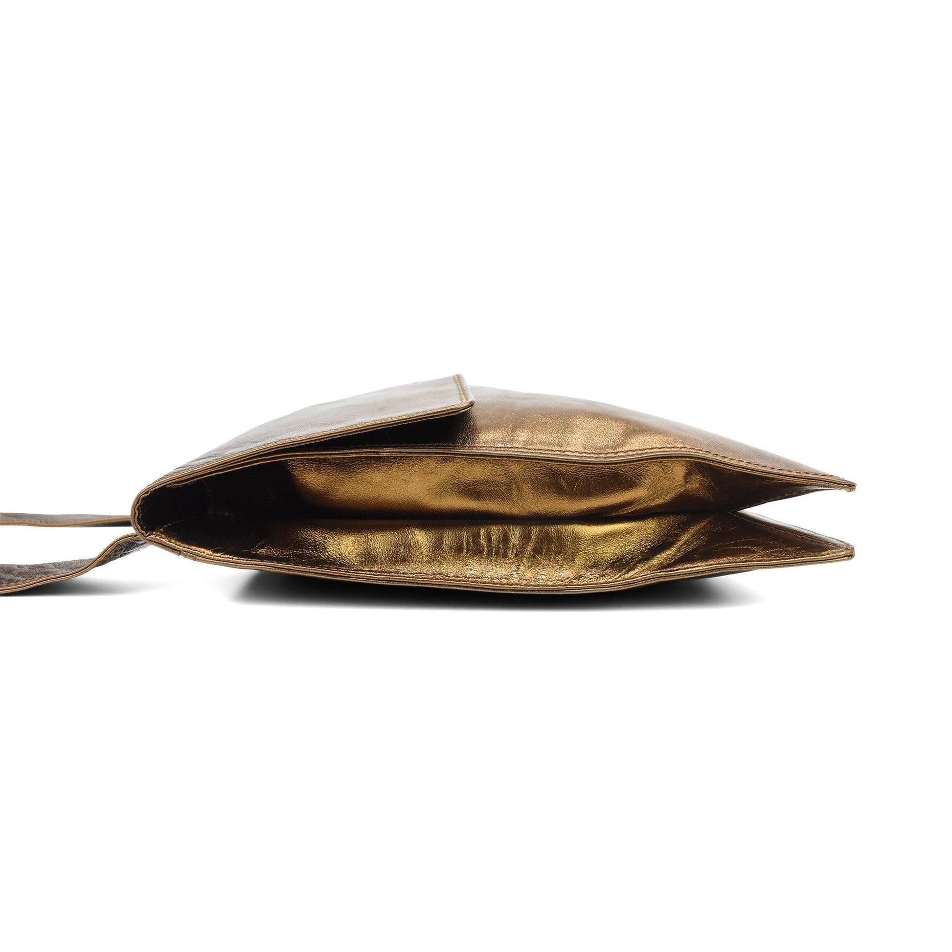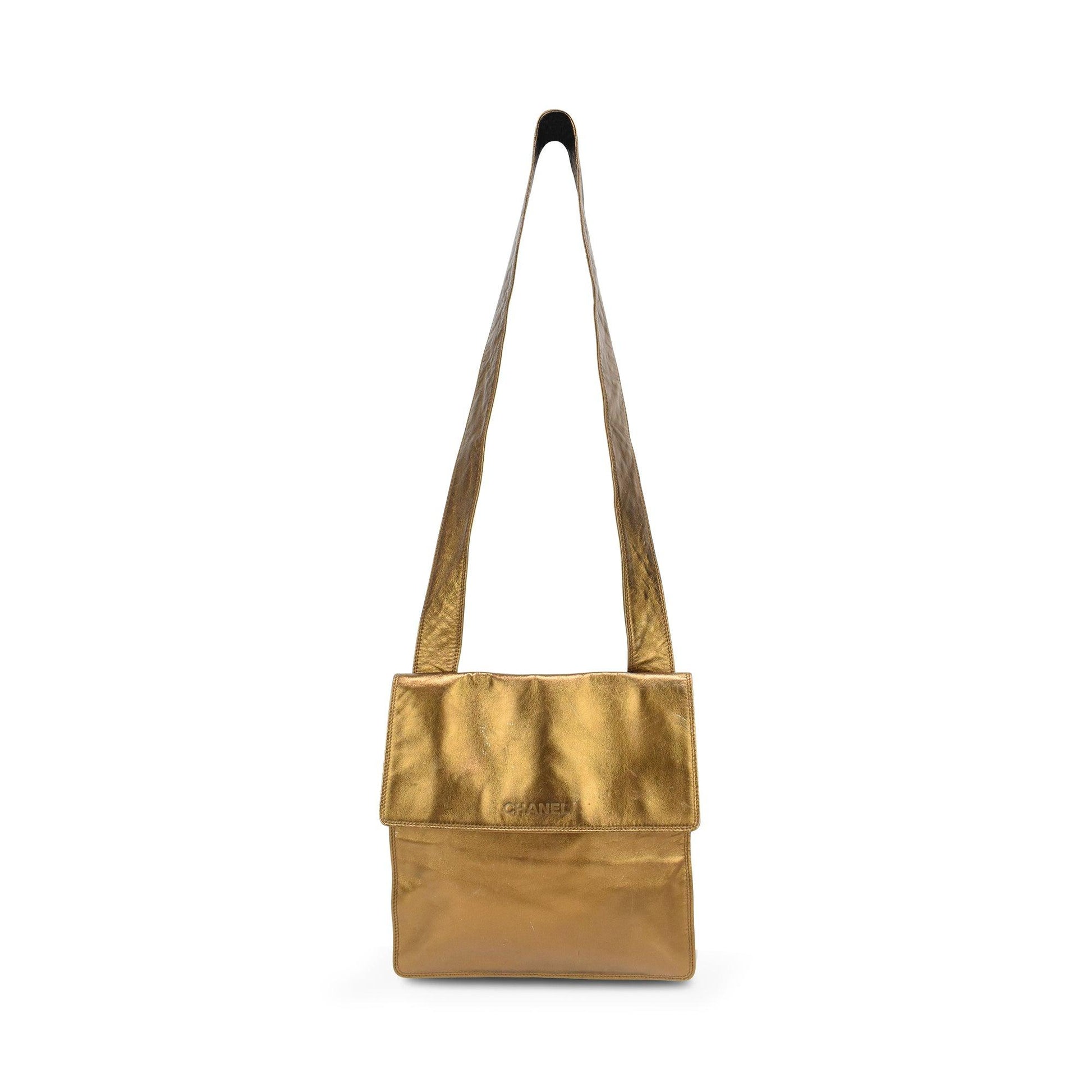 Chanel flat crossbody bag in bronze metallic leather with a magnetic top flap closure, long flat crossbody strap, slip pocket on the back, and embossed logo on the flap. The interior features a brown canvas lining with a zip pocket.
