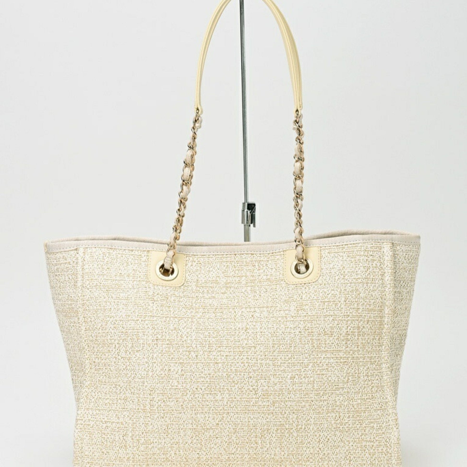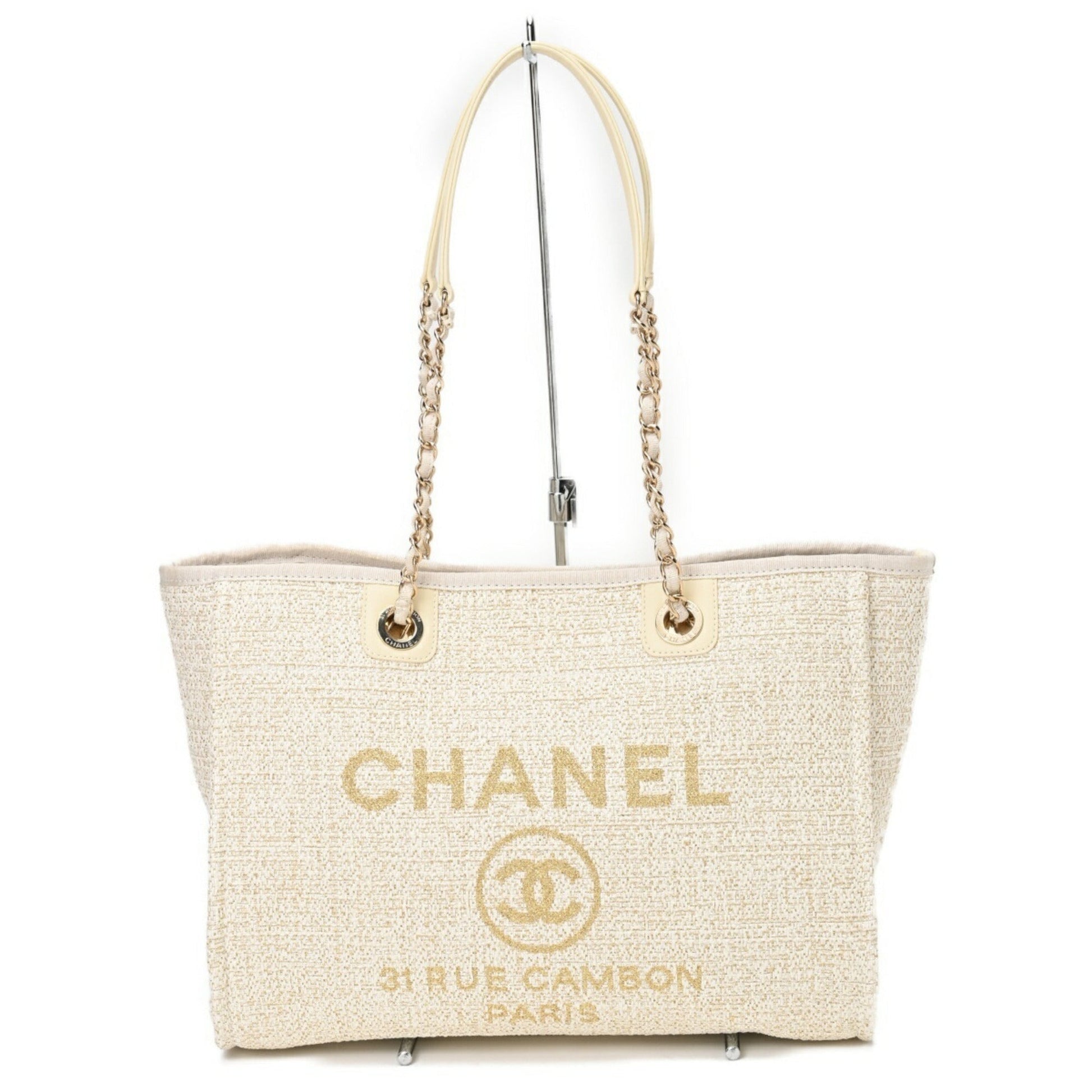 CHANEL Deauville MM Medium Chain Tote Bag A67001 Straw Canvas/Leather White/Gold B-156016