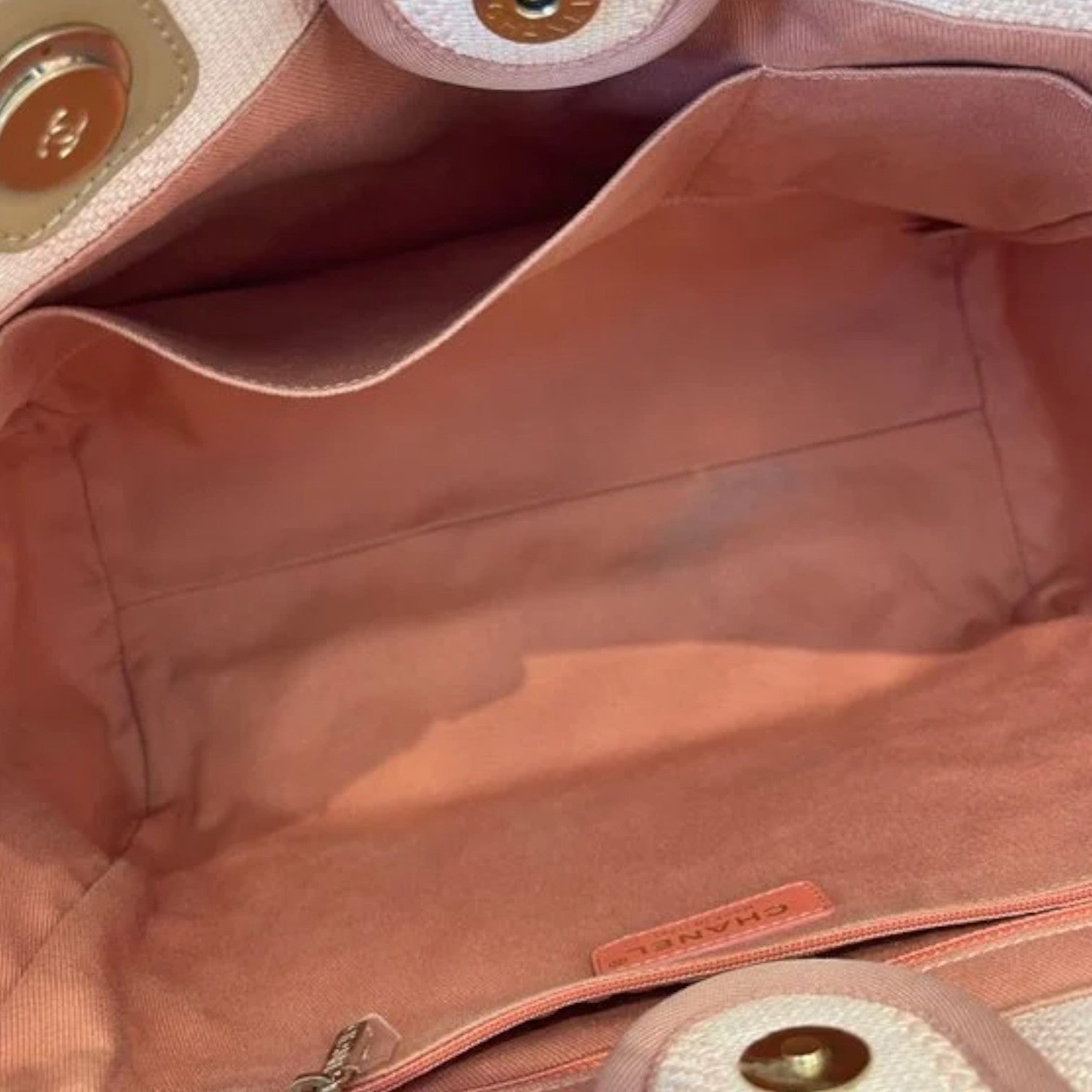 This is an Chanel Deauville Tote Small Mixed Fibers Striped in Beige. This lovely woven tote is crafted of fine raffia with an iconic Chanel logo. The bag features canvas threaded light gold chain shoulder straps and an open-top. The top opens to a fabric interior with zipper pocket.