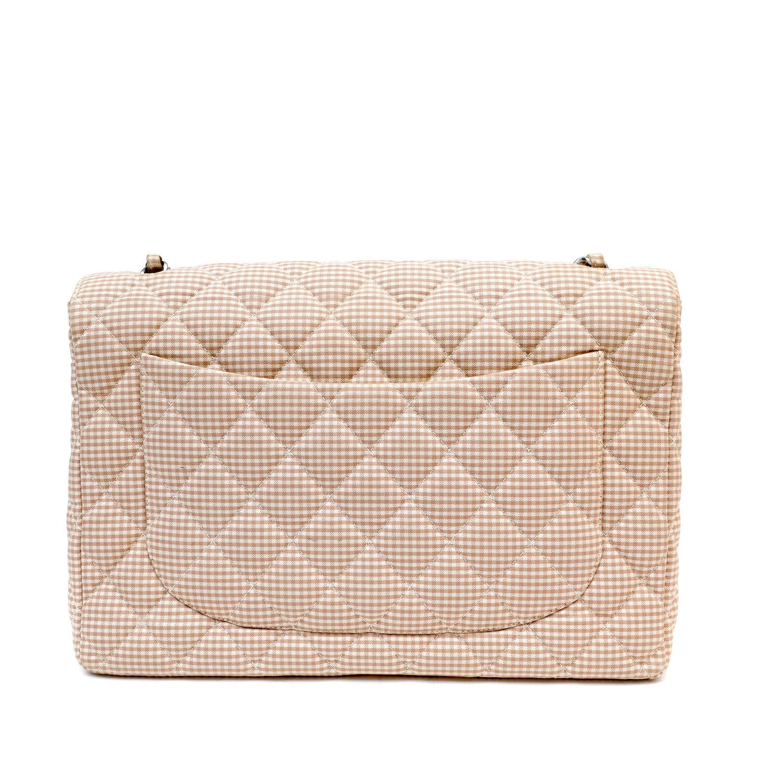 This Chanel Gingham Fabric Maxi Flap Bag is in excellent condition. Very unique and collectible style. Tan ad cream gingham check fabric is quilted in signature Chanel diamond pattern. Silver tone interlocking CC twist lock secures the front flap. Fabric and chain entwined strap may be carried single or double. Dust Bag included.