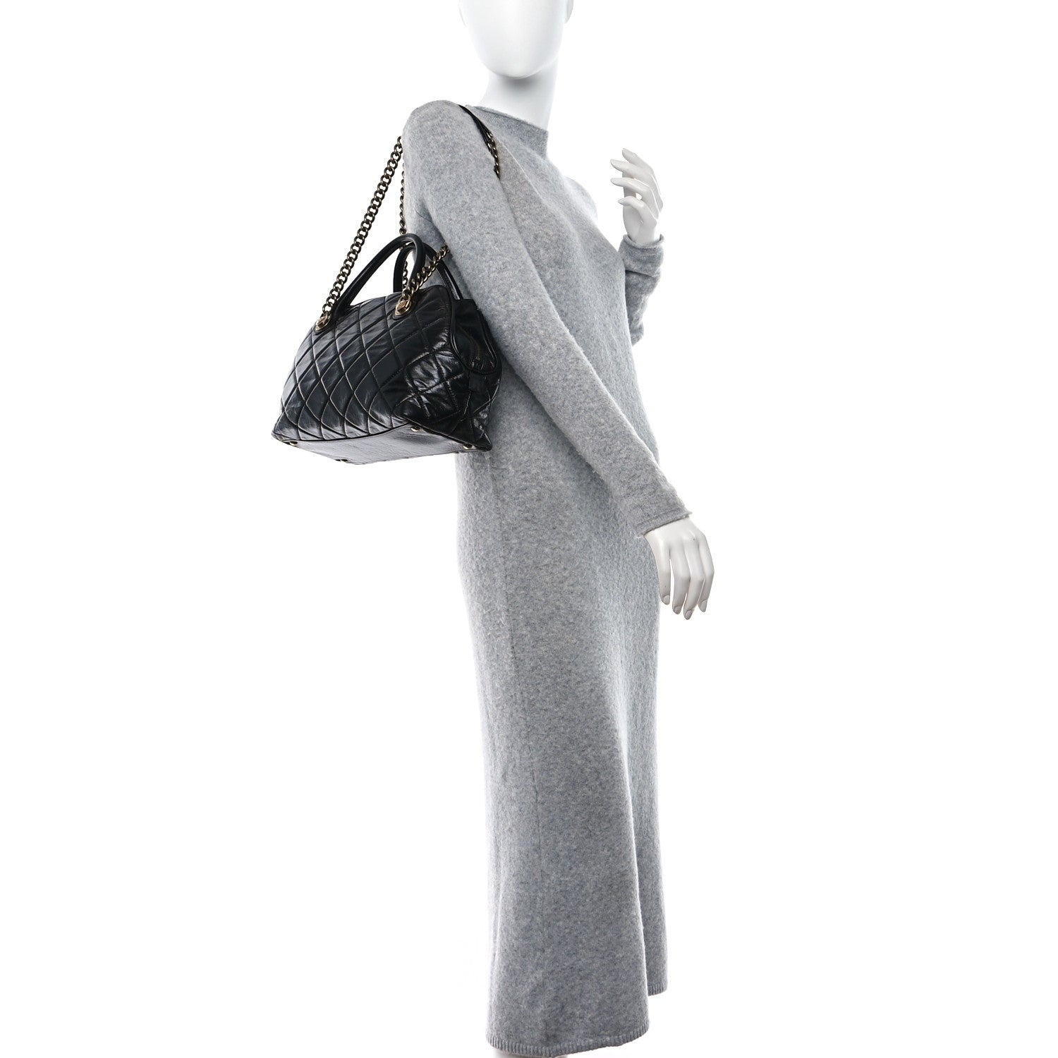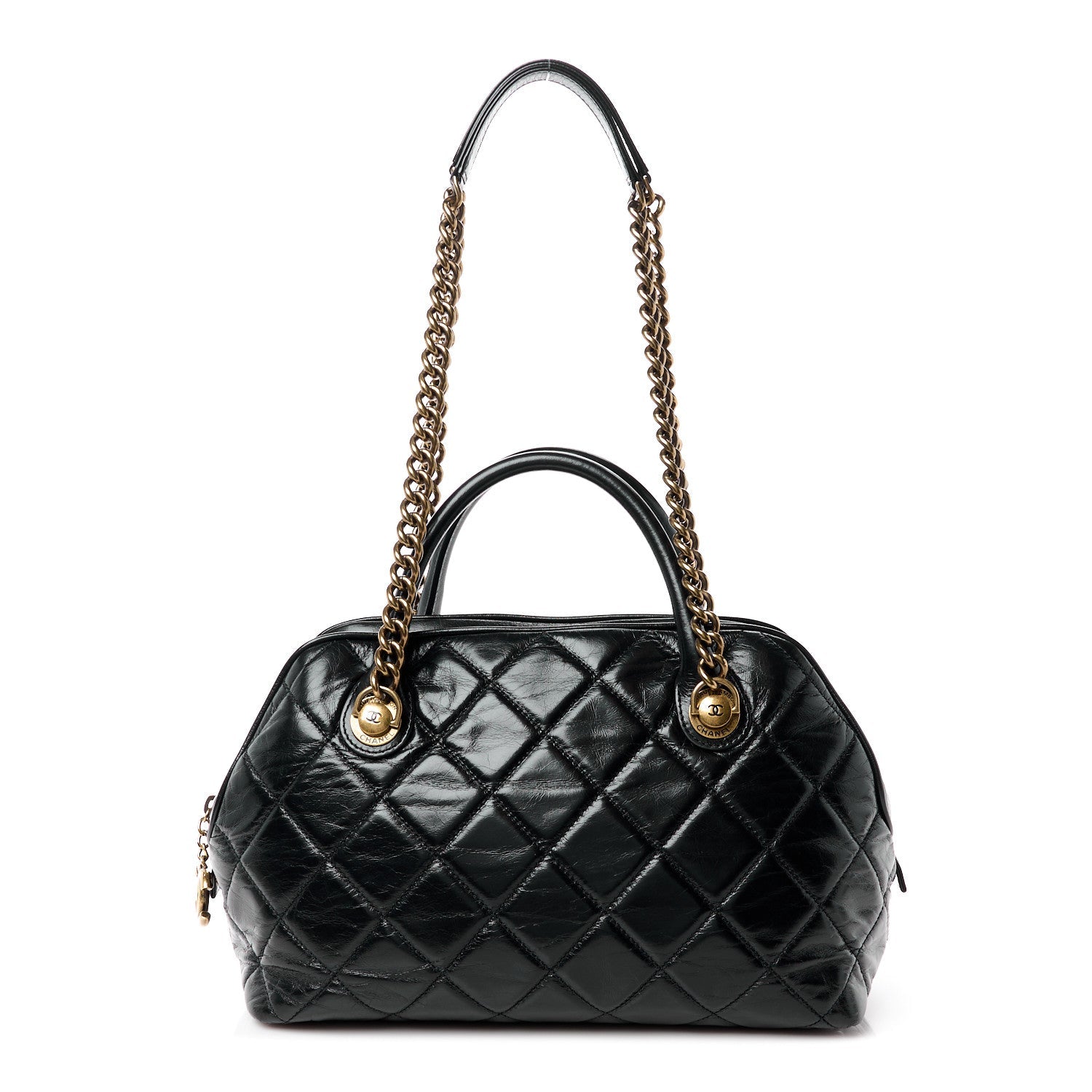 Elevate your style with the luxurious Chanel Glazed Calfskin Castle Rock Bowling Bag in sleek black. Crafted from high-quality calfskin leather, this bag exudes sophistication and elegance. The spacious interior is perfect for carrying all your essentials in style, while the iconic Chanel logo adds a touch of timeless glamour. Whether you're heading to a business meeting or a night out, this bag is the perfect accessory to complete your chic look. Make a statement with the Chanel Glazed Calfskin Castle Rock Bowling Bag in black.