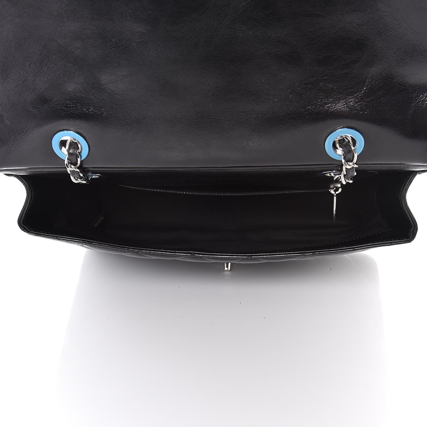 The shoulder bag features polished silver chain link shoulder straps threaded with leather, a black resin top handle, and a front flap with a silver Chanel CC turn lock. There is a black fabric interior with zipper and patch pockets.