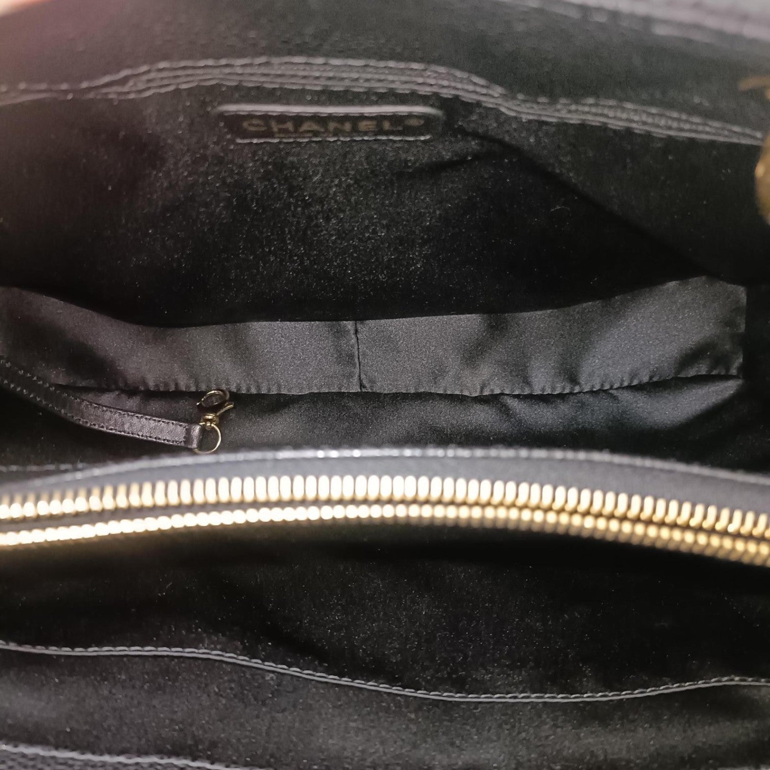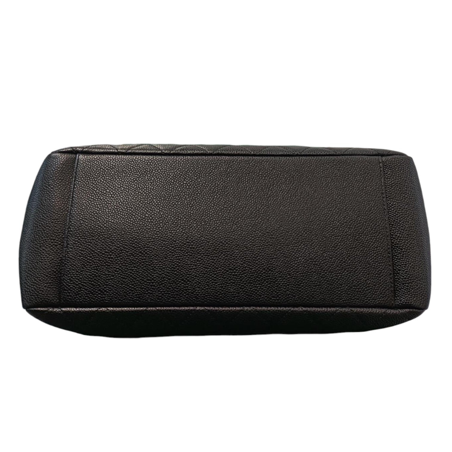 This is an Chanel Grand Shopping Tote GST Caviar in Black. This tote bag is crafted from black caviar leather. The bag has shoulder straps that are adorned with gold chain links woven through leather and leather shoulder pads for added comfort. The front of the bag has a prominent stitched Chanel CC logo and the back has a flat pocket. The top zipper reveals a black fabric interior with both zipper and patch pockets.