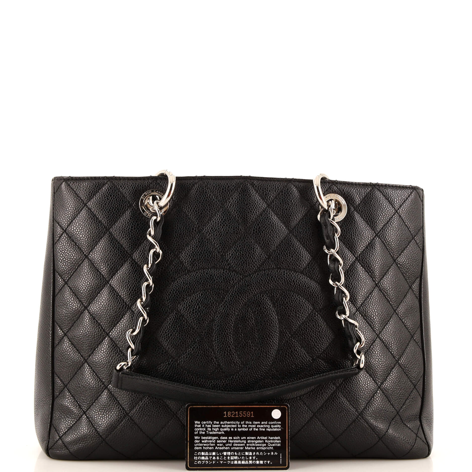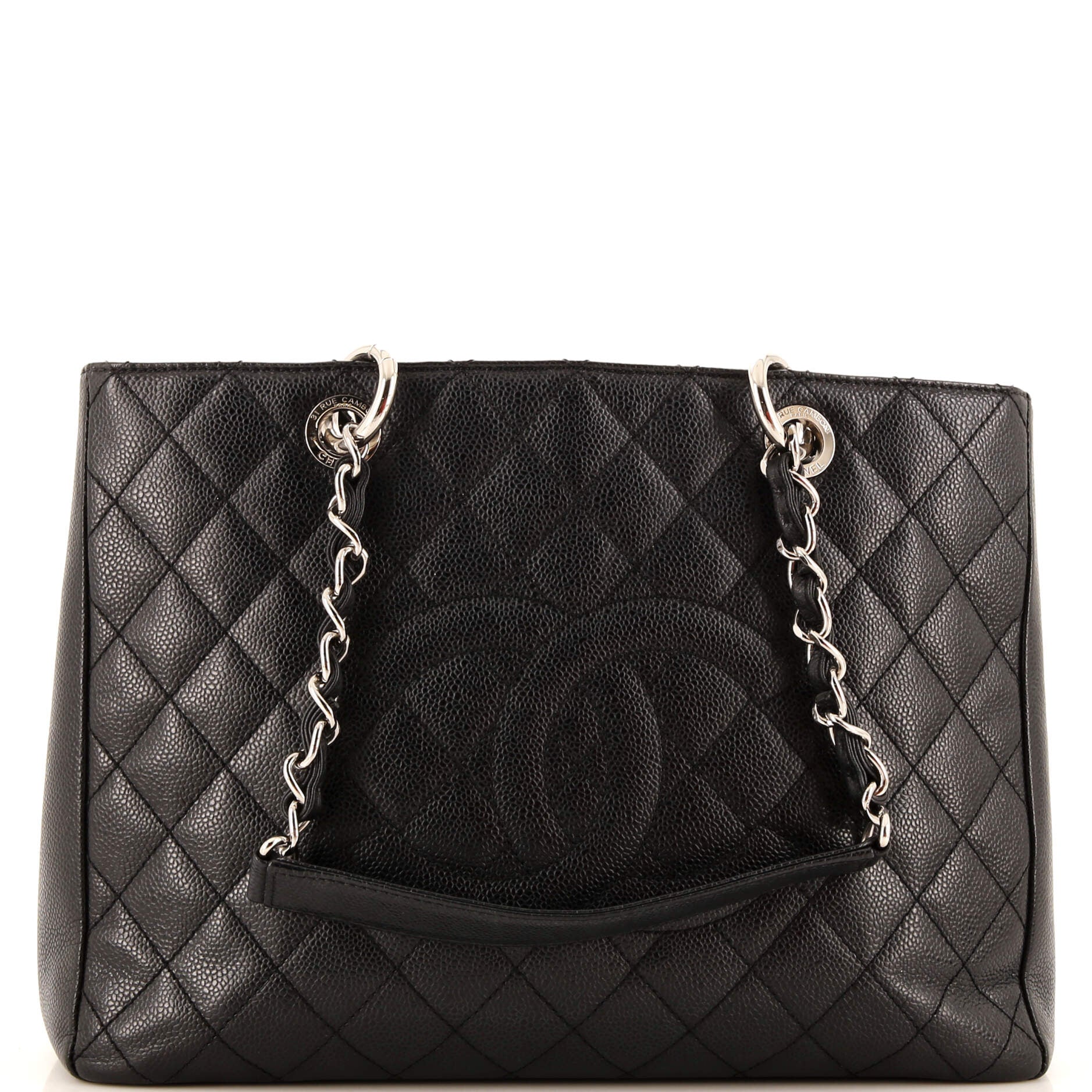 Introducing the iconic Chanel Grand Shopping Tote in luxurious Quilted Caviar leather. This timeless piece exudes elegance and sophistication, perfect for the modern fashionista on the go. With its spacious interior and classic chain straps, it seamlessly combines style and practicality.