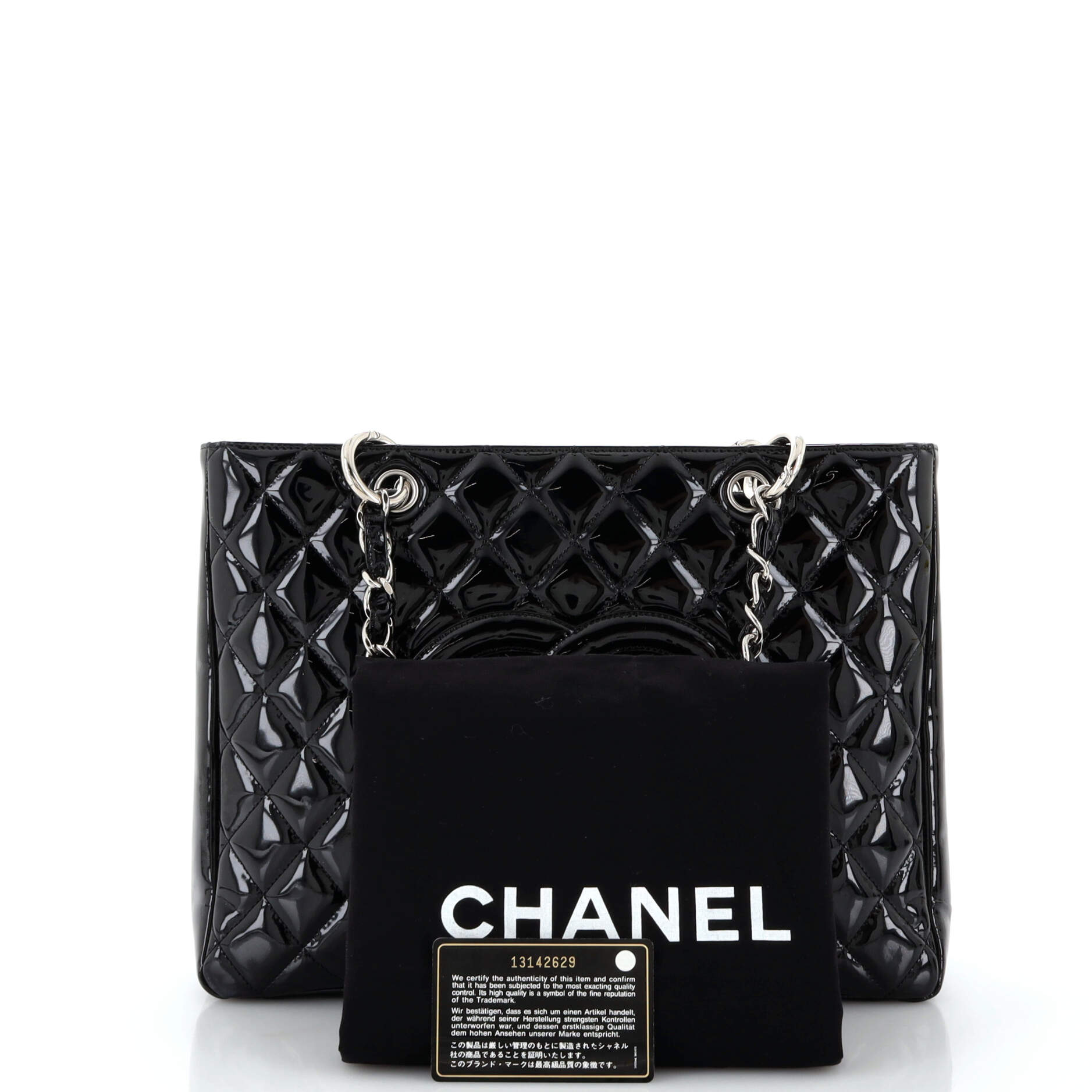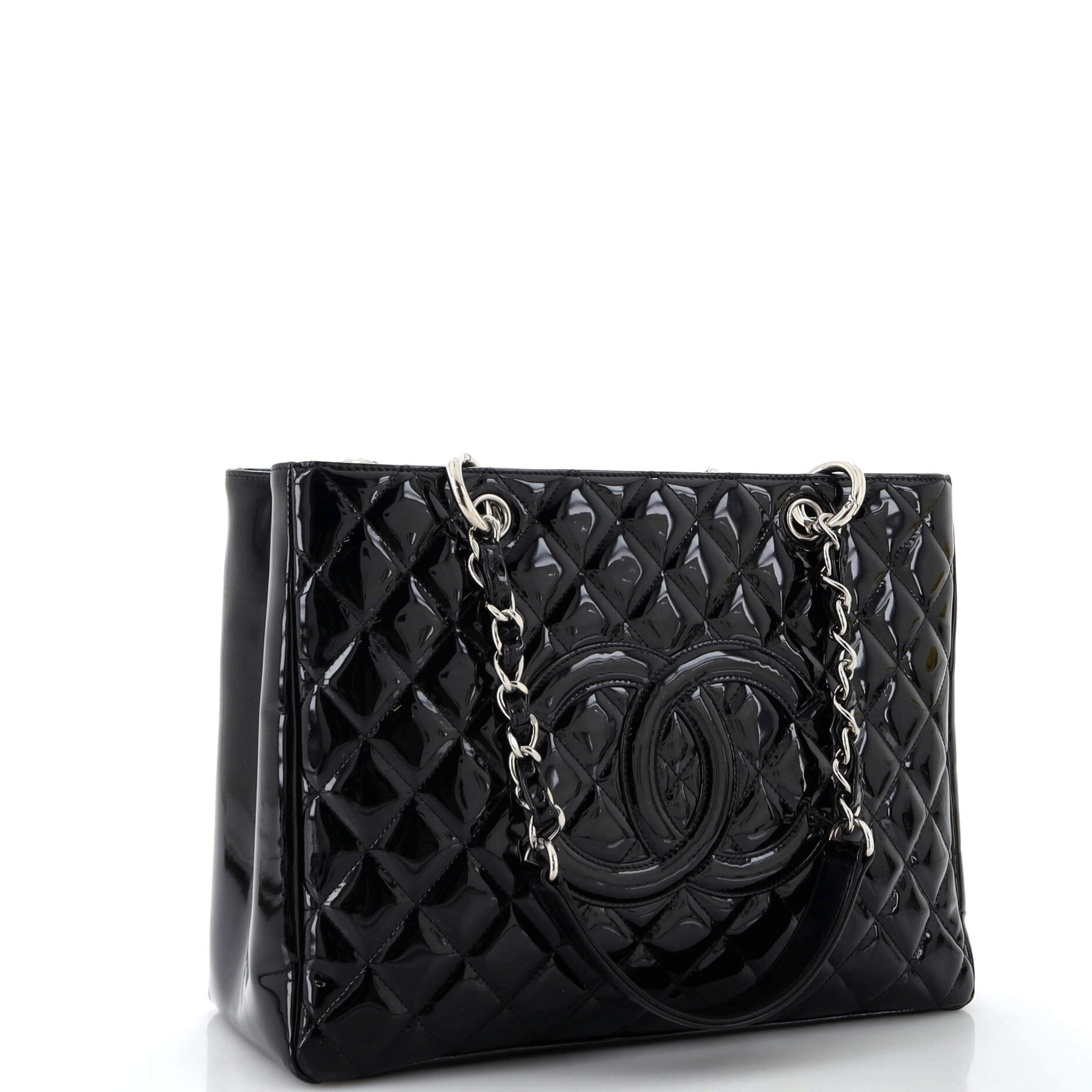 Introducing the iconic Chanel Grand Shopping Tote in Quilted Patent leather. This luxurious handbag exudes elegance and sophistication, perfect for the modern fashionista. Crafted with exquisite attention to detail, the quilted patent leather adds a touch of glamour to any outfit.