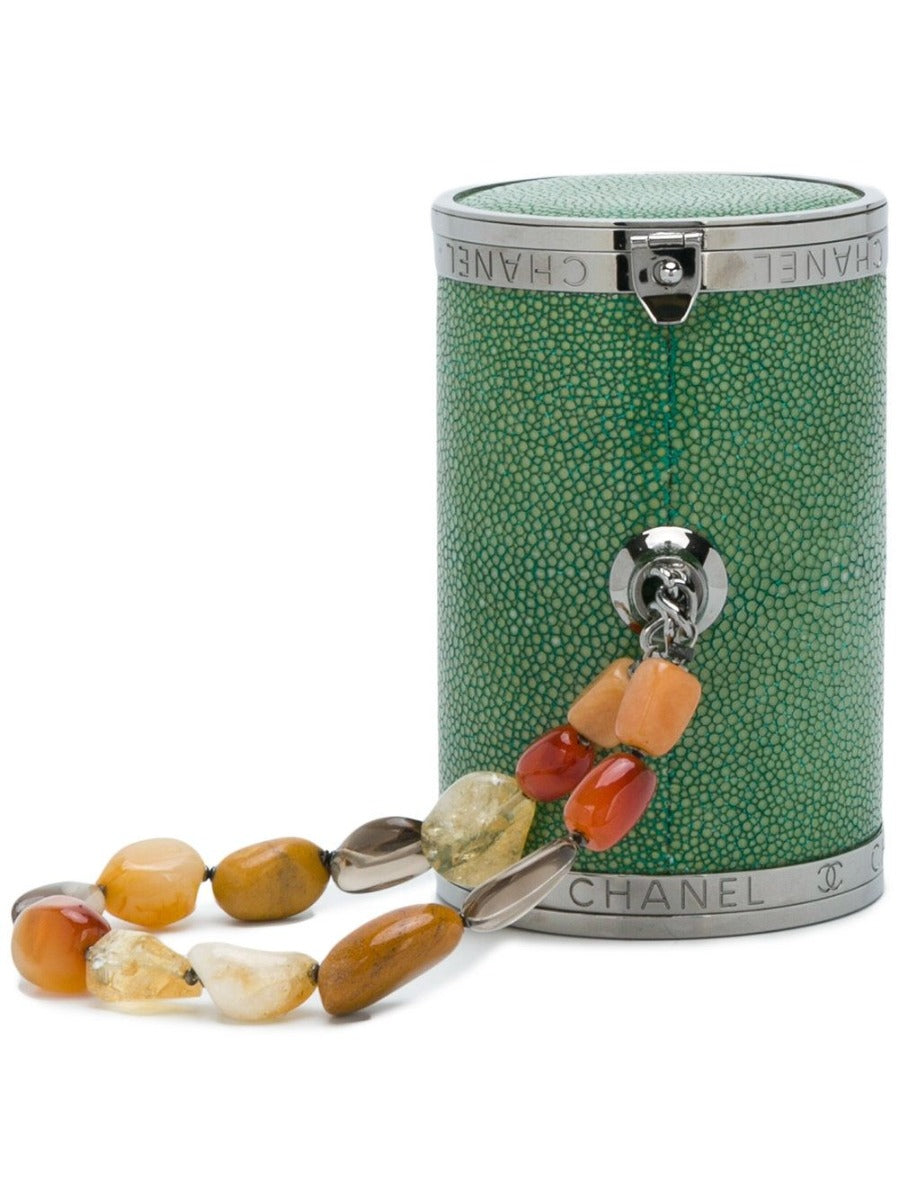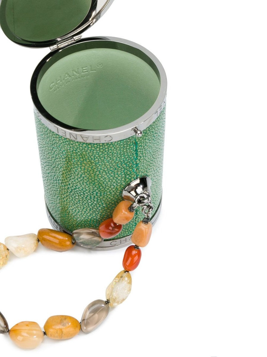 Expertly crafted in France, this unique Chanel green stingray barrel clutch features a top clasp fastening, an internal mirror, an embossed logo, an eye-catching colourful beaded hand strap and embossed iconic interlocking CCs.Colour: Green/ Silver/ brown/ ClearComposition: 100% Stingray/ Glass/ MetalDimensions: Depth: 7 cm, Handle: 15 cm, Width: 12 cm, Height: 6 cmSerial No: 8216386Condition: 9/10, Excellent Overall Condition.There is some very light surface scratching visible to the metal hardware, a small brown mark (near the fastening) and some faint indentations visible to the interior of the bag.This Chanel item has been ated by our in-house trained professionals.