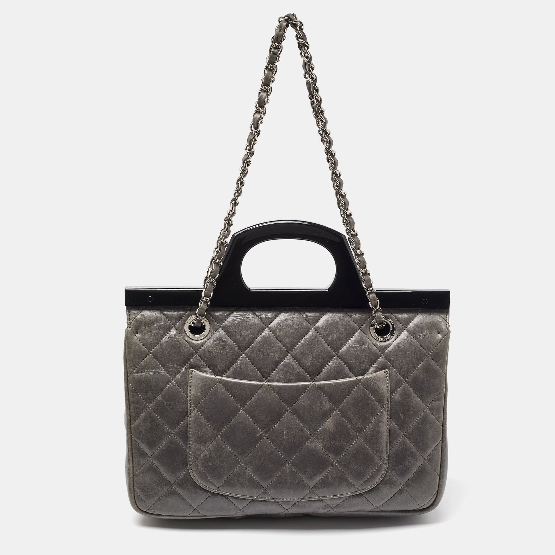 This CC Delivery bag is from Chanels Fall/Winter 2014 collection. Crafted in grey leather, the piece features a quilted exterior, a black frame with handle, and an interwoven leather chain link. The signature silver tone CC logo at the flap opens to a fabric lined interior to keep all your essentials.