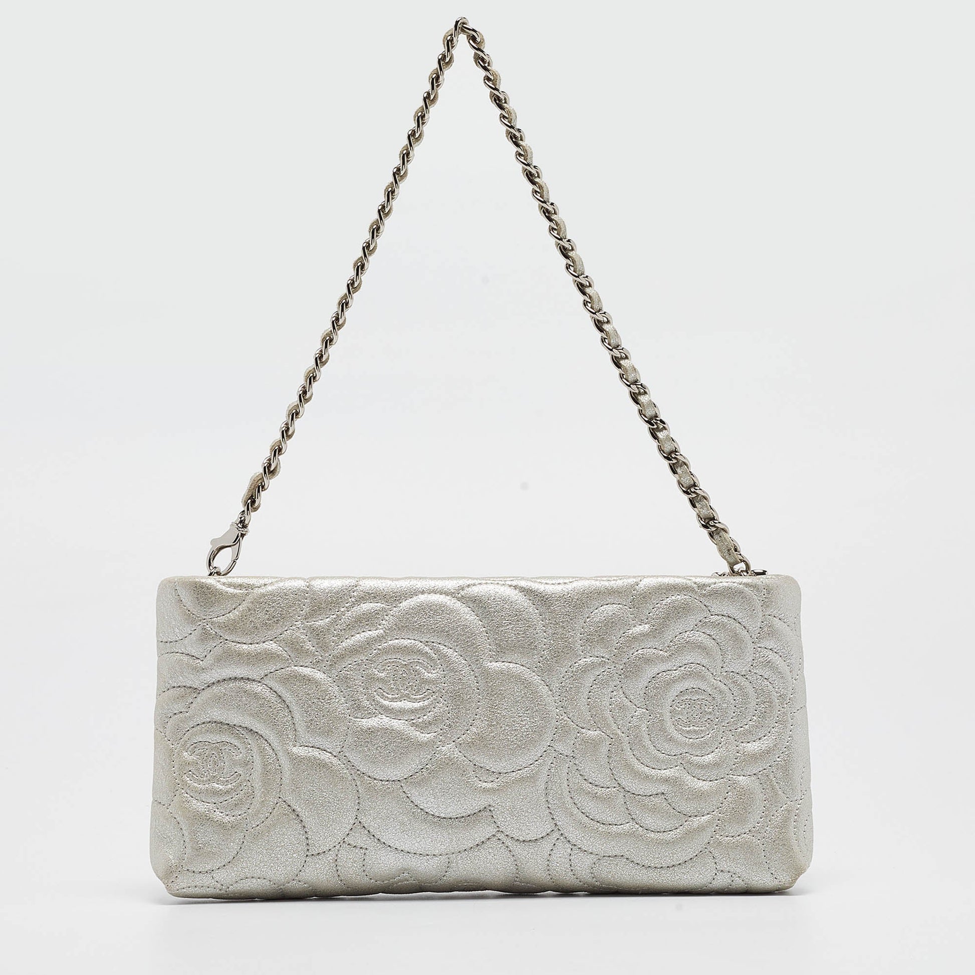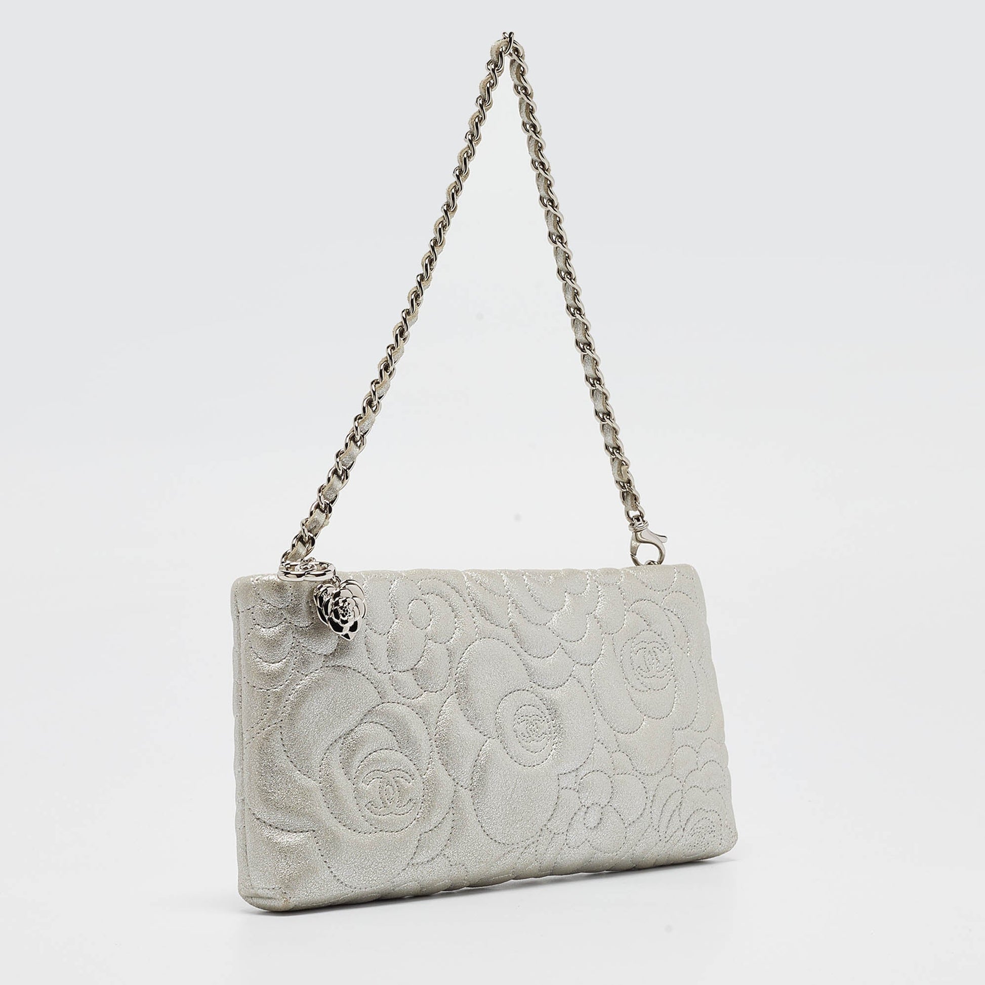 CHANEL Grey Shimmer Nubuck Leather Camelia Embossed Chain Clutch