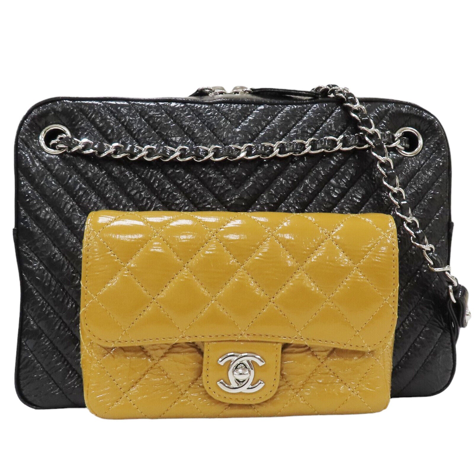 Elevate your style with the Chanel Grey Yellow Double Camera Shoulder Bag. Crafted from luxurious Chevron Quilted Patent Leather, this bag exudes sophistication and elegance. The unique color combination of grey and yellow adds a modern twist to a classic design, making it a versatile accessory for any outfit.