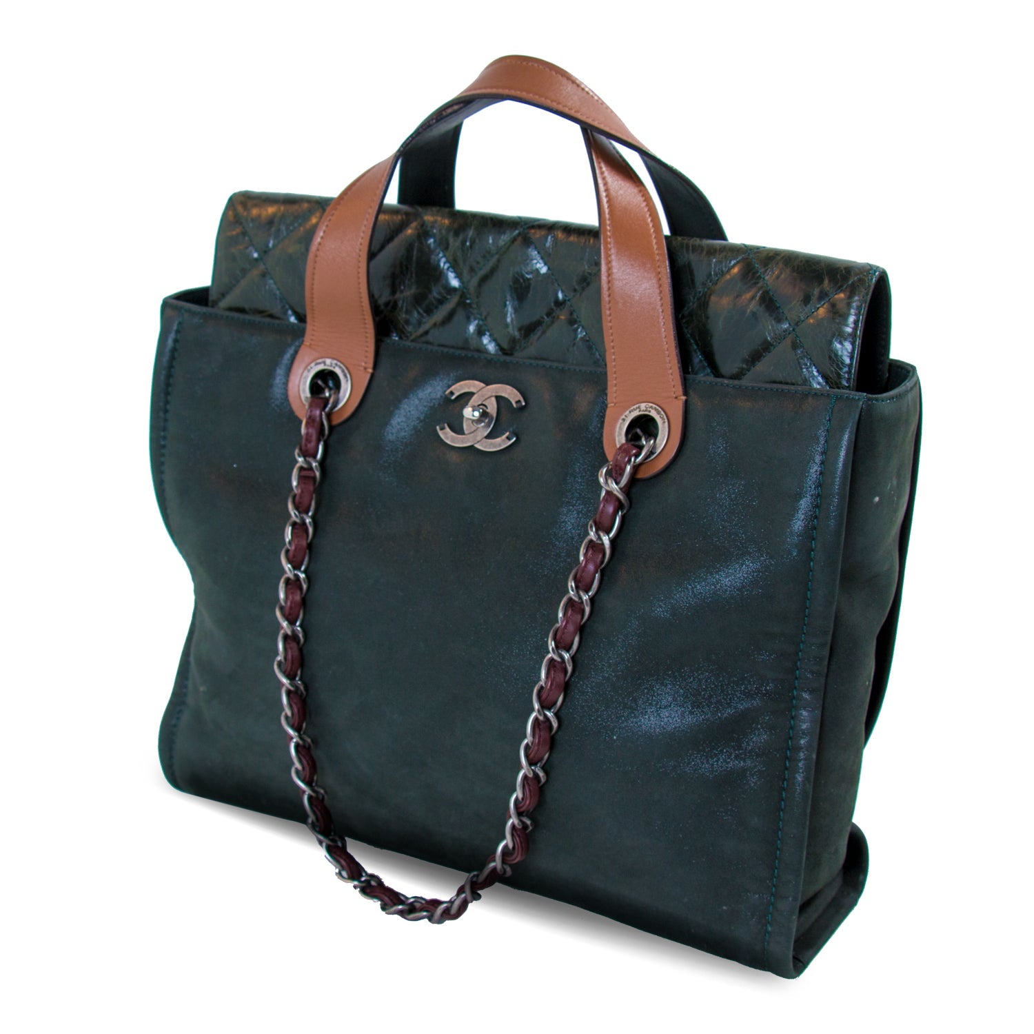 Details: Dark Green Iridescent Suede / Glazed Patent Calf Leather / Dual Brown Leather Handles / Dual Leather-Chain Shoulder Strap / Single Compartment with Dual Flat Pockets and One Zipper Pocket / Turn-Lock Closure at Flap