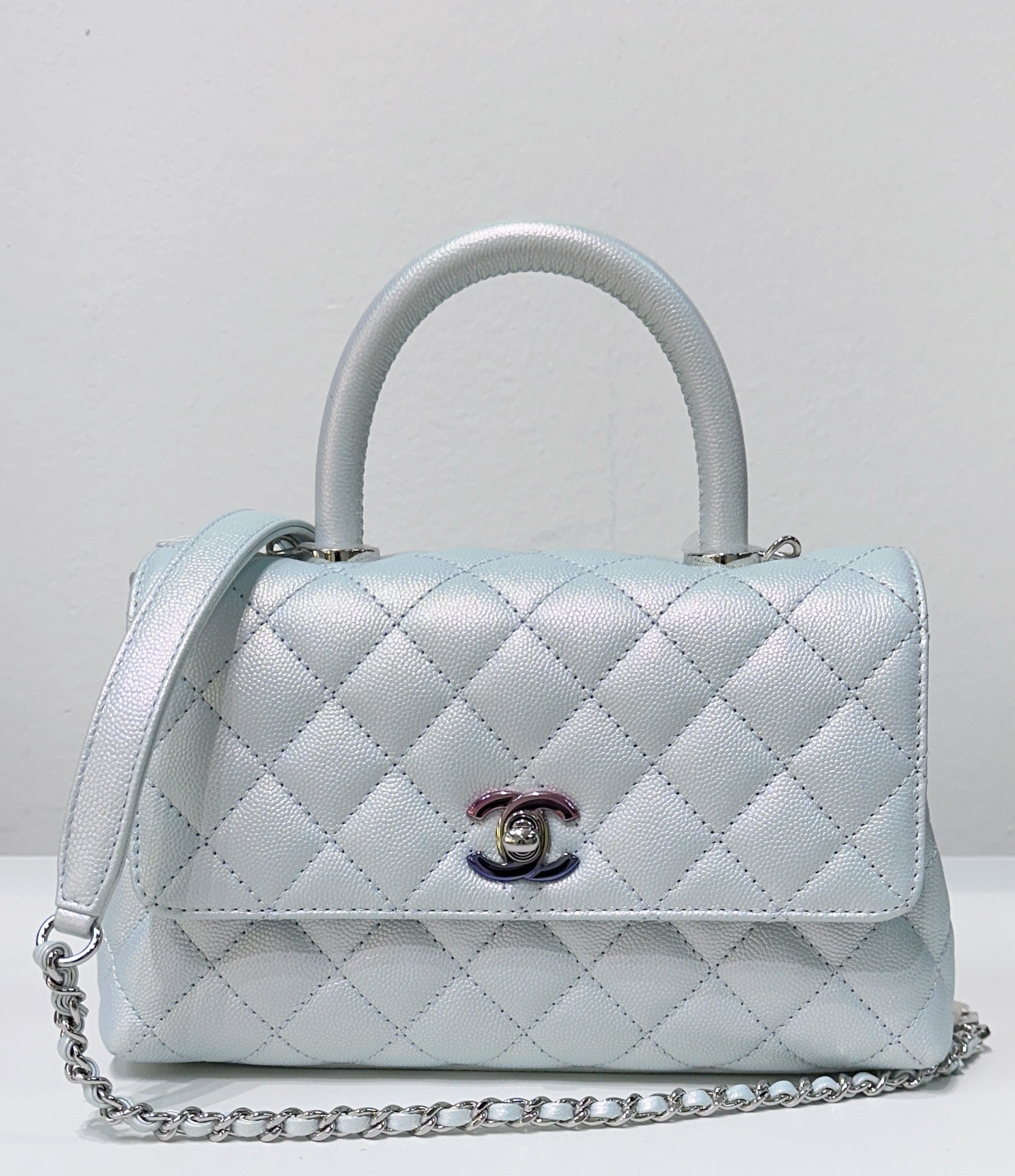 CHANEL Iridescent Caviar Quilted Mini Coco Handle Flap Light Blue