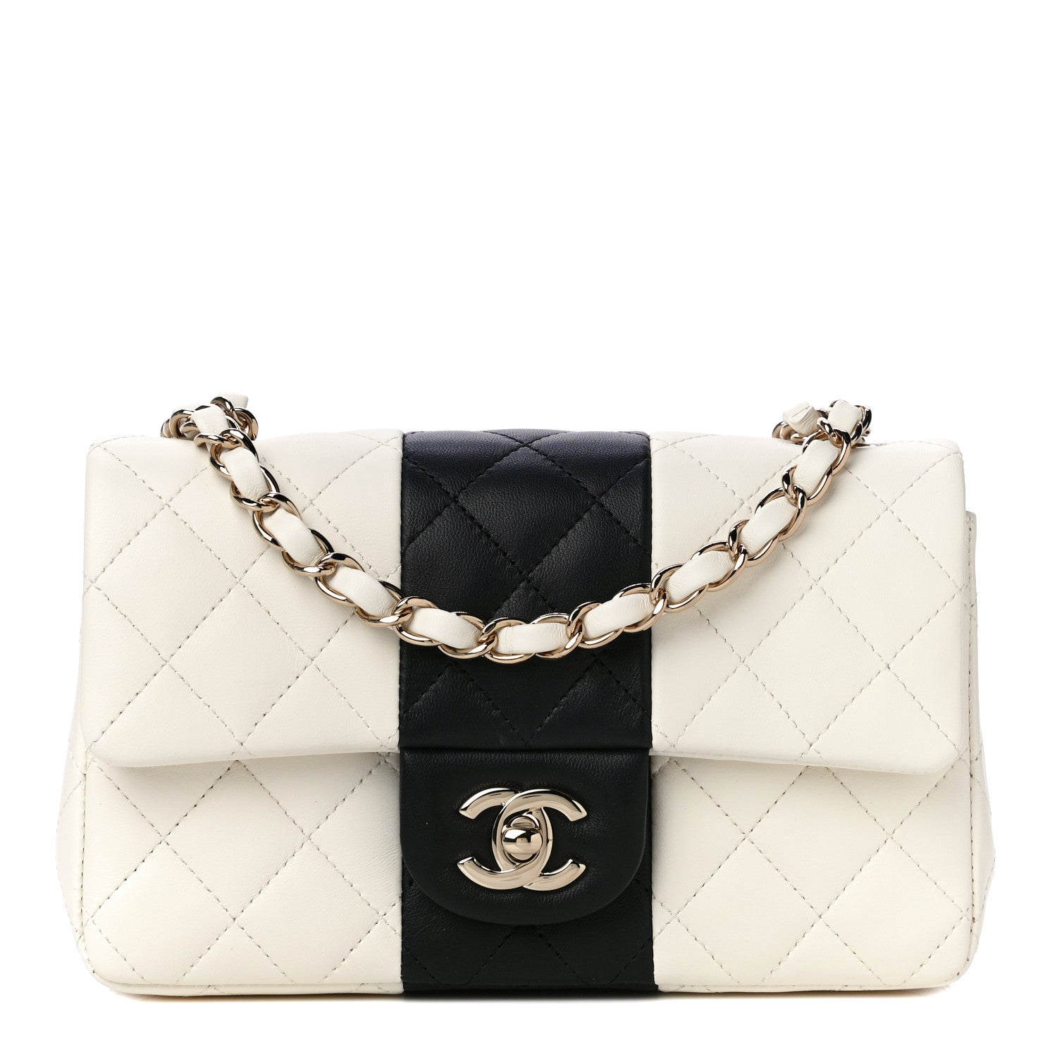 This Chanel Mini Rectangular Flap Bag is a Timeless blend of Elegance and practicality. Crafted from soft, luxurious Quilted Lambskin leather in a striking black and white design, this piece exudes classic sophistication.