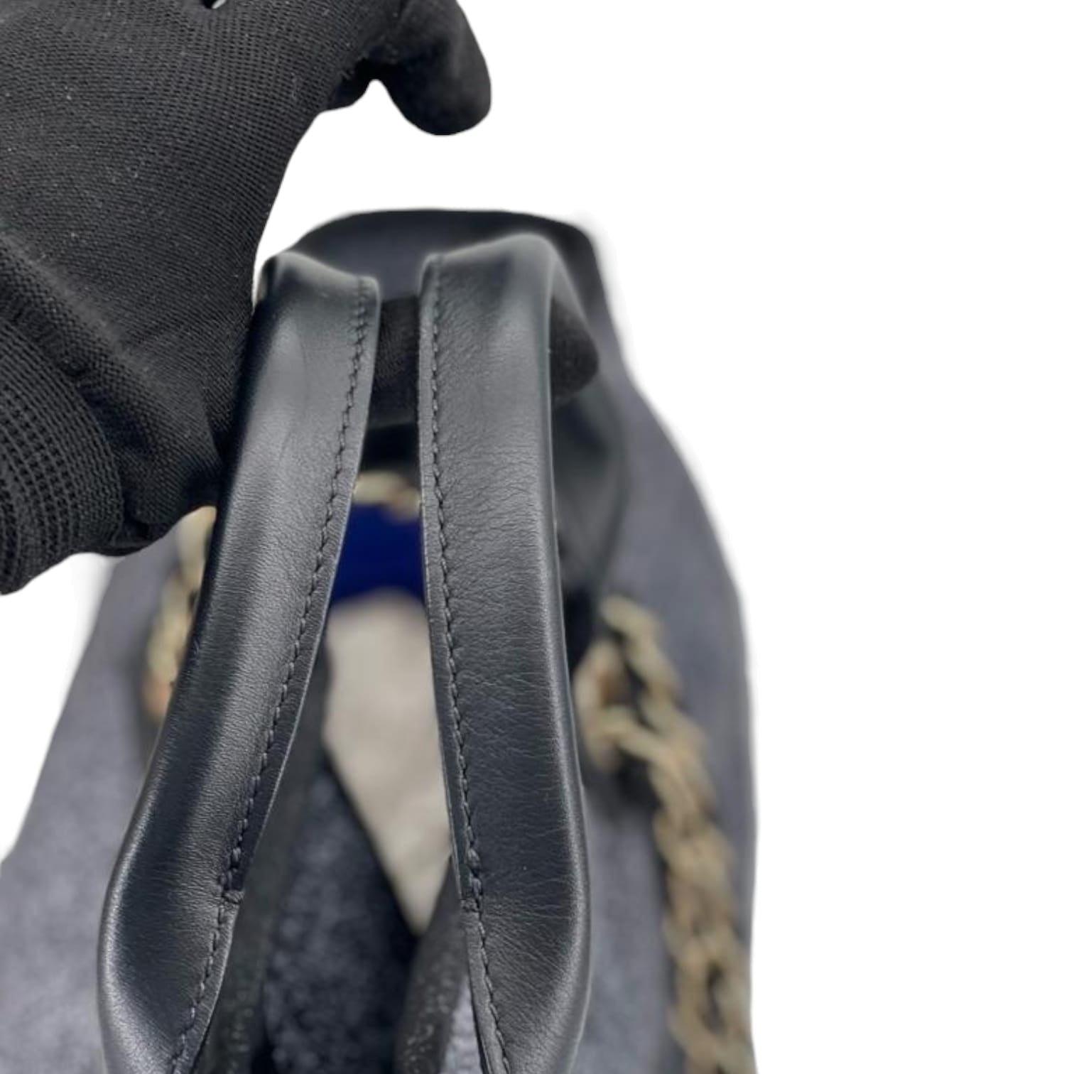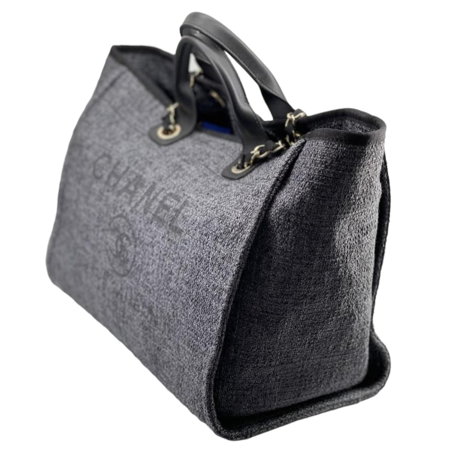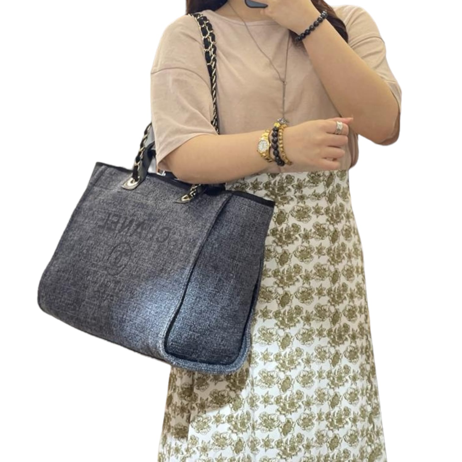 This fun and fabulous bag, makes the perfect everyday or travel tote! The Medium Chanel Deauville Tote features a durable grey fabric body with the traditional Chanel logo stitched on the front. The bag comes with short leather handles as well as chain and fabric entwined shoulder straps. This comfortable and lightweight jumbo tote will hold all your daily essentials in style.
