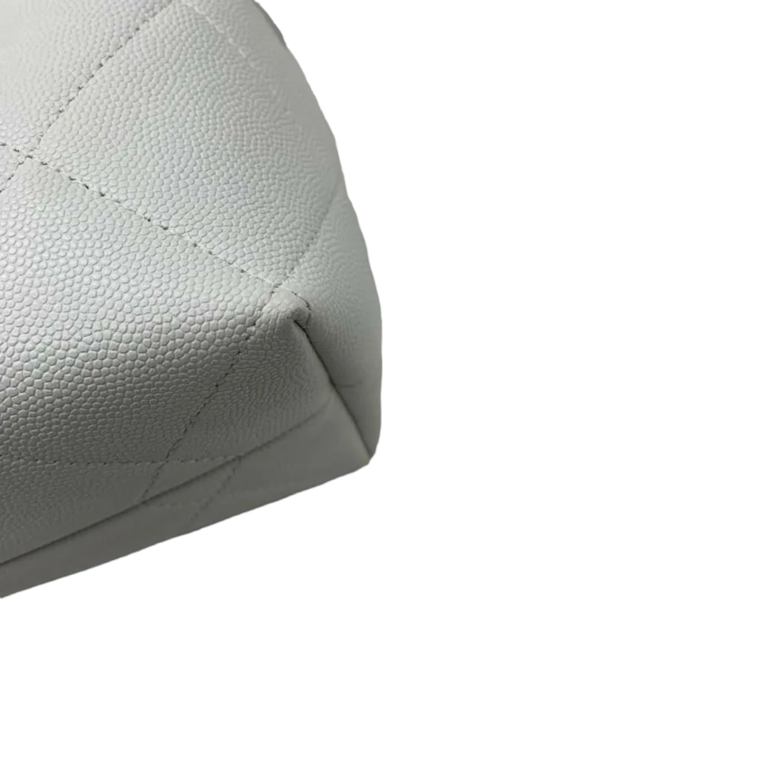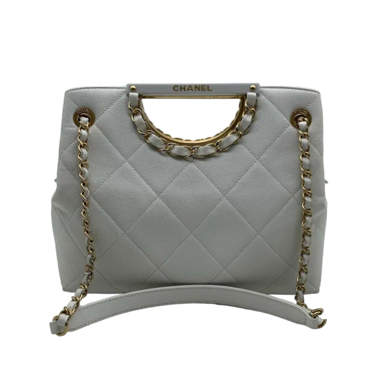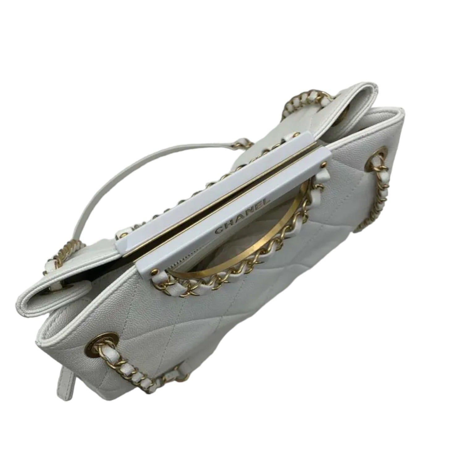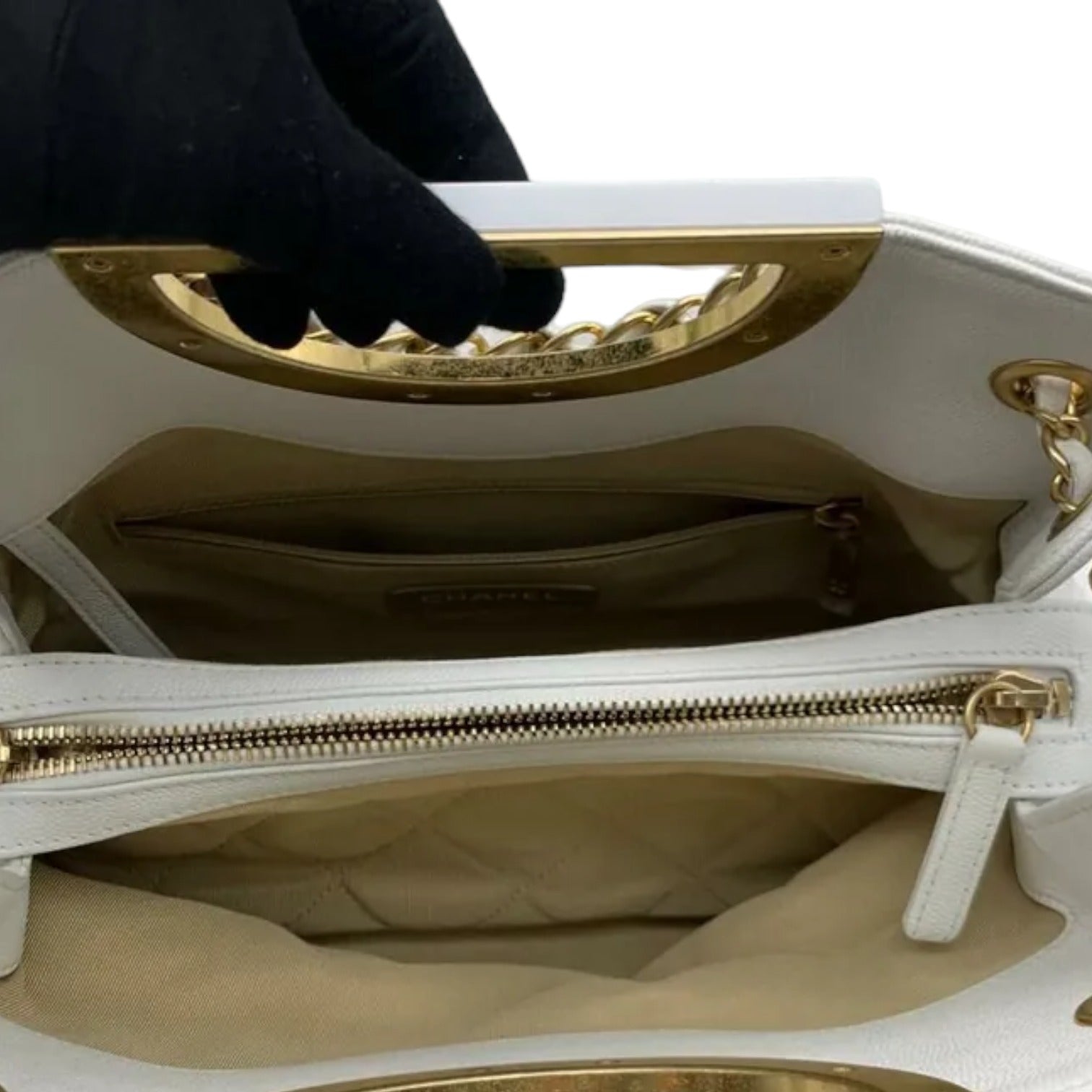 This is an Chanel Limited Edition Chain Tote Leather in White. This bag is crafted of leather in white. The bag features top handle with interlocking, chain shoulder strap with gold hardware. The bag interior is made of canvas with inner flap pocket, and a zip pocket.