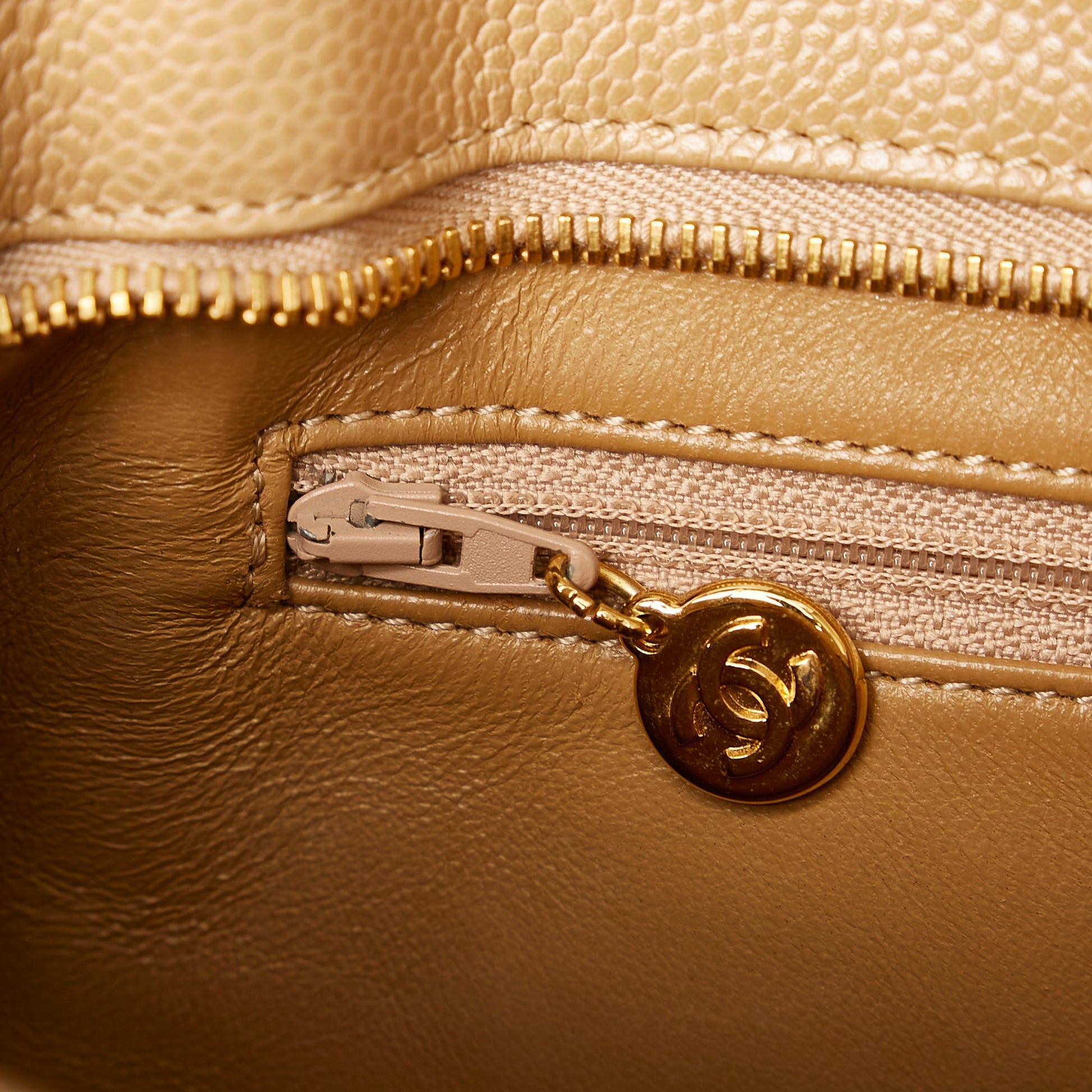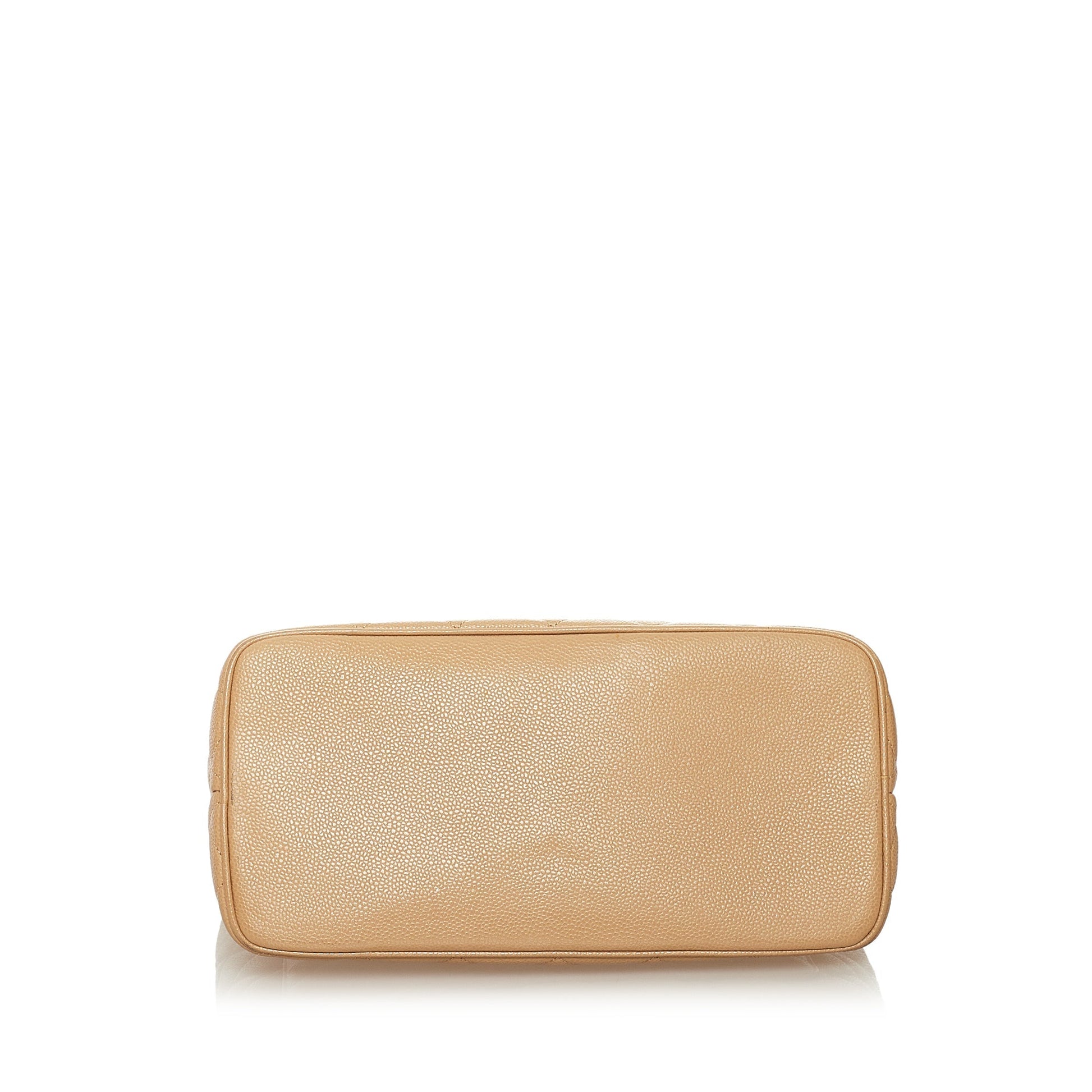 The Medallion tote bag features a quilted caviar leather body, rolled leather handles, a top zip closure, an exterior back slip pocket, and interior zip and slip pockets.