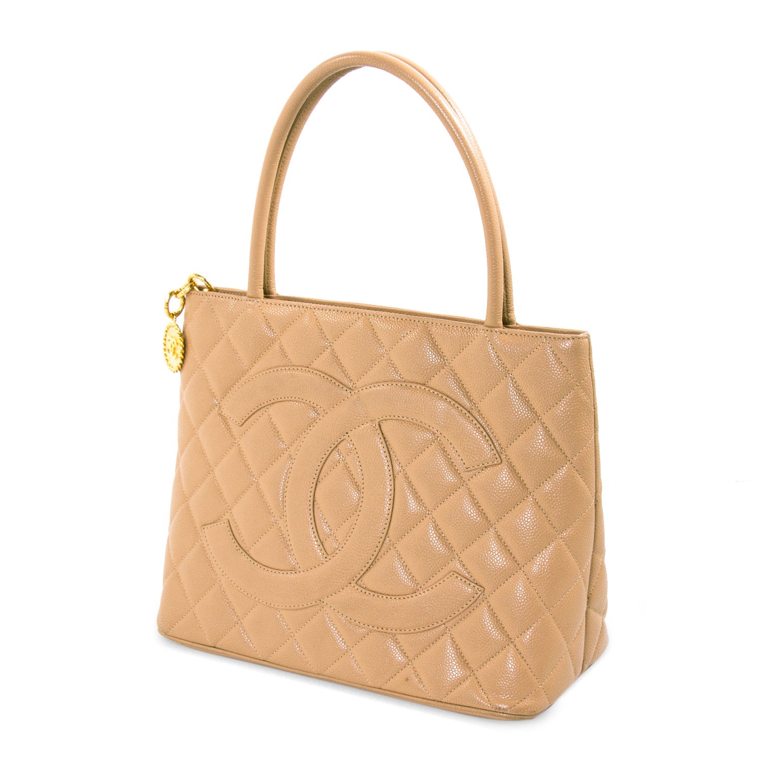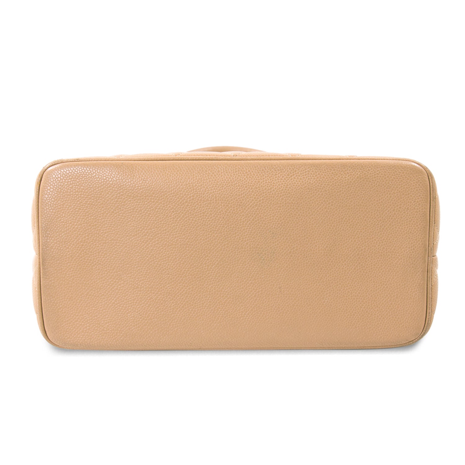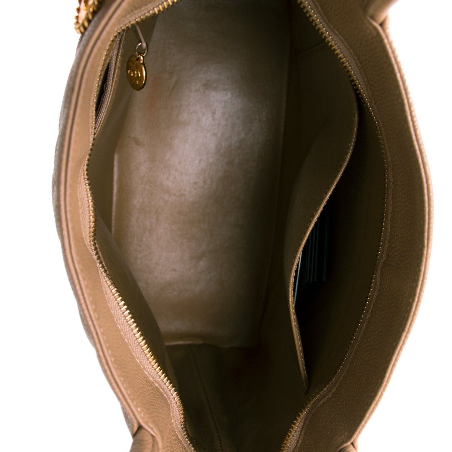 Details: Tan Caviar Leather / Gold-Tone Hardware / Dual Rolled Handles / Exterior Pocket at Back / CC Logo at Front / Leather Interior Lining / Dual Pockets At Interior One with Zipper Closure / Zipper Closure At Top
