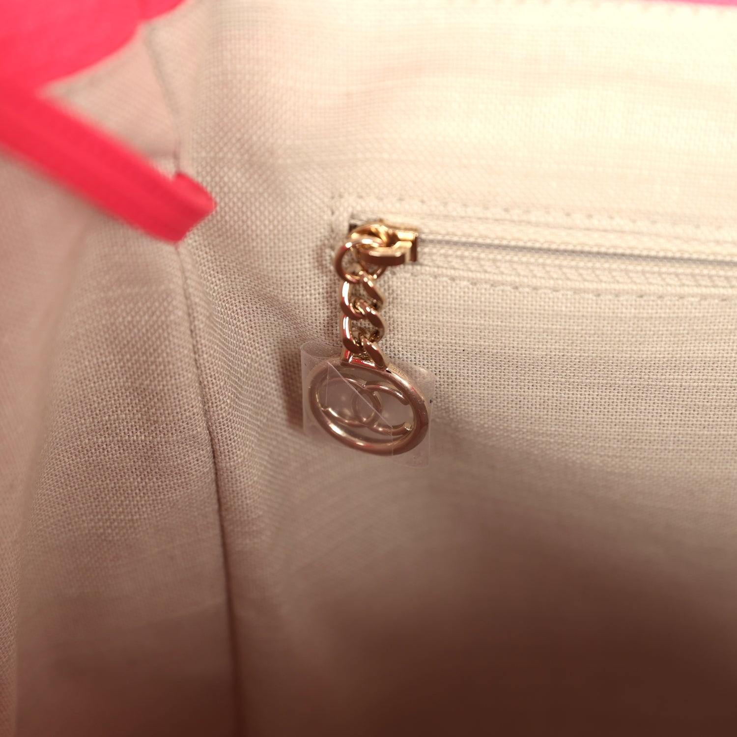 This Medium Deauville shopping tote is in hot pink canvas with light gold tone hardware, featuring a large CC signature and Chanel logo on the front, removable pink pouch and interwoven light gold tone chainlink and hot pink leather shoulder straps and two leather top handles.