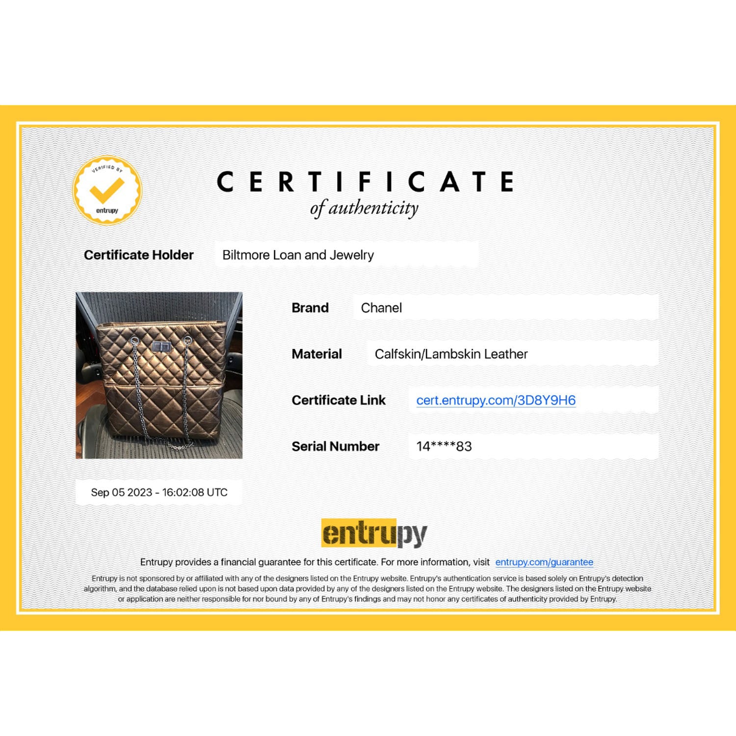 This exquisite tote is beautifully crafted of diamond quilted distressed aged calfskin leather in metallic bronze. The bag features bijoux ruthenium tightly linked chain shoulder straps and a ruthenium squared mademoiselle turn-lock. This opens to a cream fabric interior with zipper compartments and patch pockets. Est. Retail $3,200.