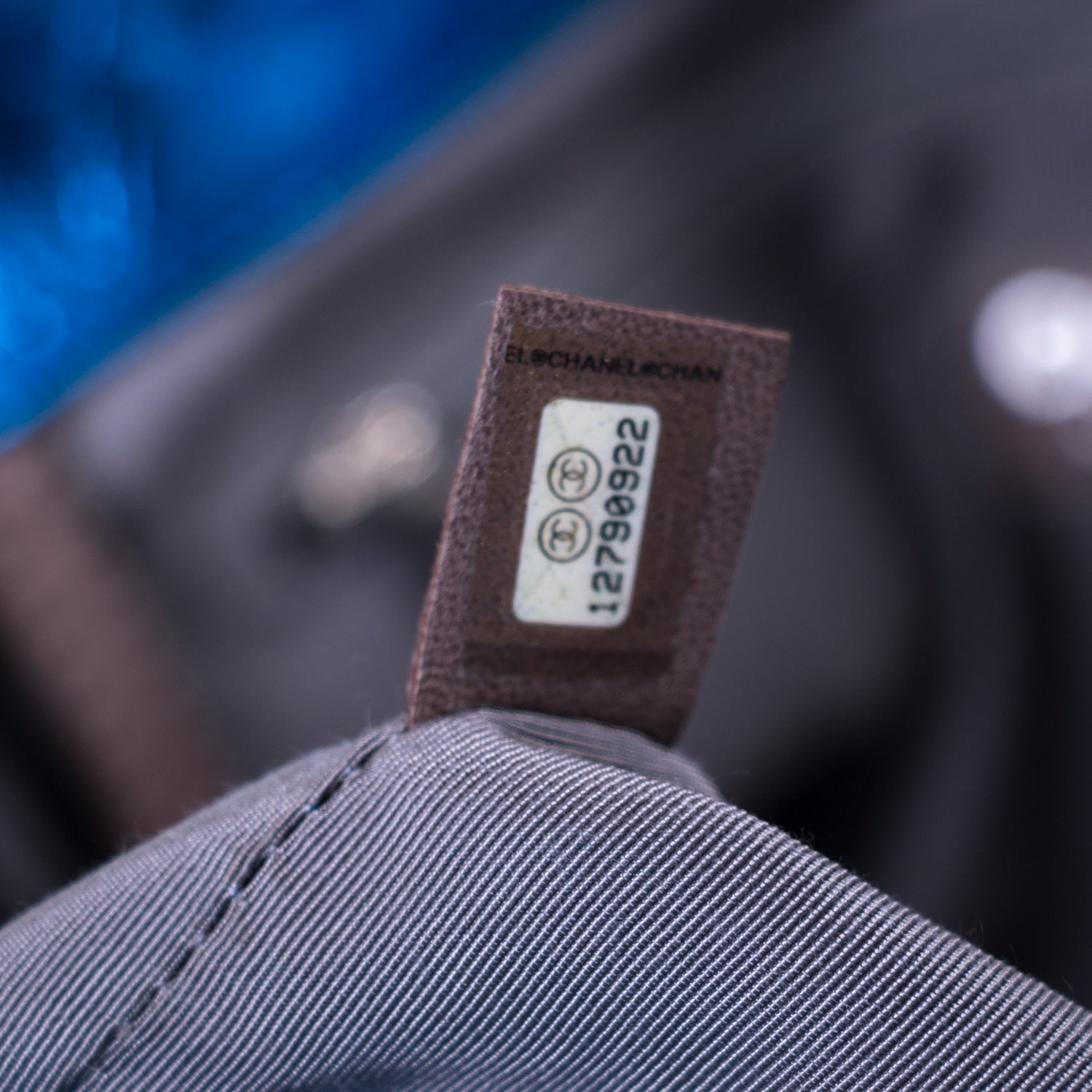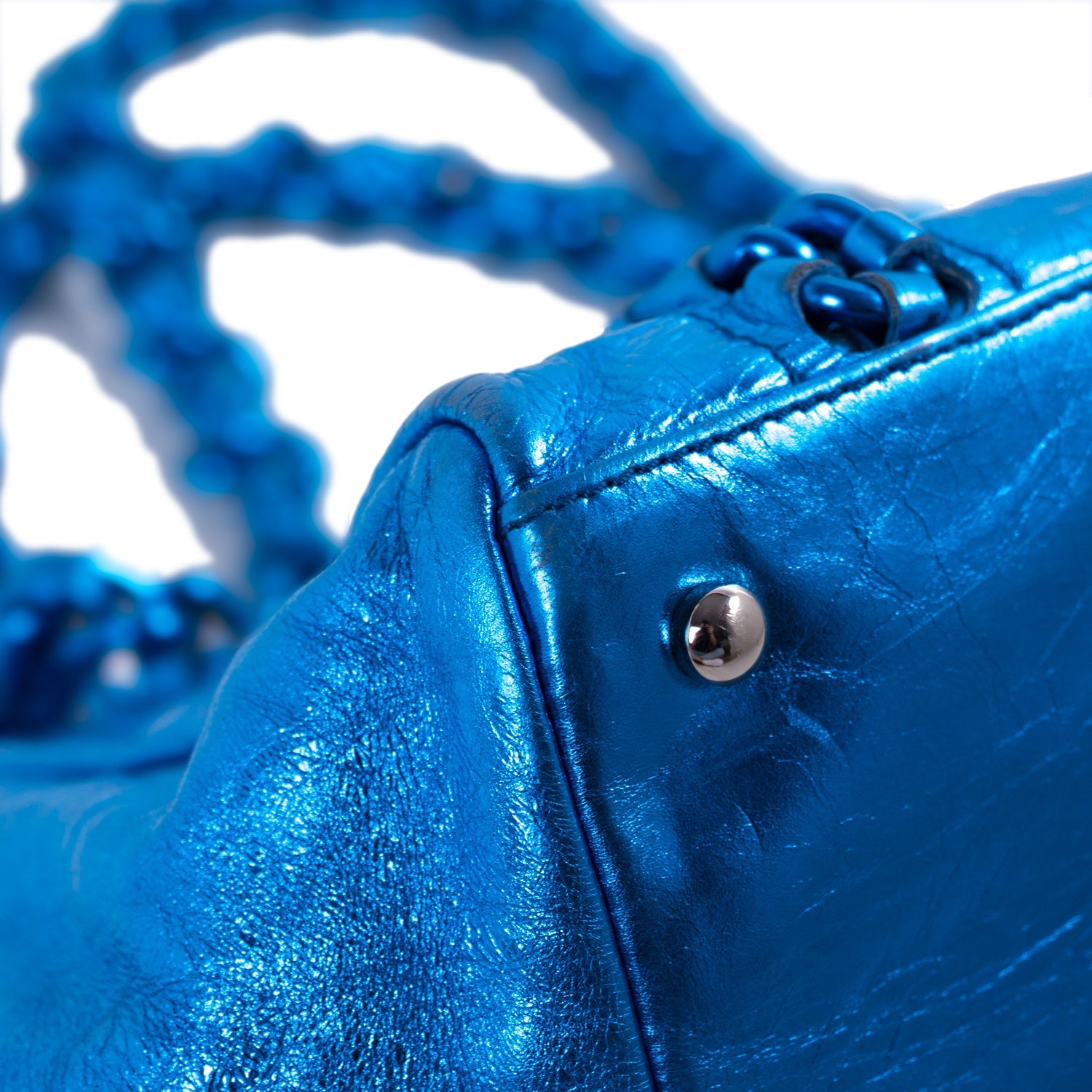 Details: Metallic Blue Leather / Metal Hardware / Chain-Link and Leather Shoulder Strap / Protective Studs at Base / Logo at Front Face / Grey Fabric Interior Lining / Dual Pockets at Interior one with Zipper Closure / Magnetic Snap Closure at Top