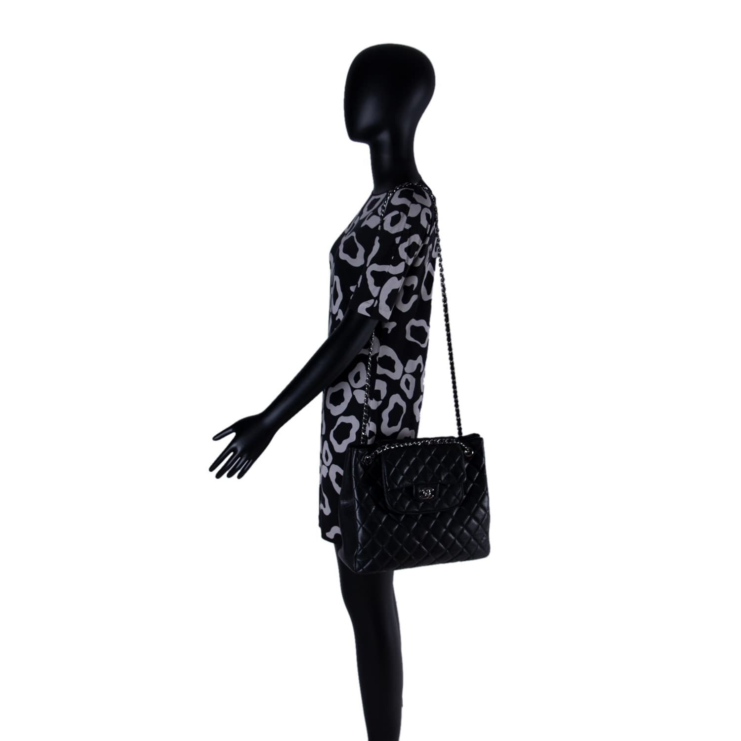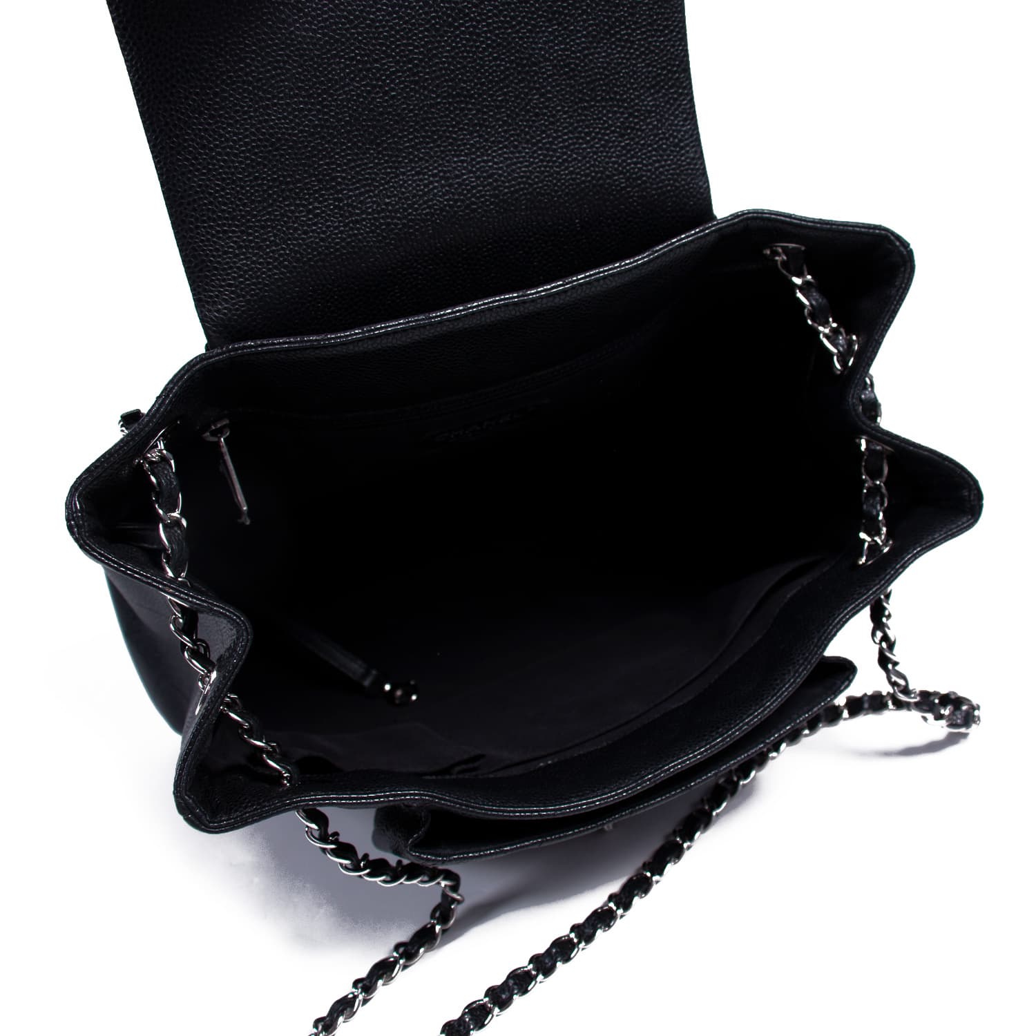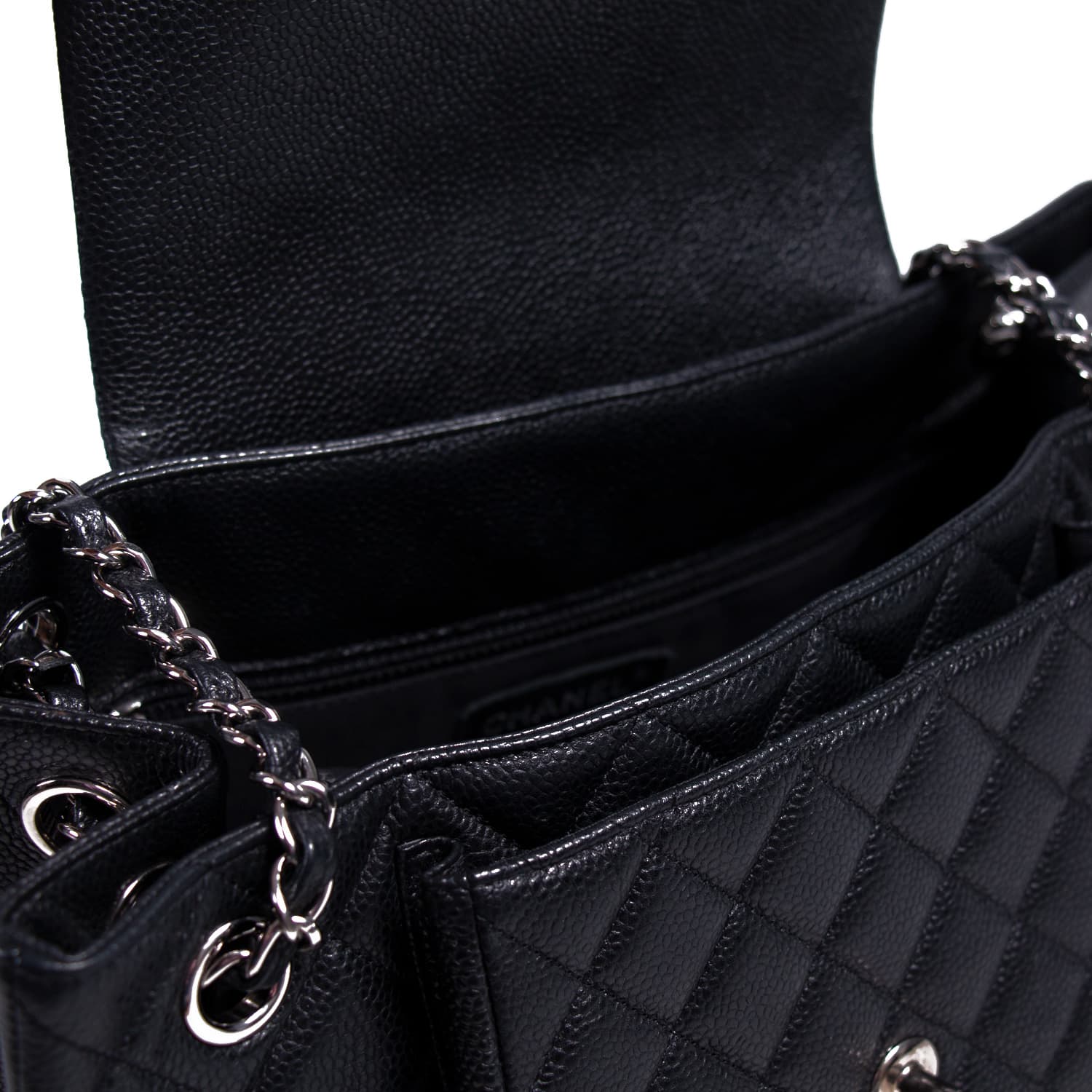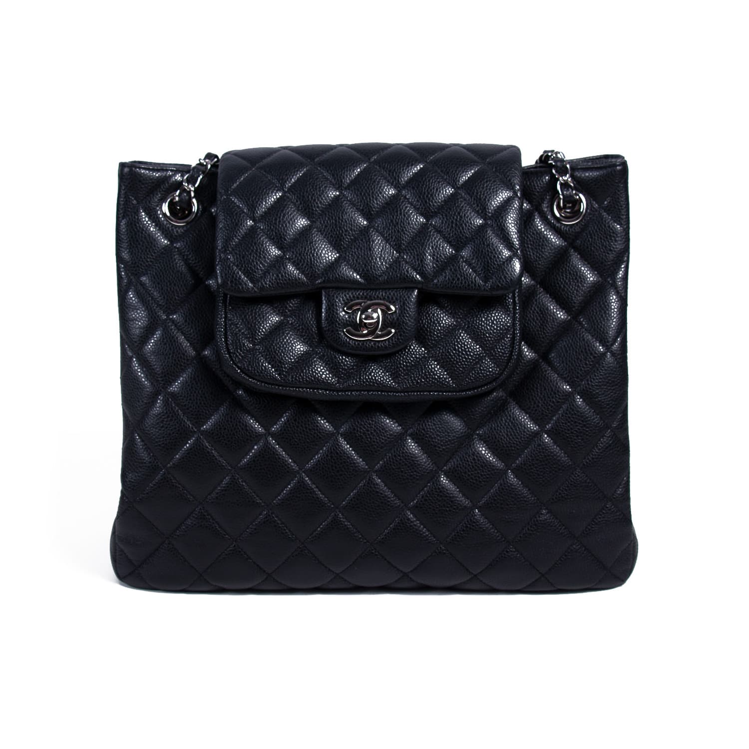 Details: Black Quilted Caviar Leather / Silver-Tone Hardware / Dual Chain-Link Leather Strap / Exterior Pocket at Back / Black Fabric Interior / Zipper and Slit Pockets / Pocket Under Front Flap / Turn Lock Closure at Top