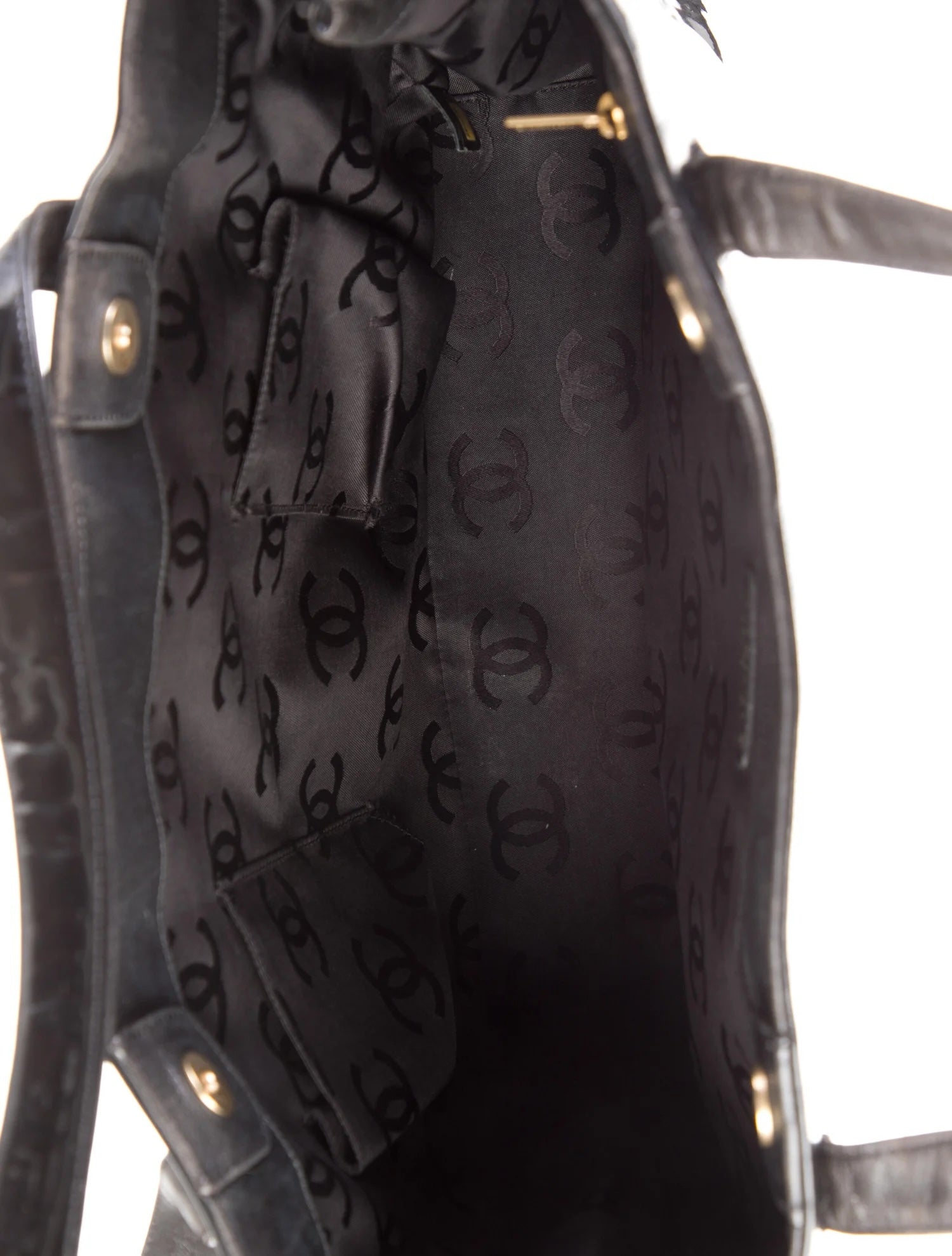 This Stylish Tote Bag is Crafted in Black patent leather and features CC logos stitched on the front and back. It has two leather top straps and opens to a black fabric interior with zipper and patch pockets.