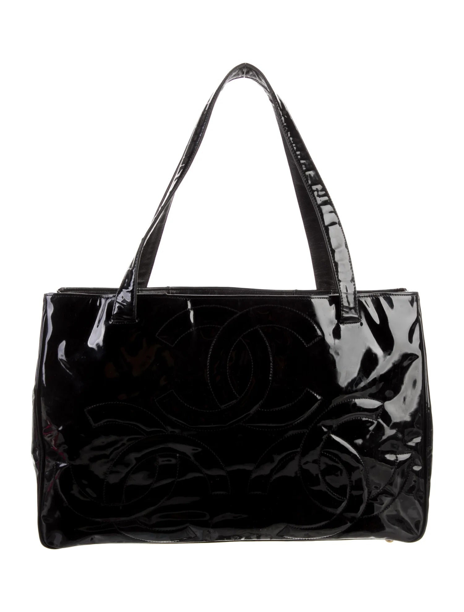 Featuring Glossy patent leather and a fun triple interlocking CC logo stitched at the front and back, this tote bag crafted in patent leather Epitomises Chanel sophistication.
