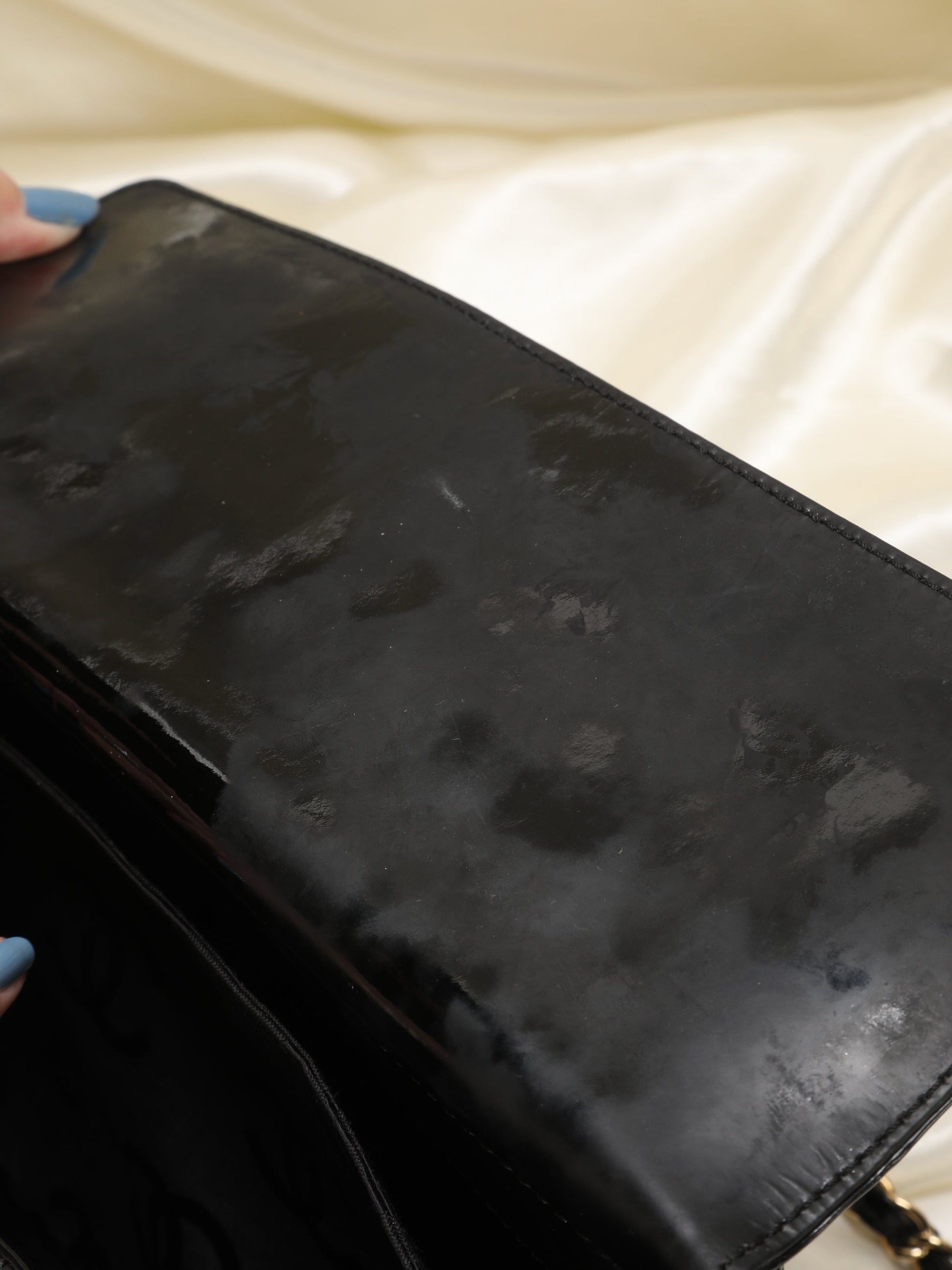 Very much like Chanel's famous chocolate bar style, this patent bag is adorned with square quilting, adding a beautiful texture! Very spacious, and perfect for an everyday bag!