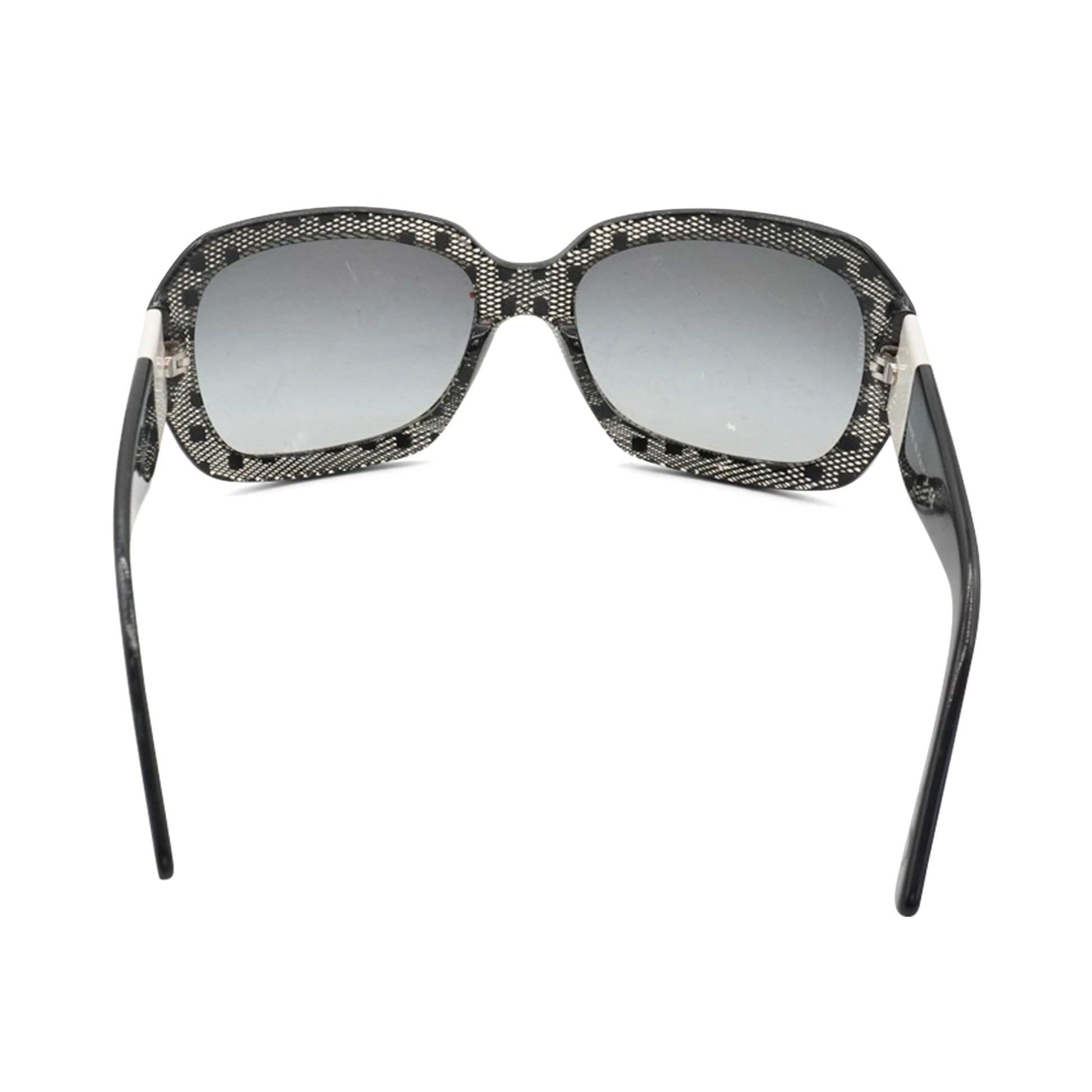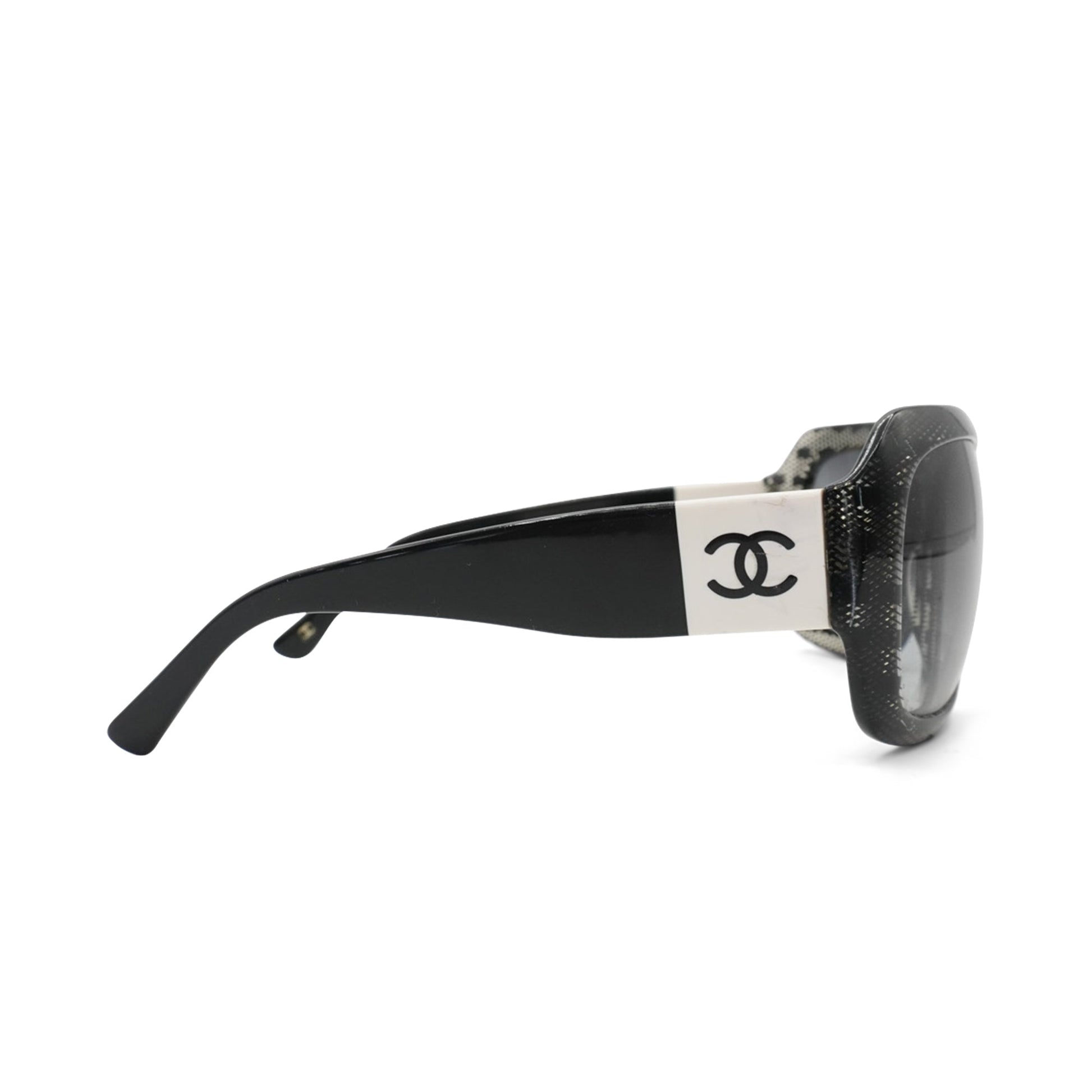Chanel oversized sunglasses with clear frames featuring black polka dot mesh print and a white CC panel on the arms.