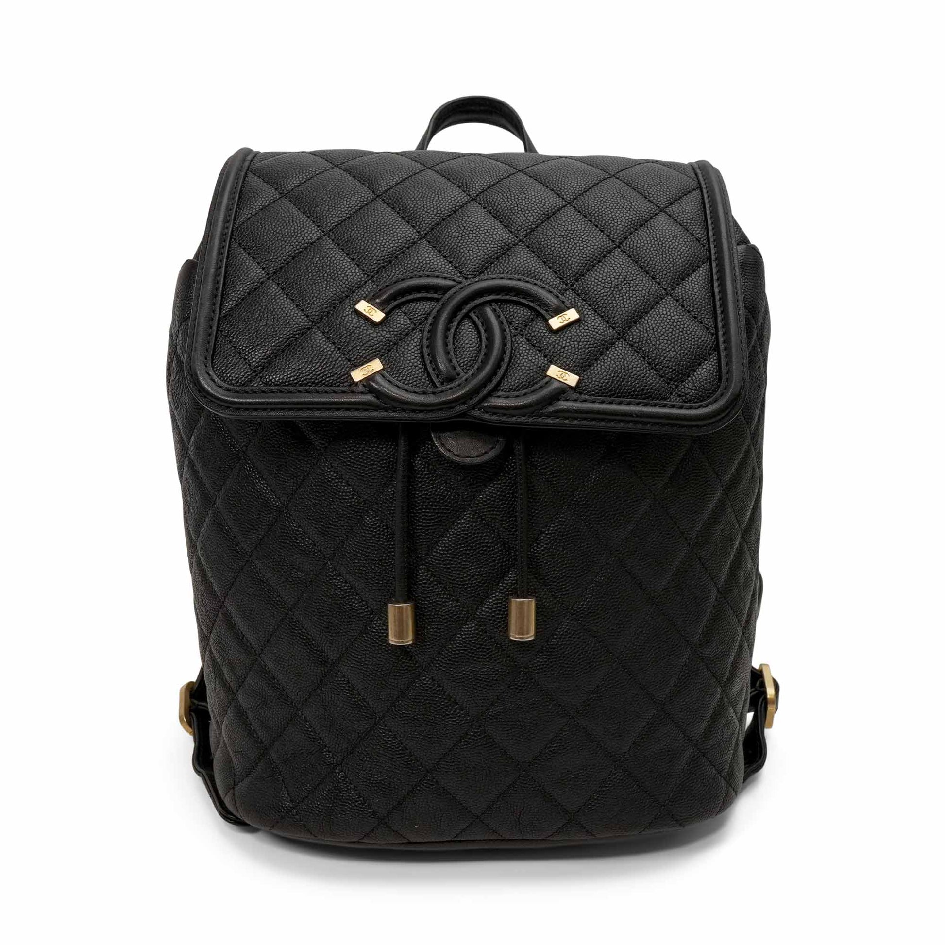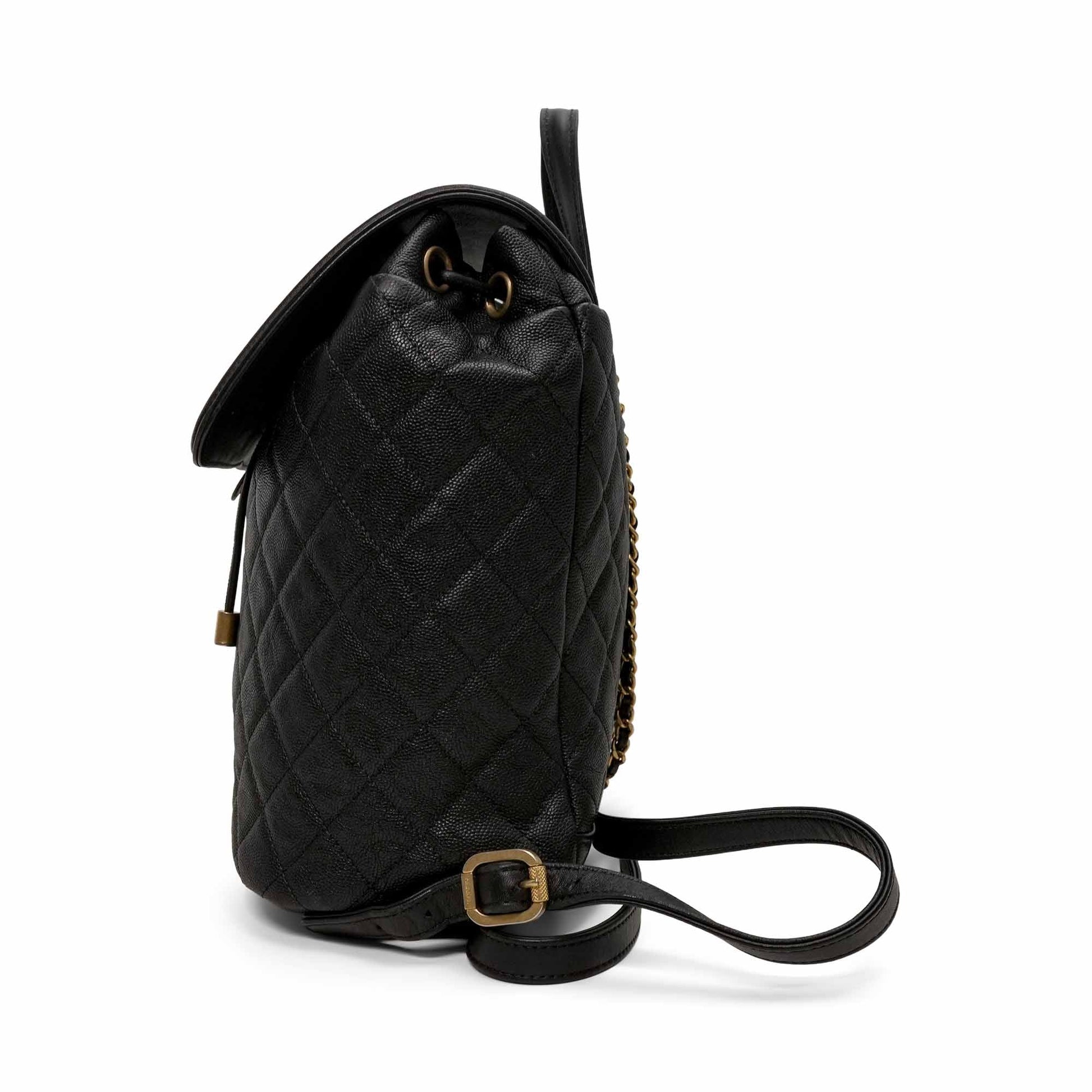 Chanel backpack in black caviar leather with double cc logo and gold engraved details, leather drawstring and magnetic snap closure. Featuring a top handle, leather and chain backpack straps in gold hardware and a hidden side zip pocket. Interior features zip pocket and keychain.