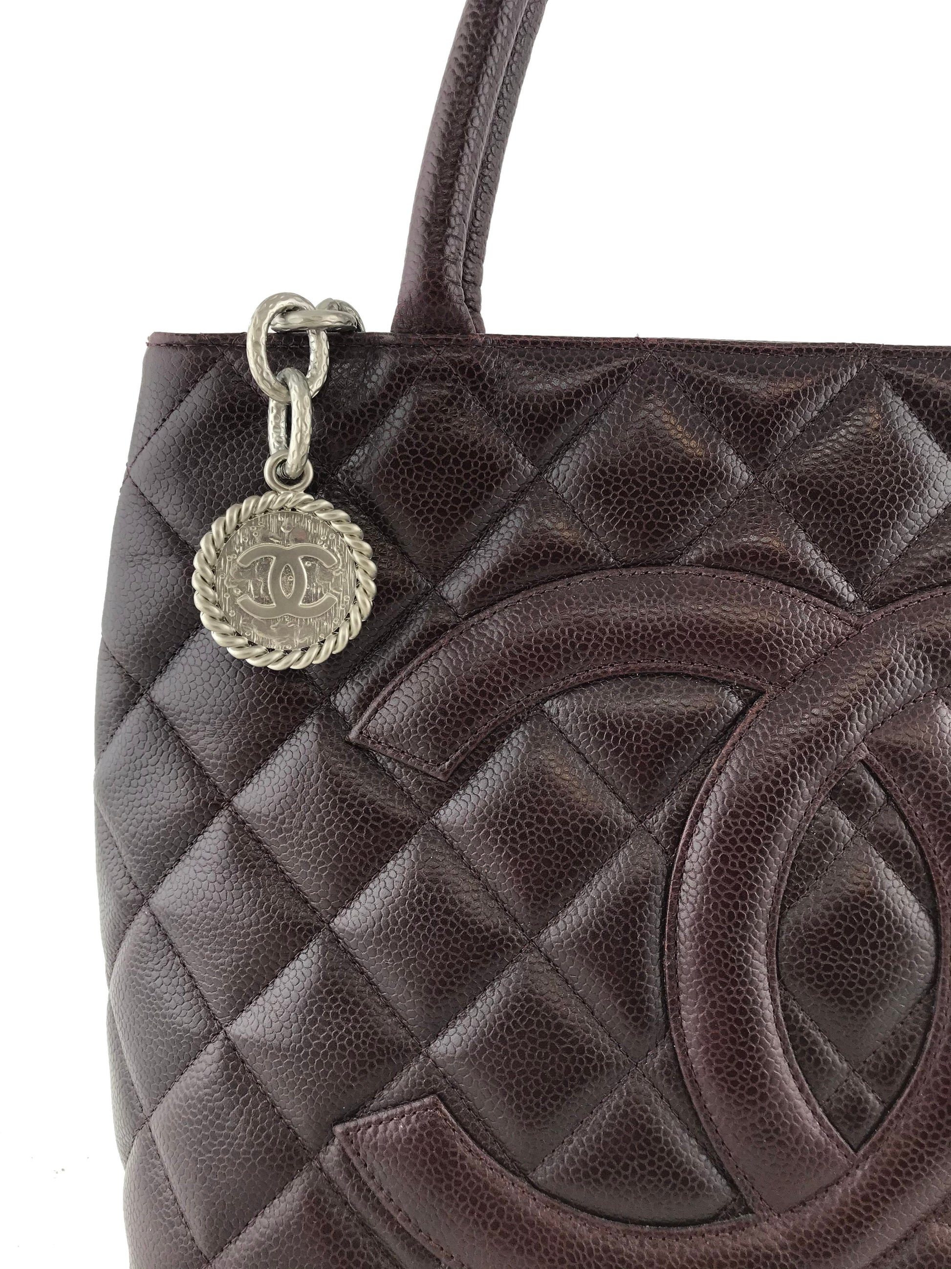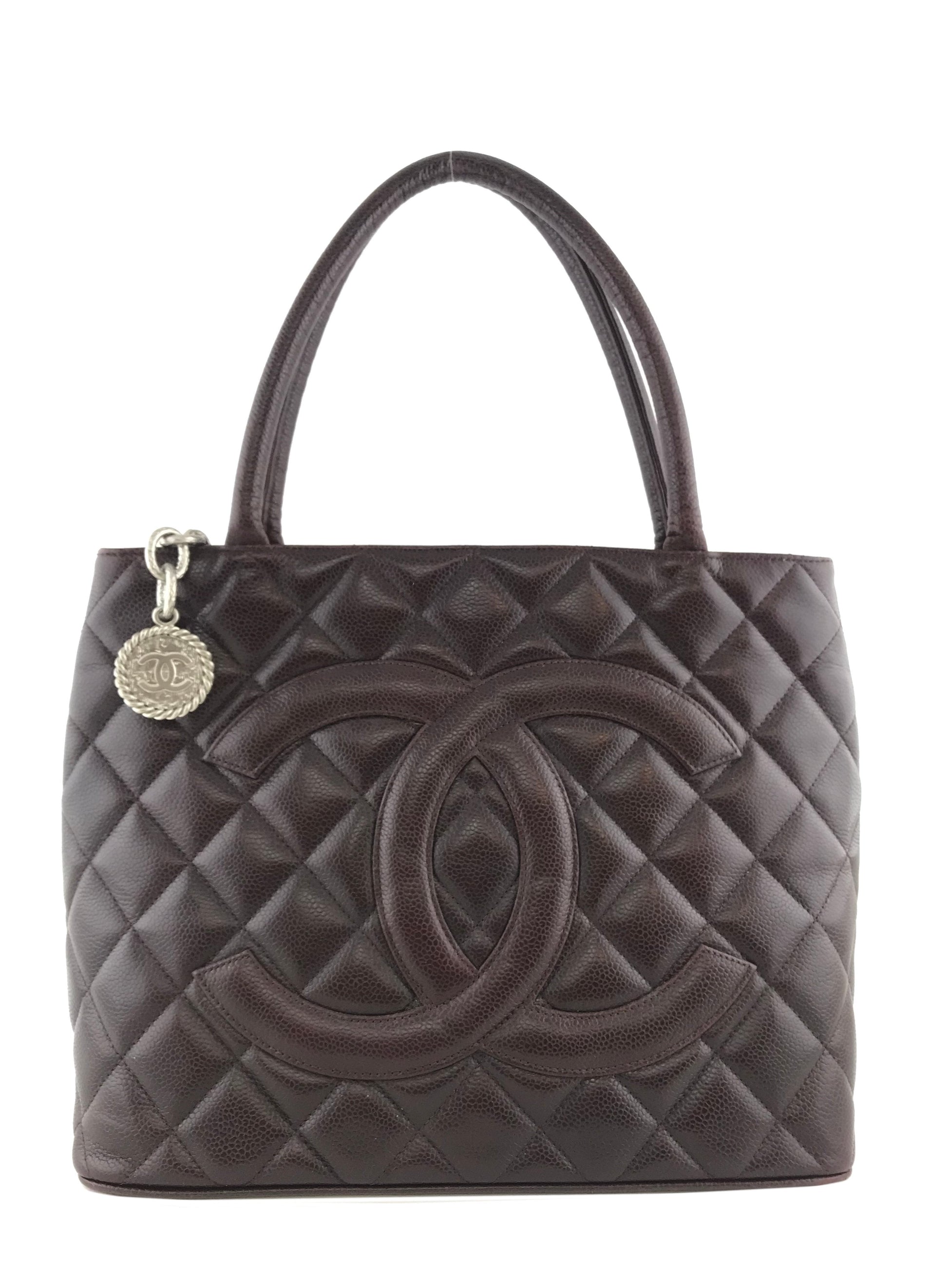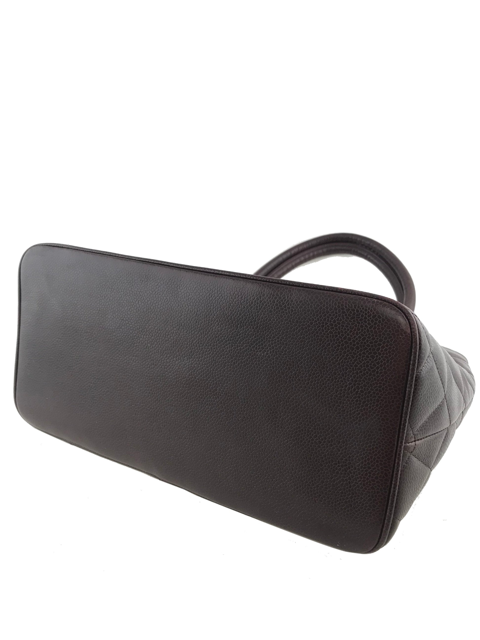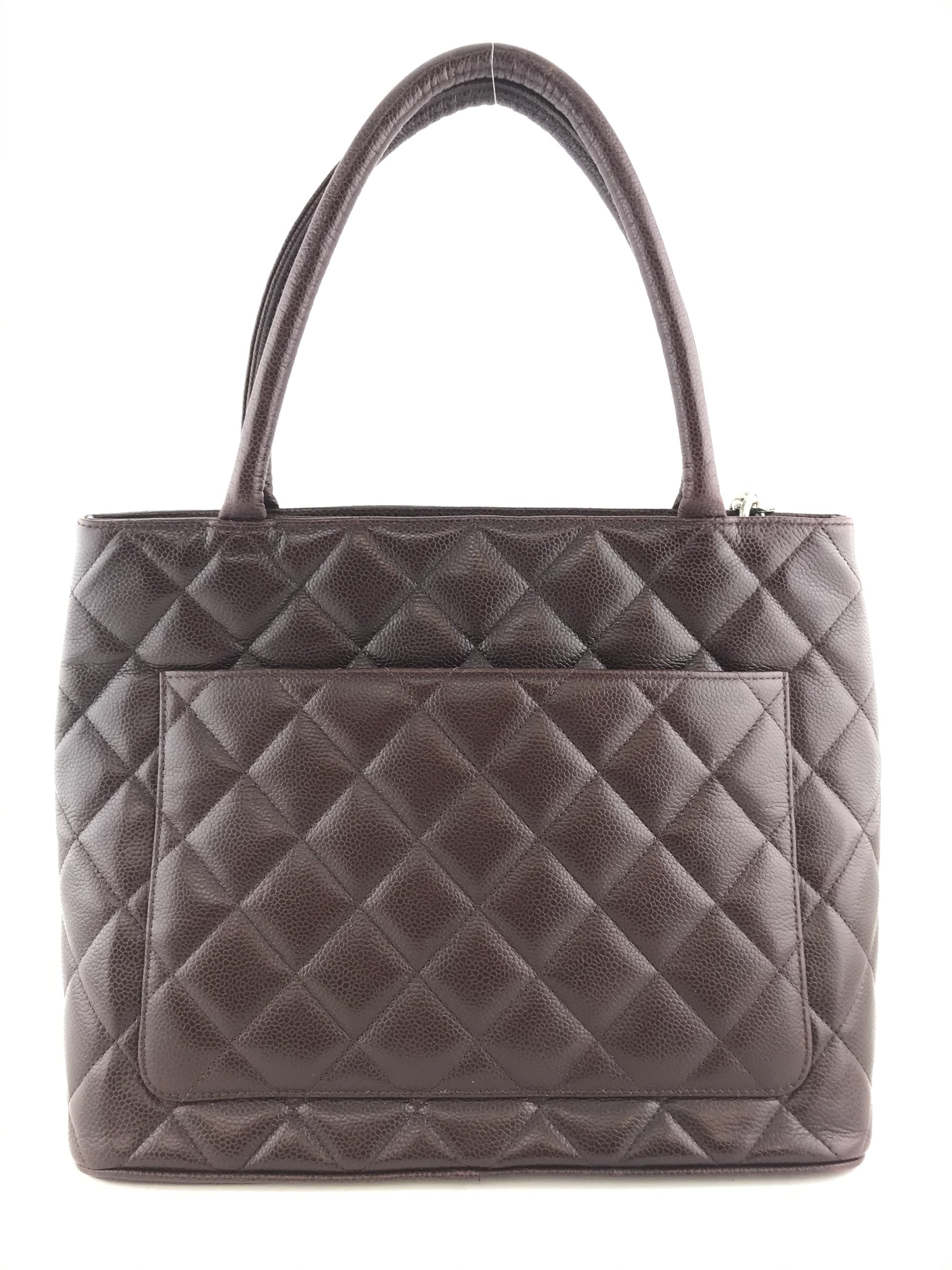 This and highly sought-after Chanel Quilted Caviar Medallion Tote Bag is a must-have in any fashionista's collection. This iconic bag is crafted from signature brown diamond quilted caviar leather and silver-tone hardware. It features a bold large 'CC' stitched logo at front, rolled tote handles and a 'CC' medallion zip closure.