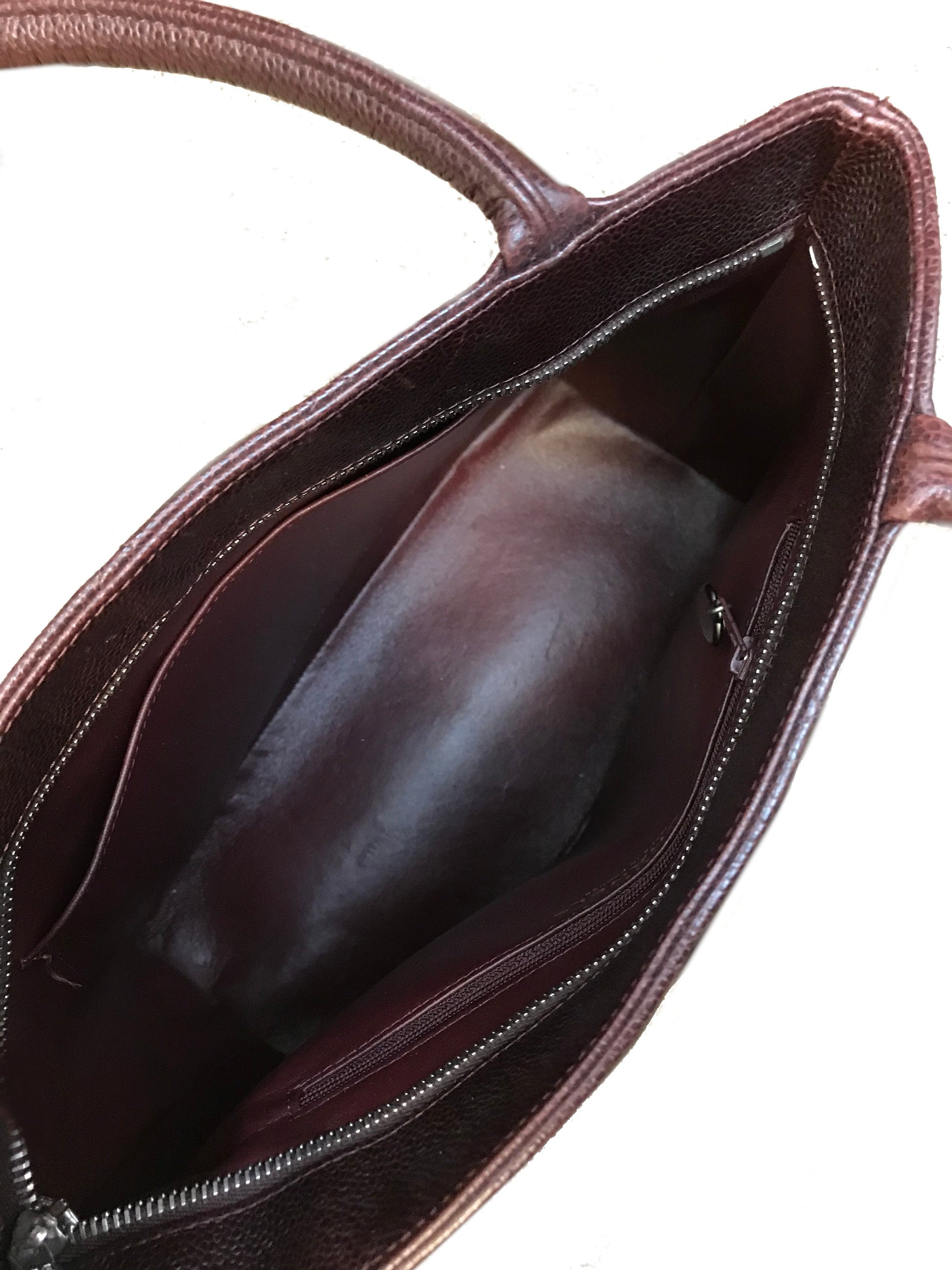 Condition: Excellent.The exterior leather is pristine and like-new throughout. The leather trim and dual tote handles are perfect. Hairline scuffing on the bottom edge corners can only be seen at close inspection. The silver-tone hardware shines bright and like-new. No visible signs of wear inside.
