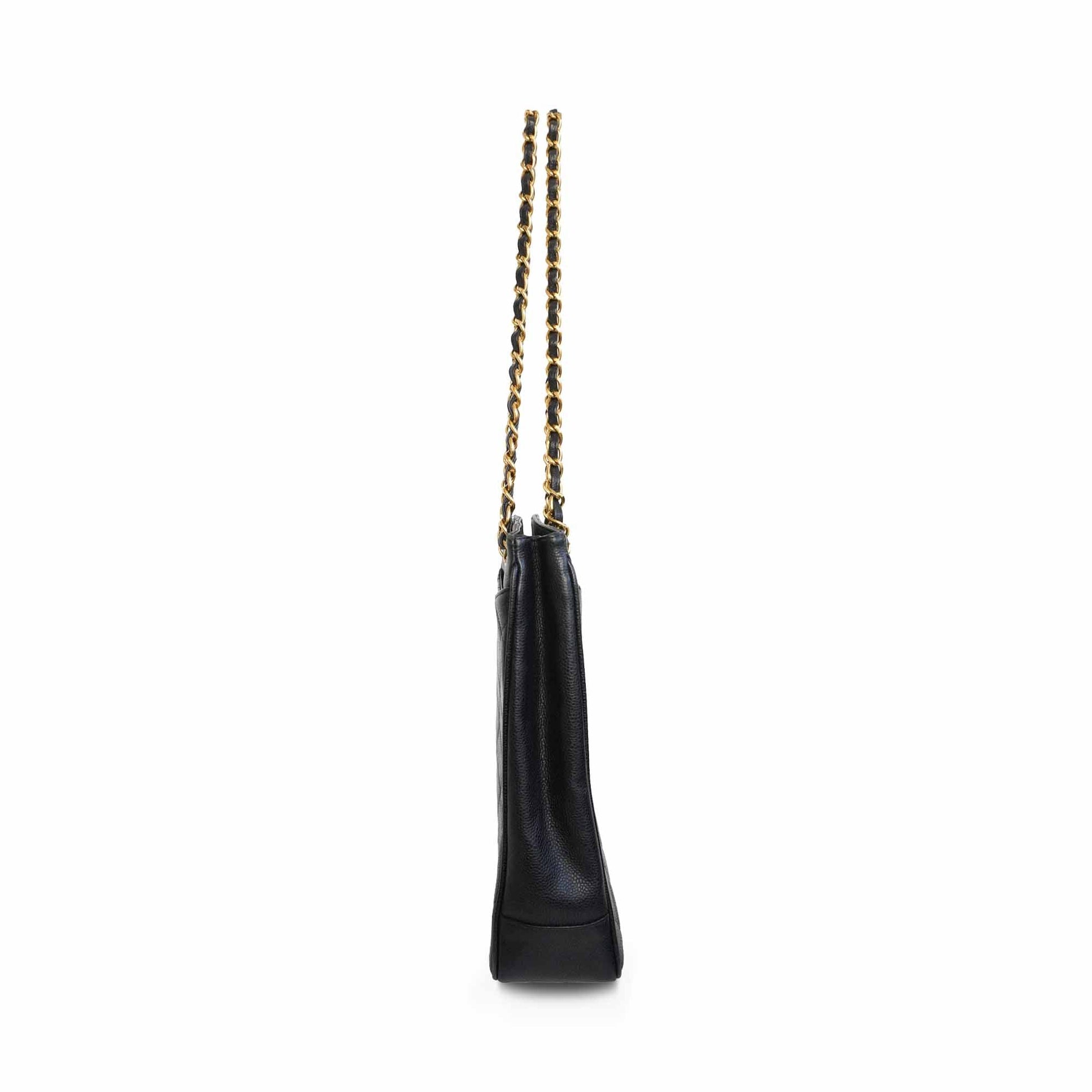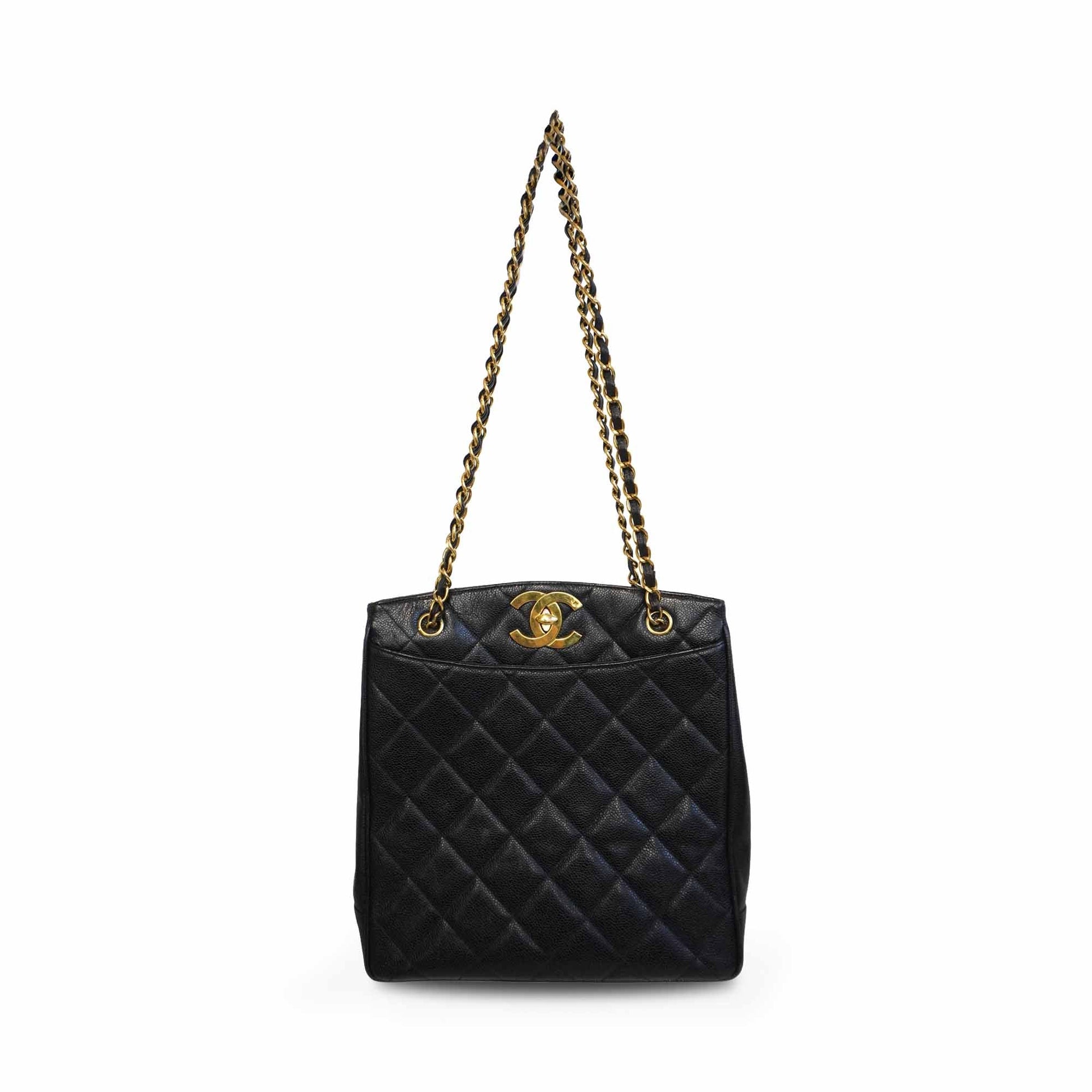 Chanel quilted black caviar leather tote bag with chain shoulder straps, large CC turnlock closure, and 24kt gold plated. and exterior slip pockets. Features a black leather lining, two inner zip pockets, and two exterior slip pockets.