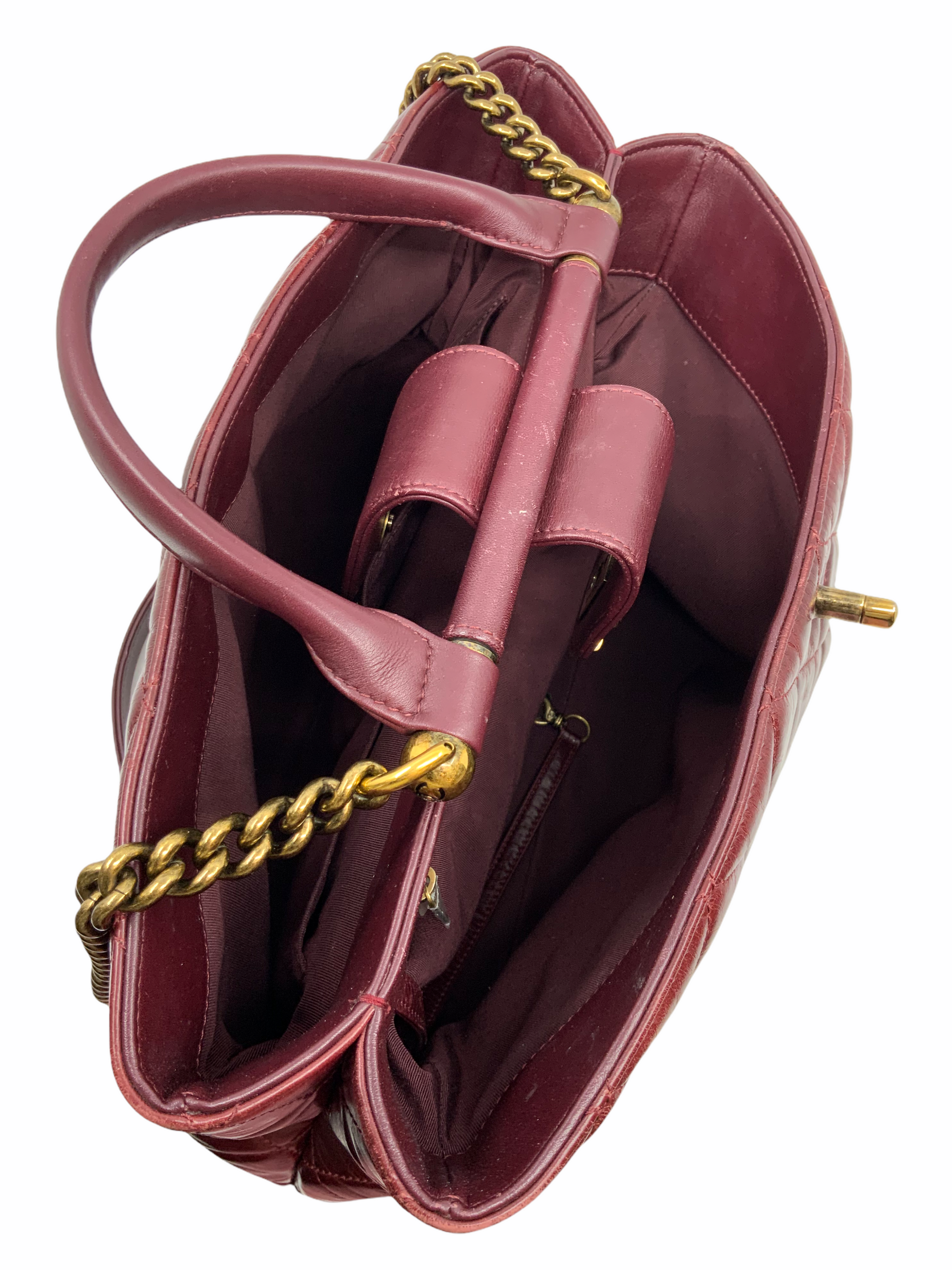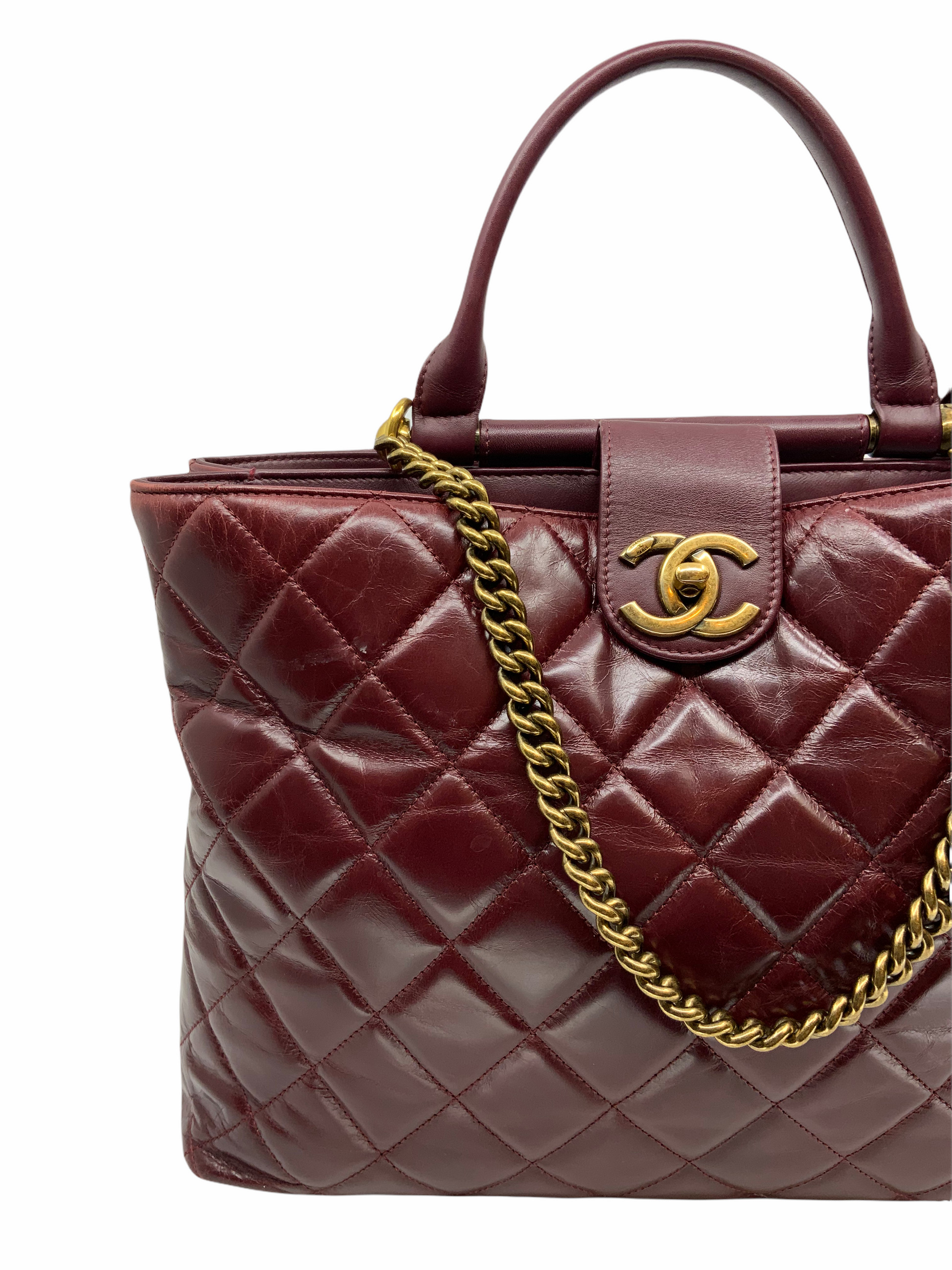We the ity of this absolutely gorgeous Chanel Quilted Large Gold Bar Top Handle Tote from the 2017 Collection crafted from signature burgundy puffy diamond quilted calfskin and aged gold-tone hardware. This chic and ultra-functional bag is a more current style and features a single top handle on a swivel, including a long chain link strap with a comfortable leather shoulder pad. The top-center leather flap-tab includes a secure front 'CC' turn-lock and rear magnetic snap closure that opens to a spacious dual compartment interior finely lined in tonal burgundy fabric with a zipper pocket.