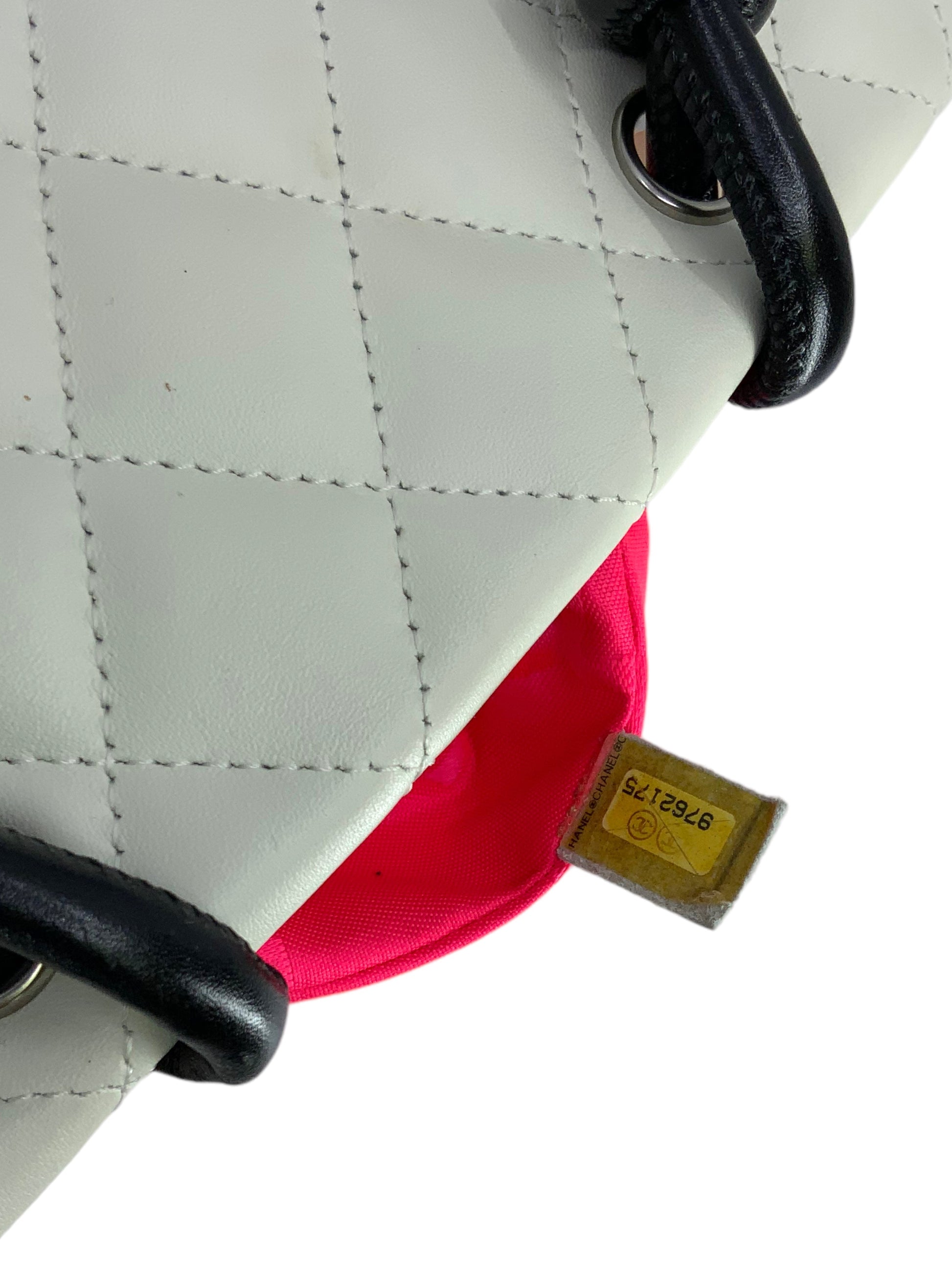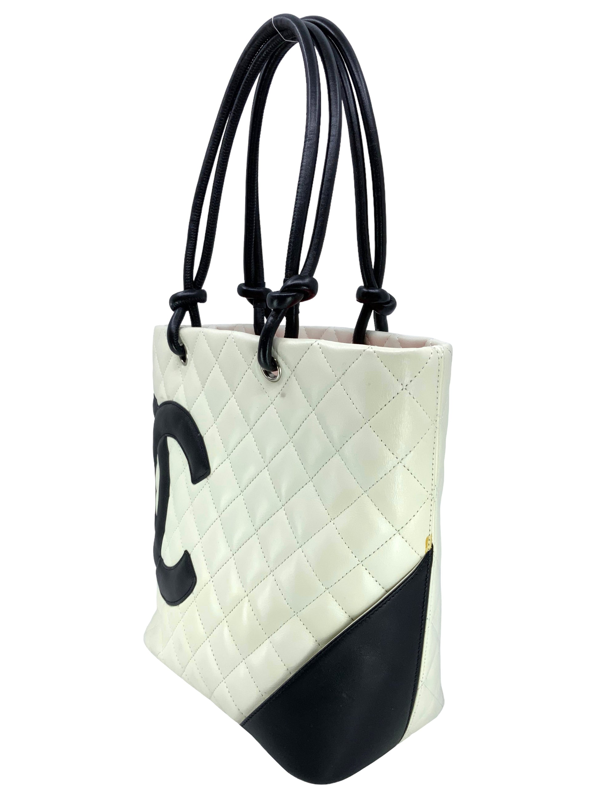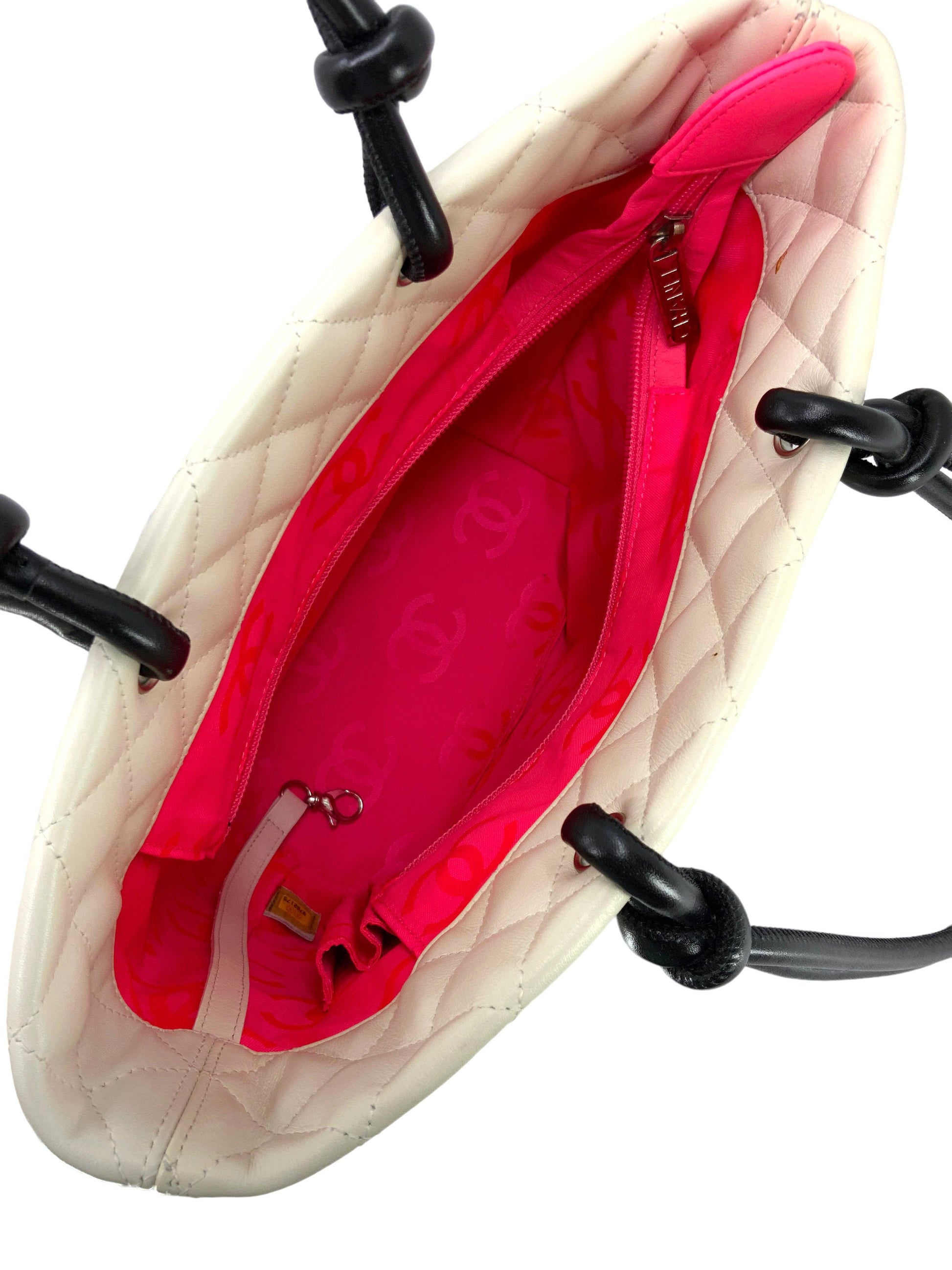 We the ity of this gorgeous Chanel Quilted Leather Medium Cambon Tote. This iconic tote is structured with white diamond quilted calfskin and features silver- tone hardware, a contrasting oversized black CC logo and and a bright pink interior canvas lining with zip and cell phone pockets.