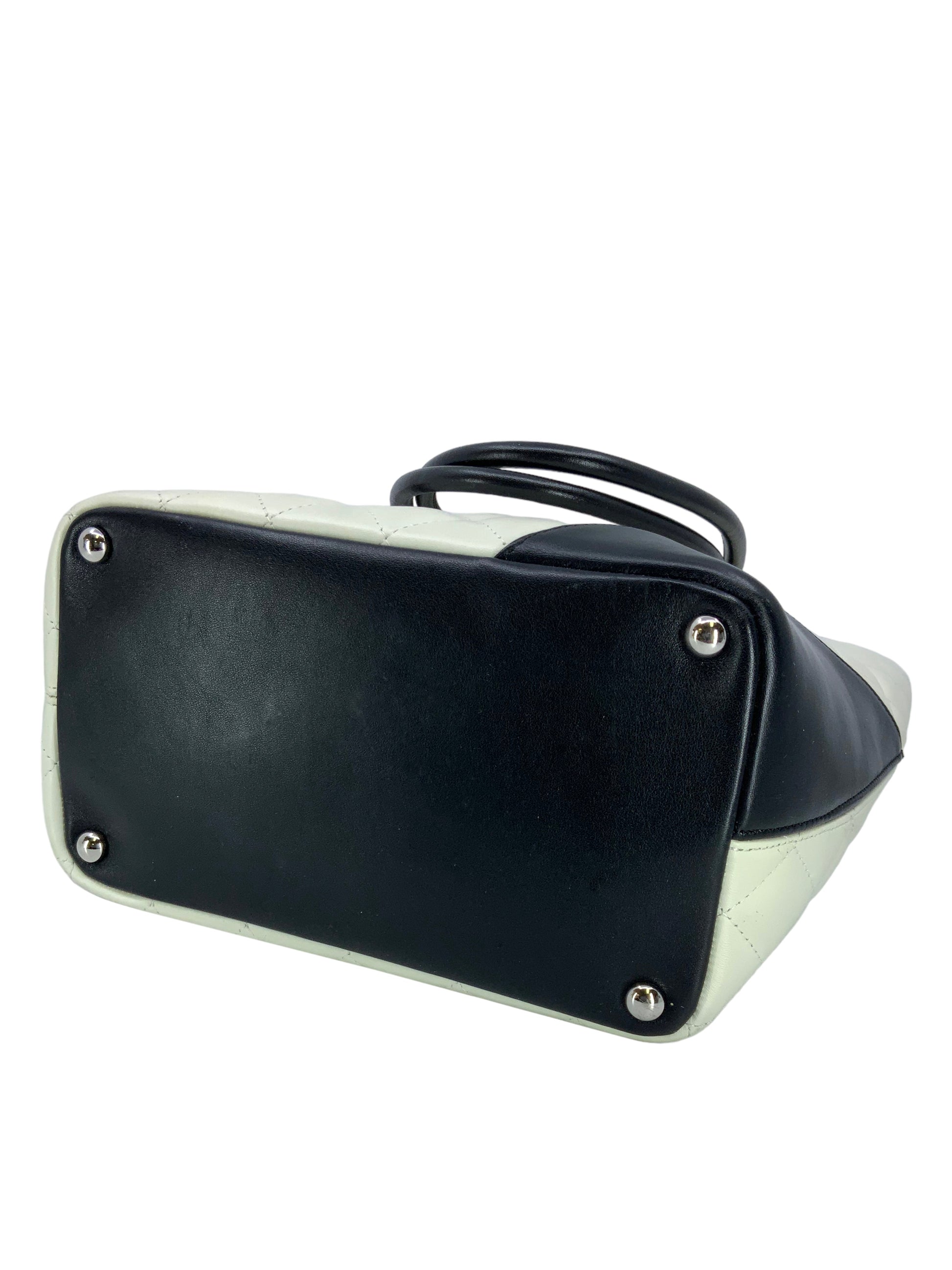 Condition: Very Good. The exterior leather is in overall excellent condition with a few minor markings throughout that are minimal at most. A small scuff mark is present under the right handle ring on the white calfskin. The black leather base of the bag has a few tiny marks. The interior is perfect.