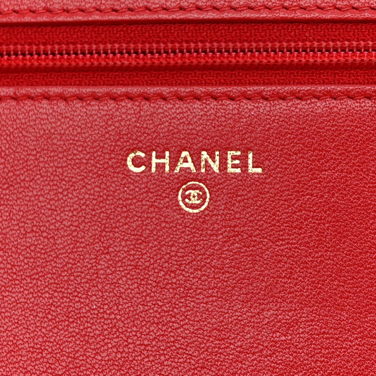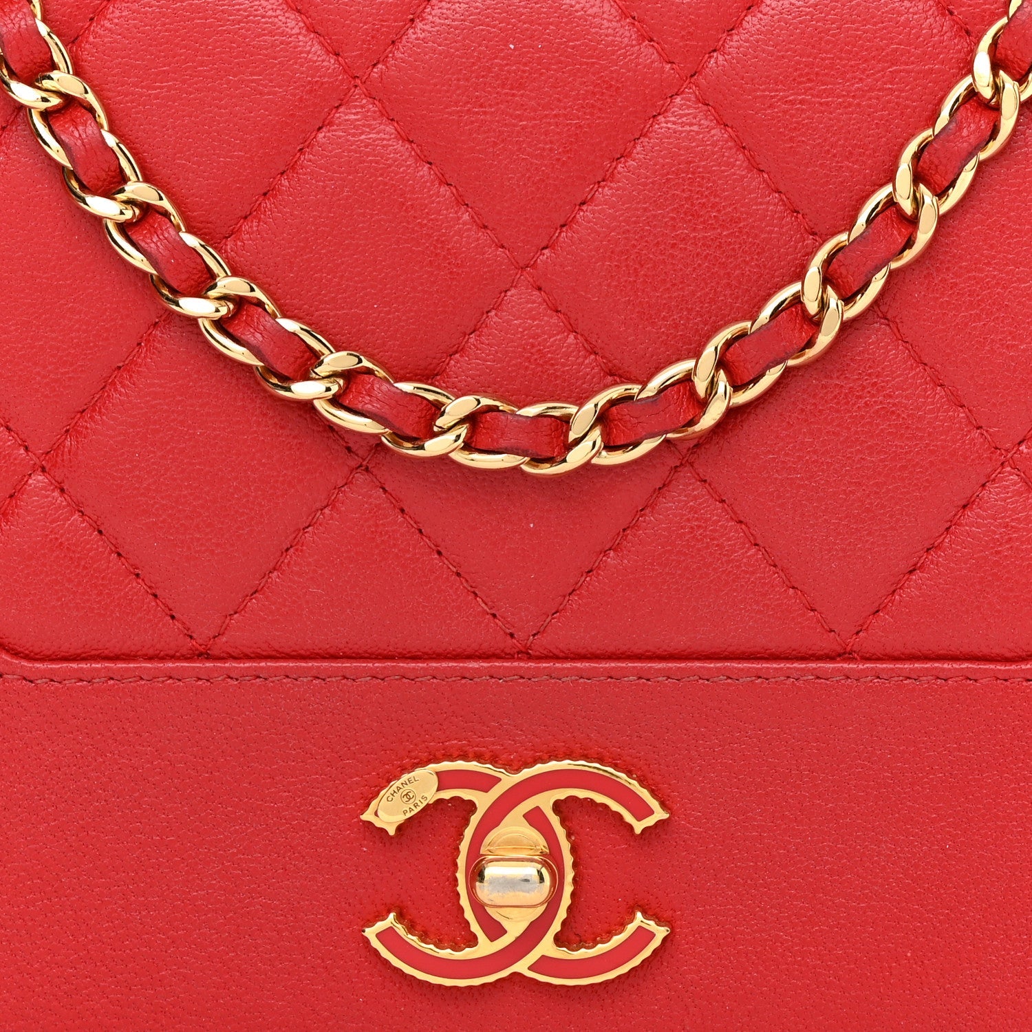 This Stunning Sheepskin Quilted Mademoiselle Vintage Wallet On Chain WOC in Red, is Crafted of Diamond Quilted Sheepskin leather in Red with a linear trim.