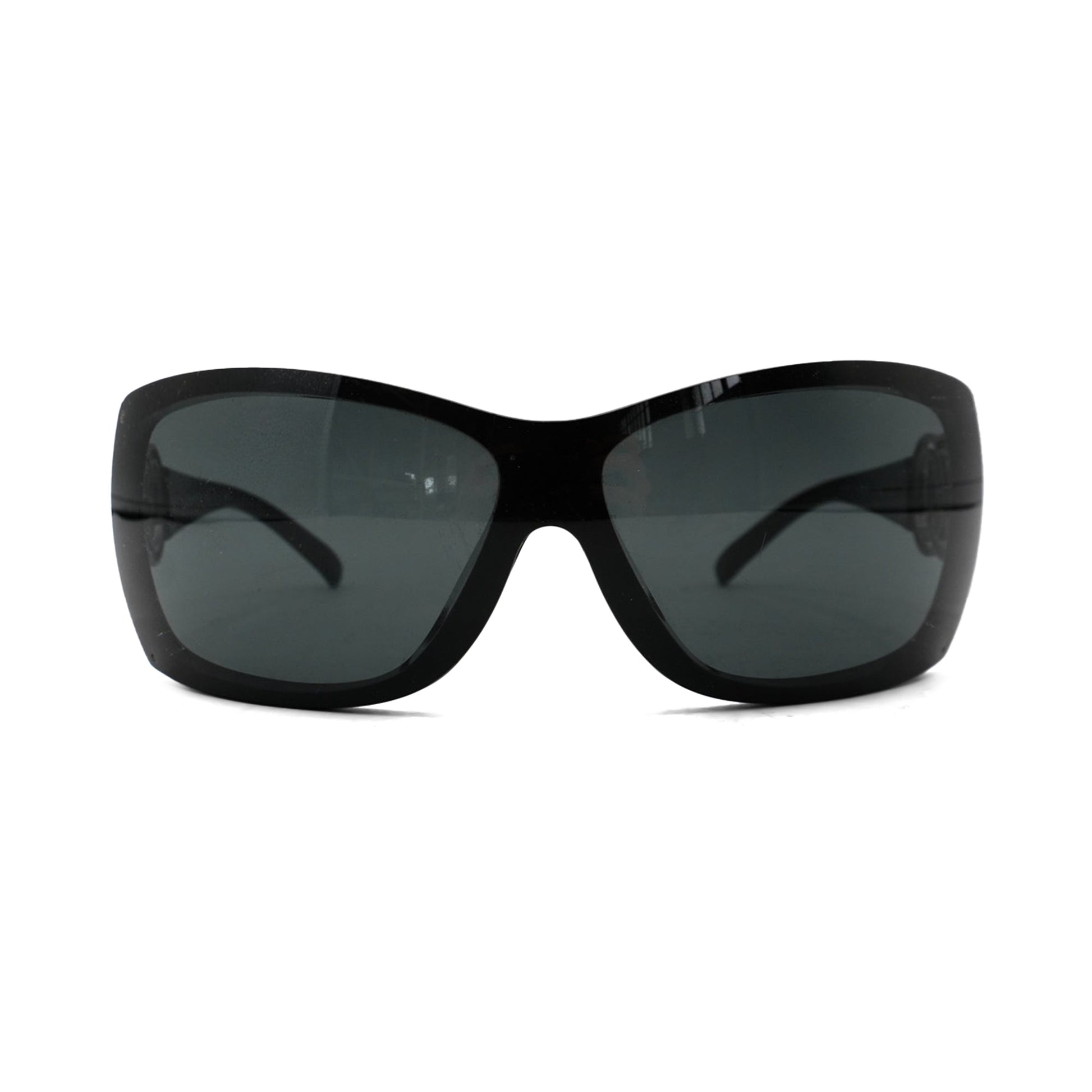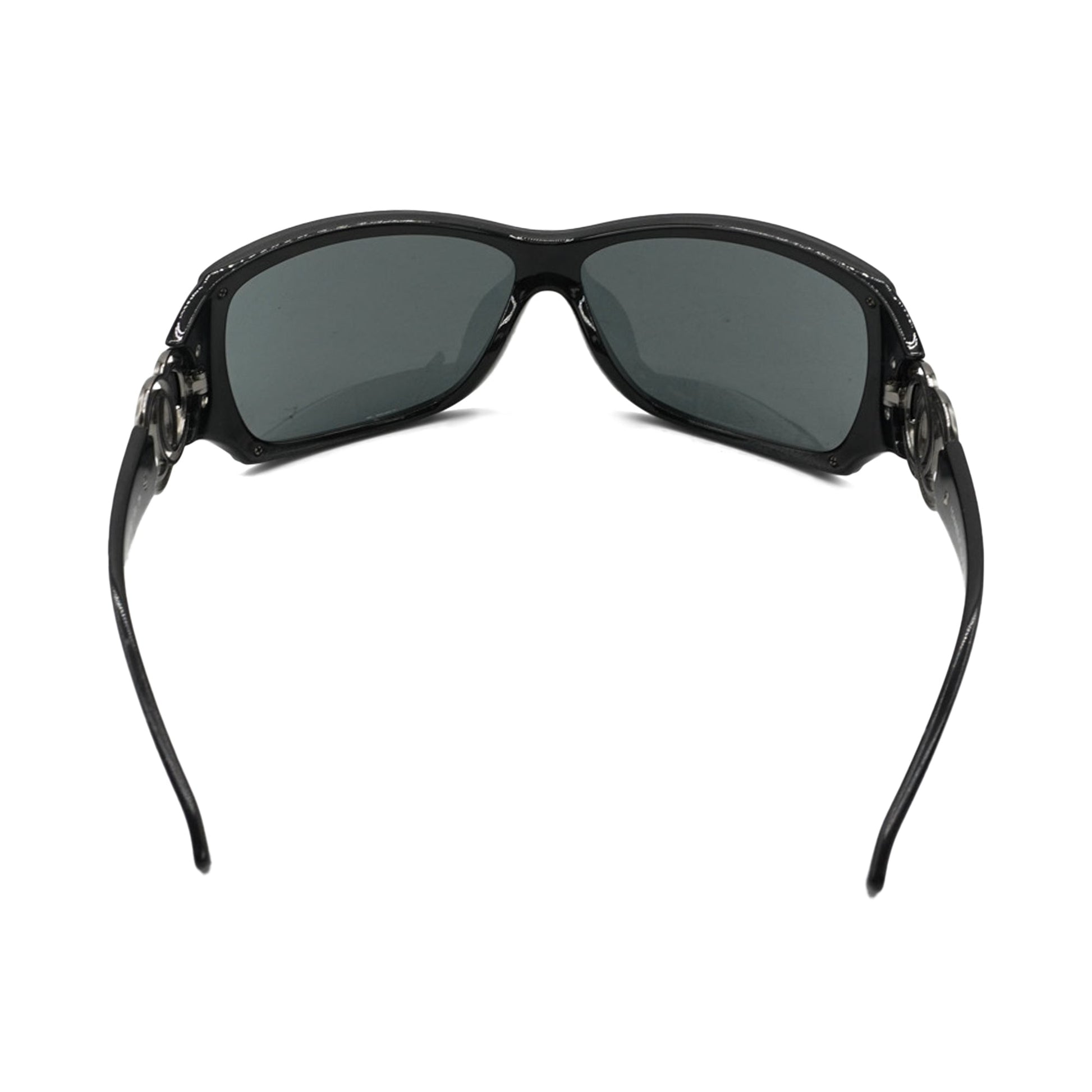 Chanel shield sunglasses in black acetate with a frameless lens and gunmetal 'CC' hardware on the arms.