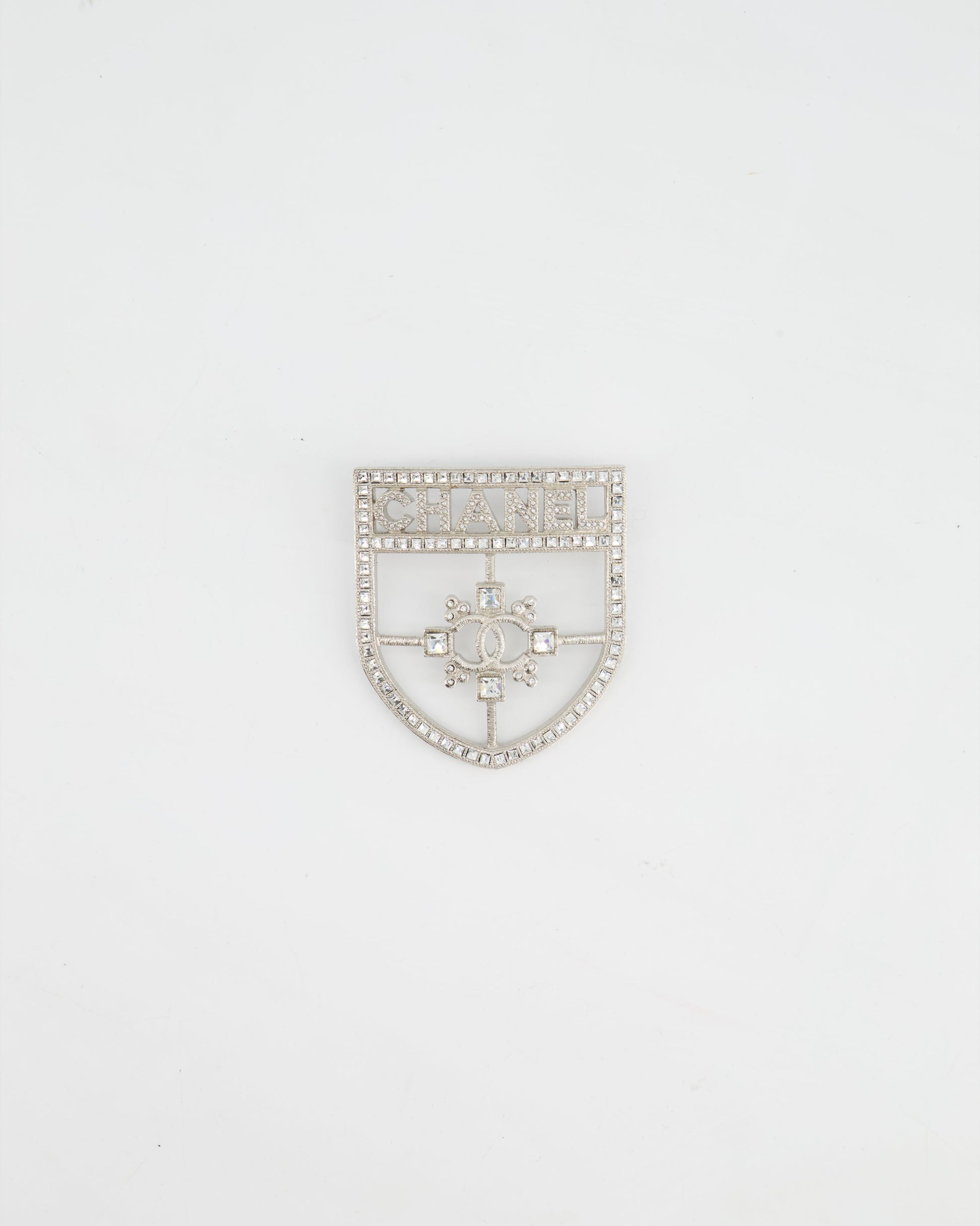 Chanel Silver Crystal Large Brooch with CC and Logo Details
