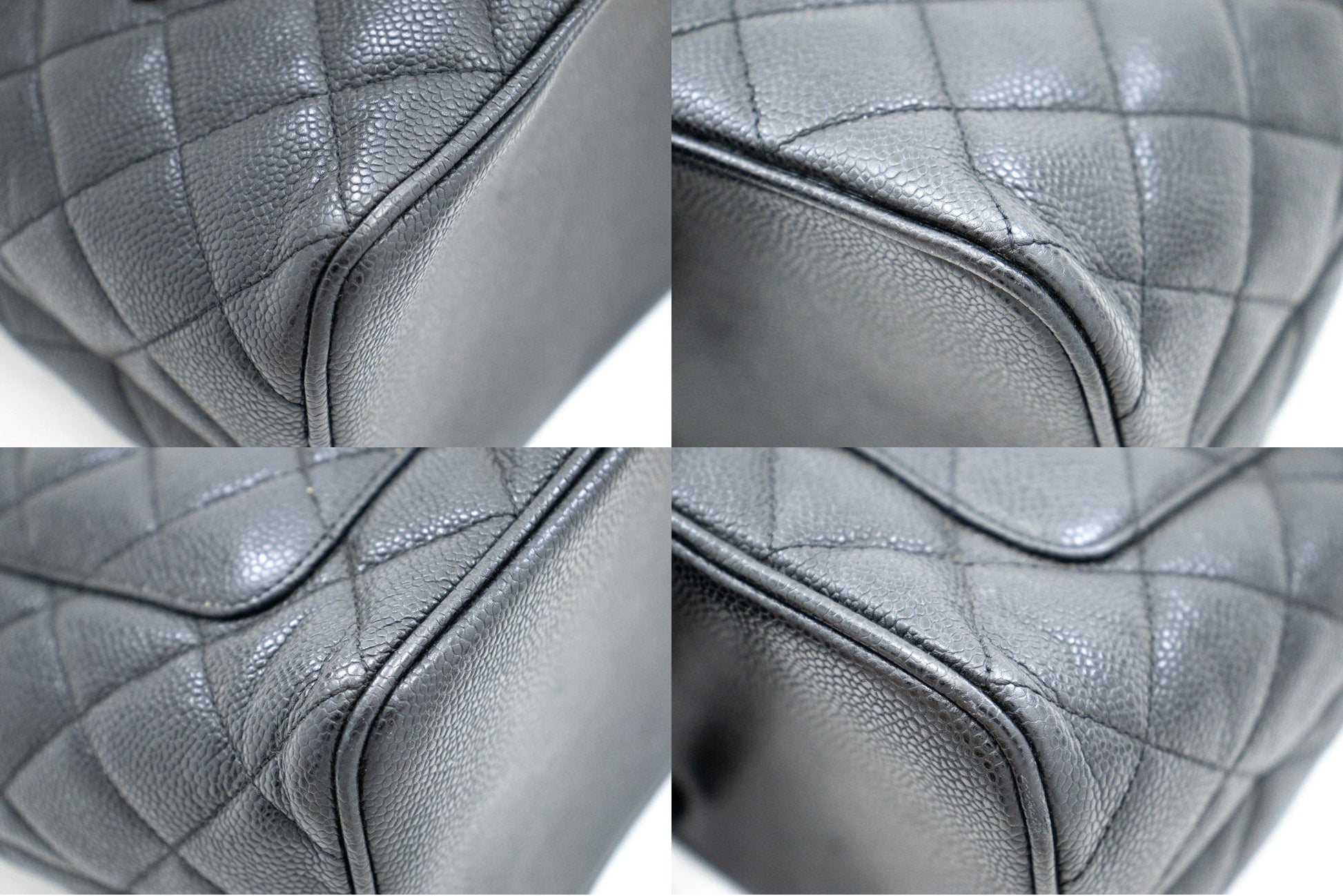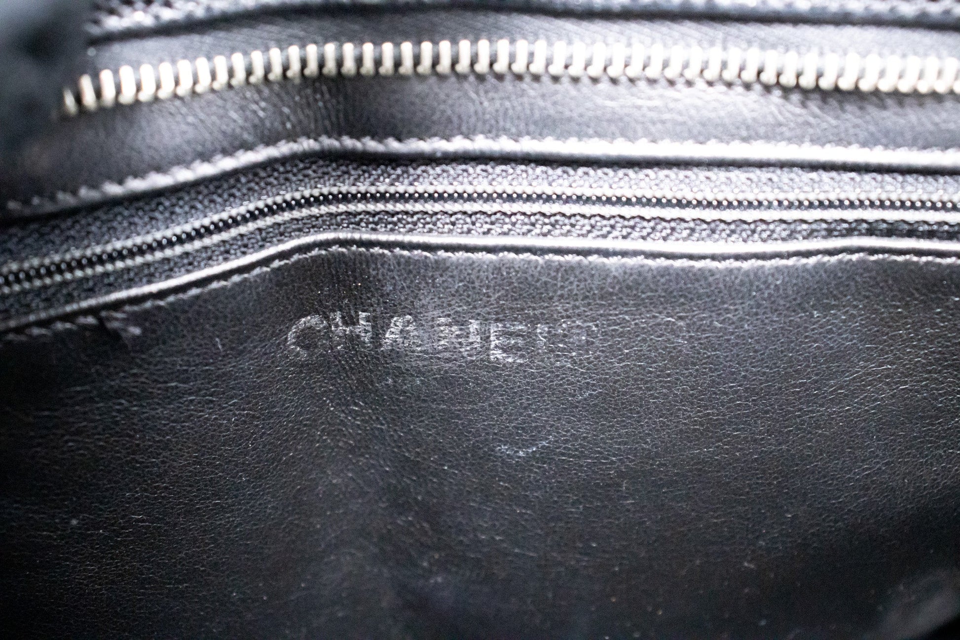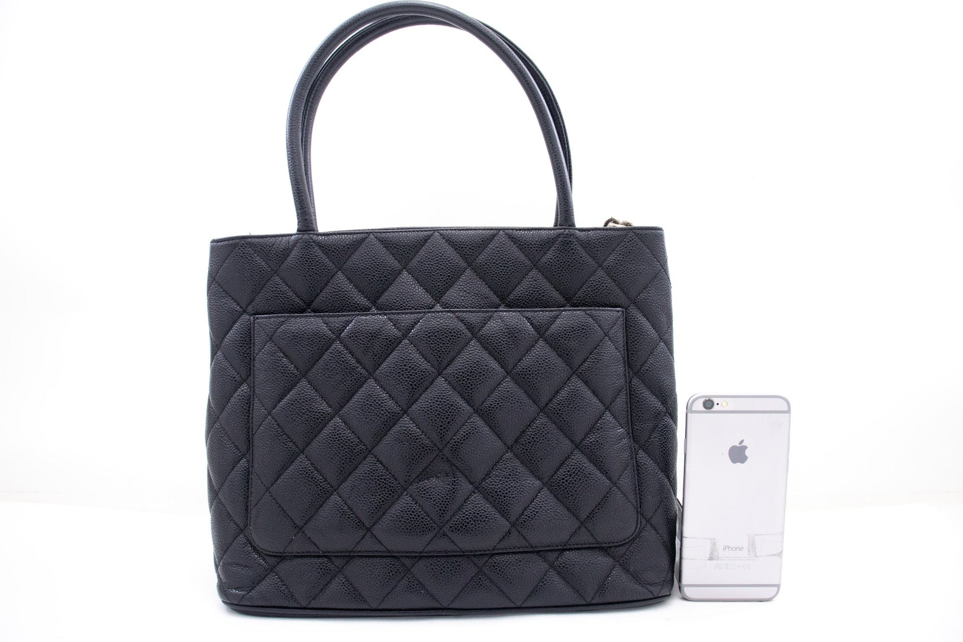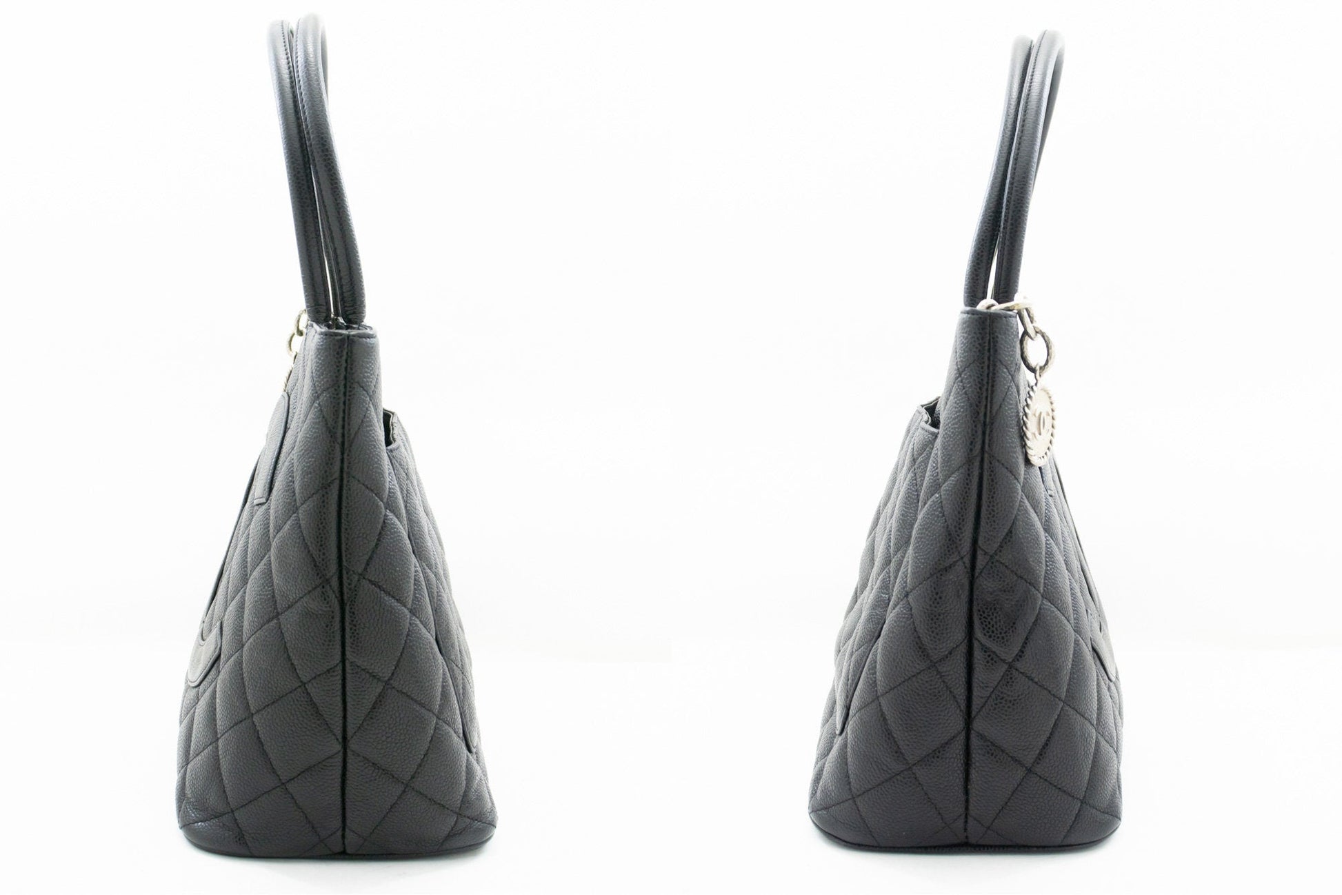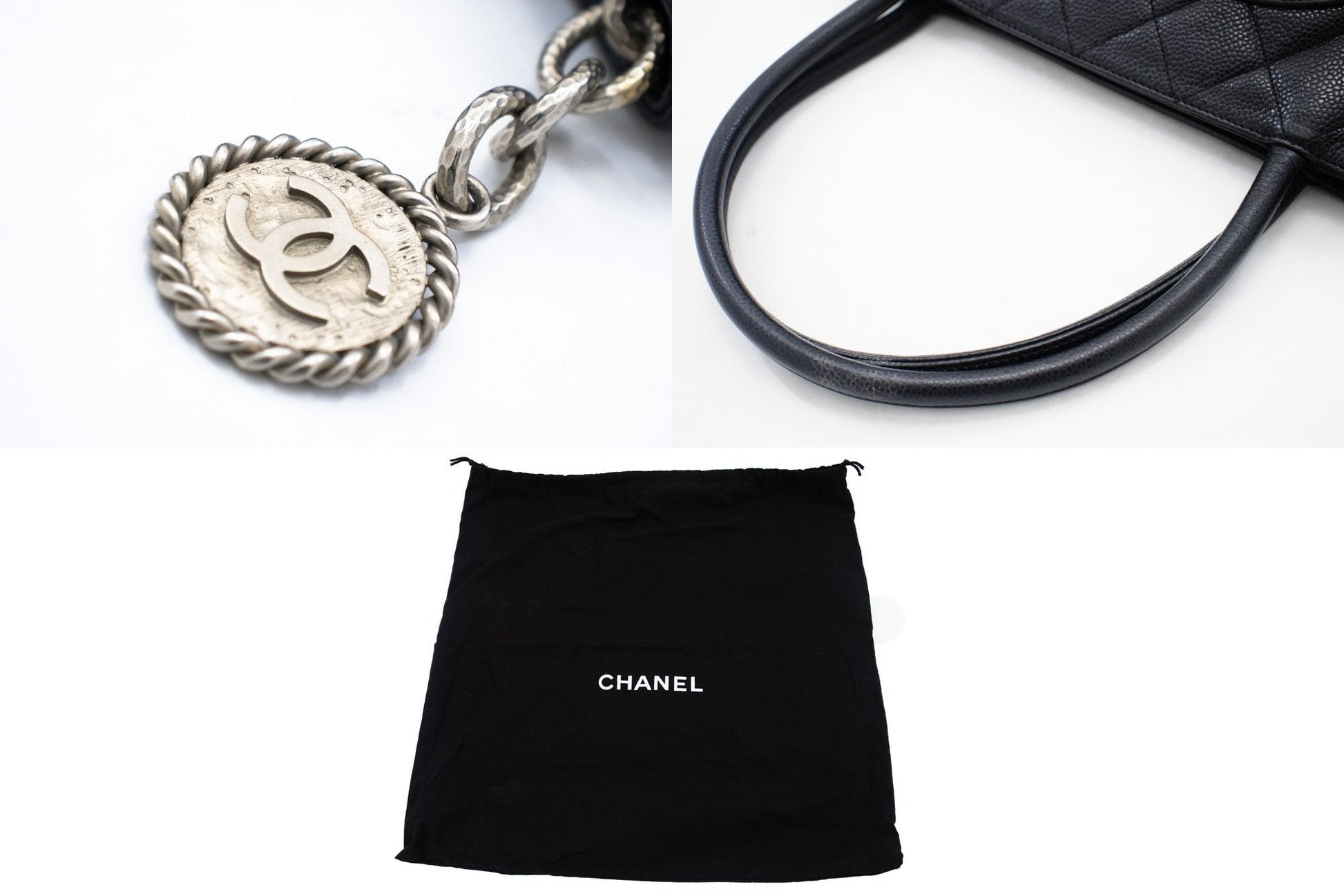 An CHANEL Silver Medallion Caviar Shoulder Bag Shopping Tote Black.