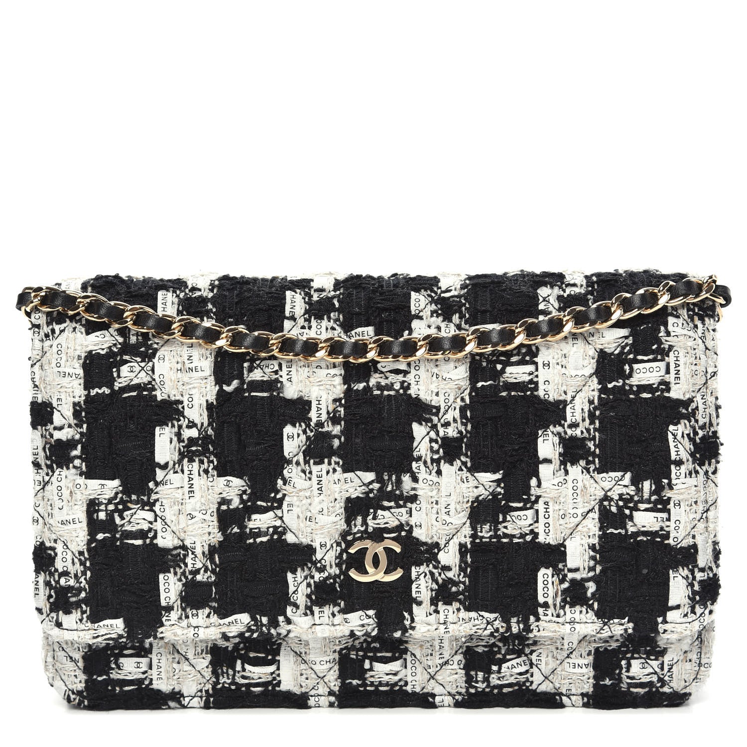 This stunning wallet on chain is crafted of luxurious tweed fabric in black and white with Chanel ribbon accents. The bag features a light gold leather threaded chain-link shoulder strap. This opens to a black leather compact interior with card slots and a full panel pocket.
