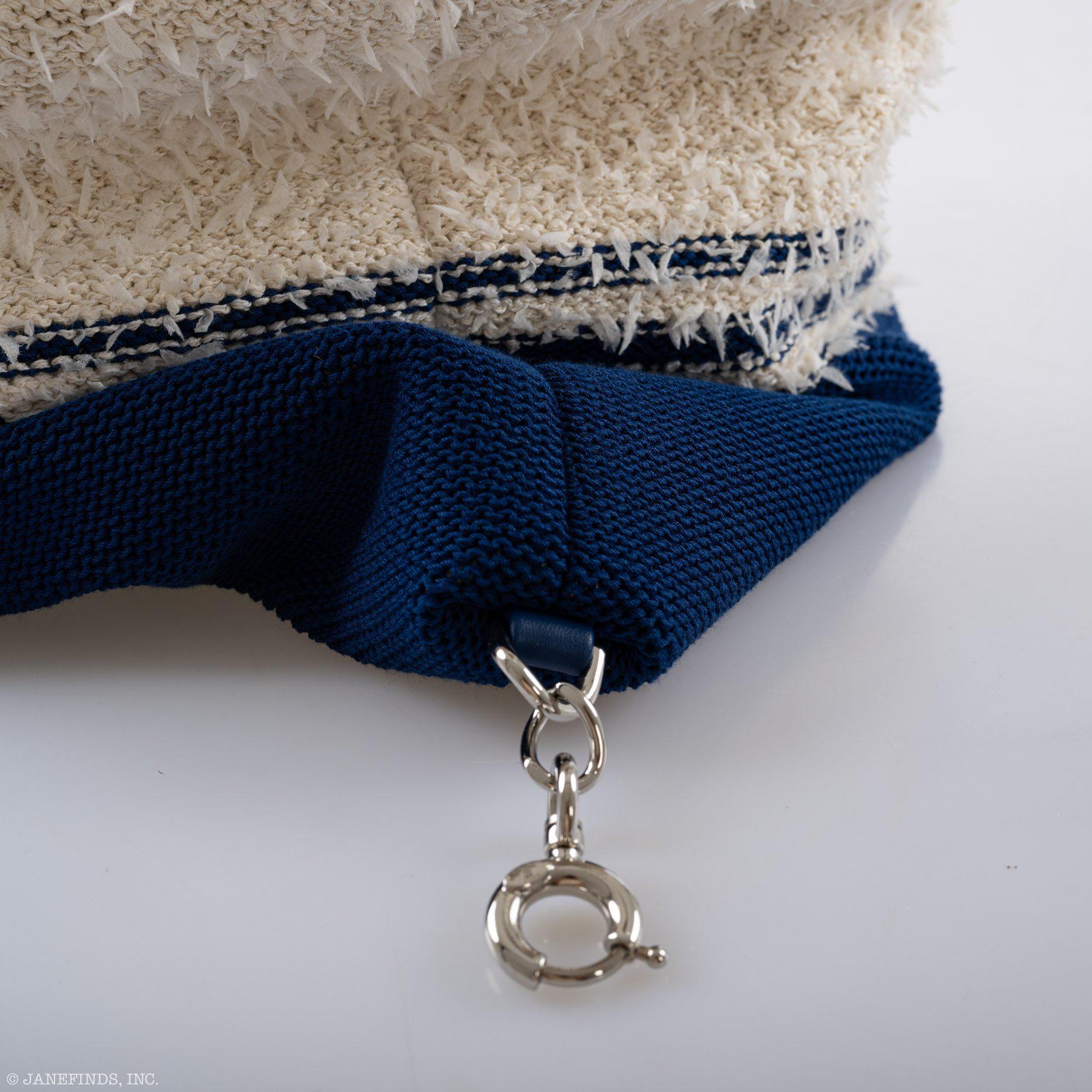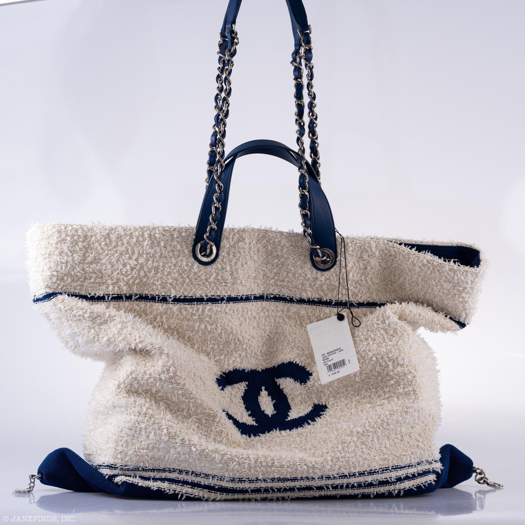 This Chanel Venise Biarritz CC Tote, crafted in a chic white and navy terricloth canvas, is a stylish and functional accessory that embodies the essence of casual luxury. This tote, with its spacious and practical design, makes a statement of effortless elegance and is a nod to Chanel's timeless aesthetic. The bag's white canvas base is both crisp and versatile, offering a bright and clean look. It's complemented by navy blue accents, including the iconic Chanel CC logo, which adds a classic nautical touch, along with Navy lambskin handles and iconic Chanel chains. This color combination evokes the relaxed elegance of seaside resorts and luxury yachting, making the Venise Biarritz tote an ideal accessory for summer getaways and coastal retreats. This is more than just a beach bag; it's a versatile piece that blends the relaxed vibe of a seaside holiday with the luxury and sophistication of Chanel, appealing to those who love to merge fashion with functionality.