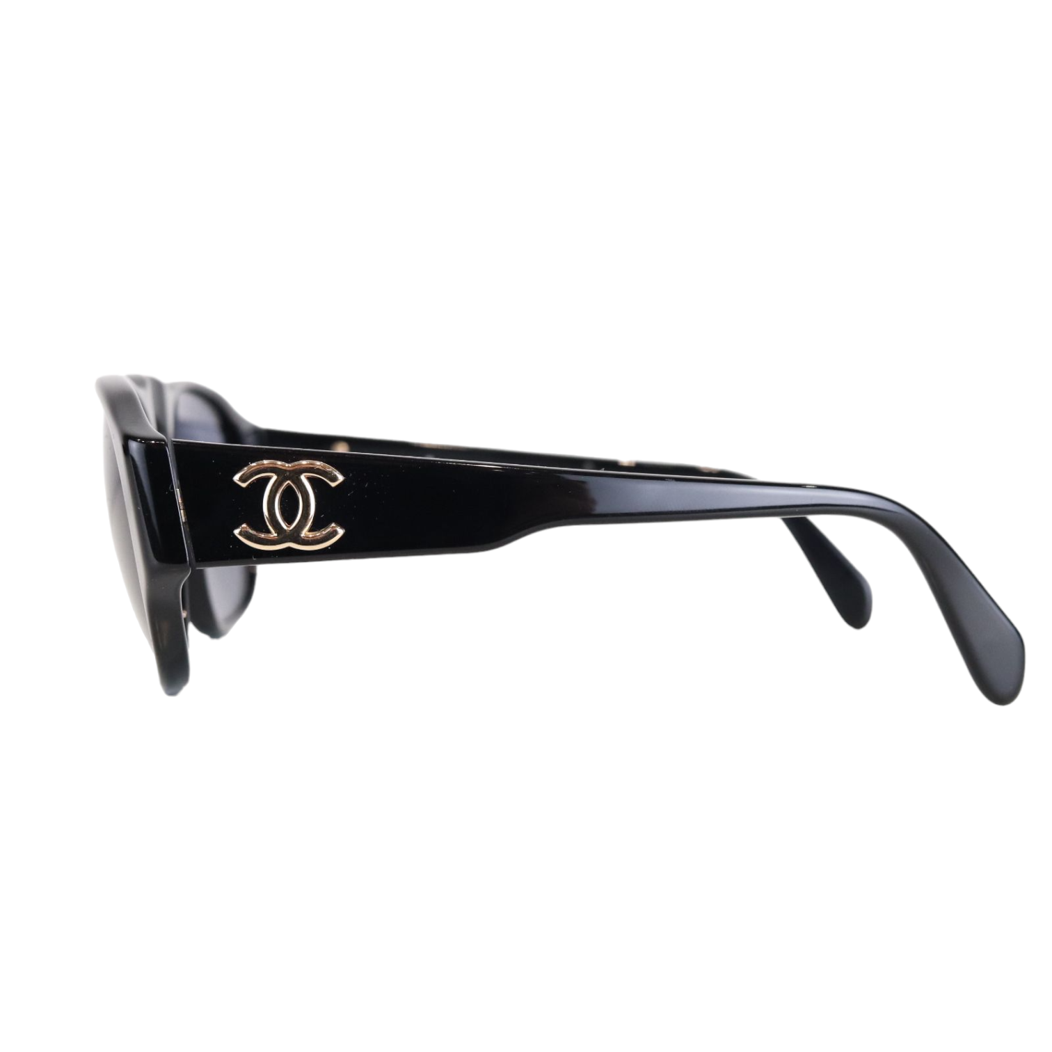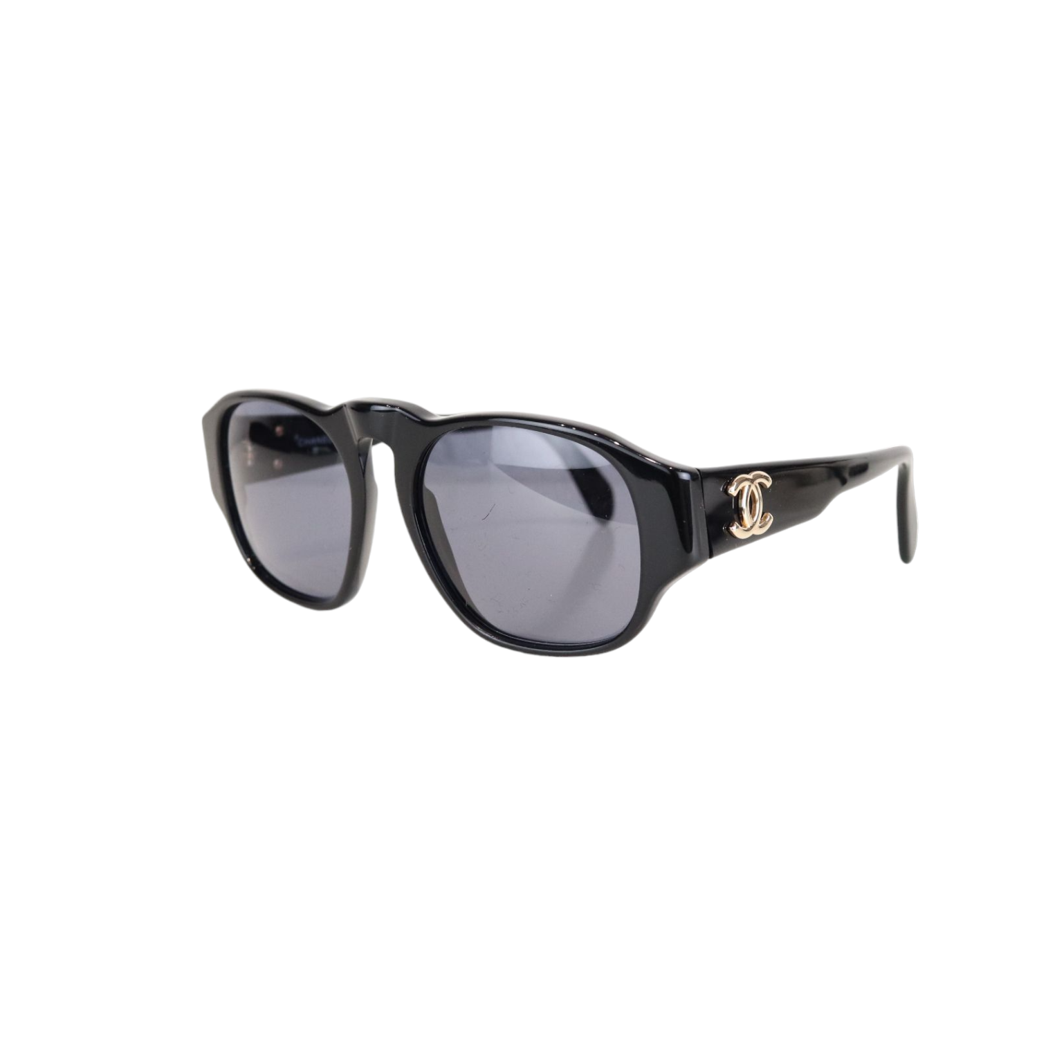 This is an Chanel Vintage Acetate Sunglasses in Black. These classic sunglasses have a thick dark black acetate frame with black lenses. The temples feature a gold Chanel CC logo at the hinge.