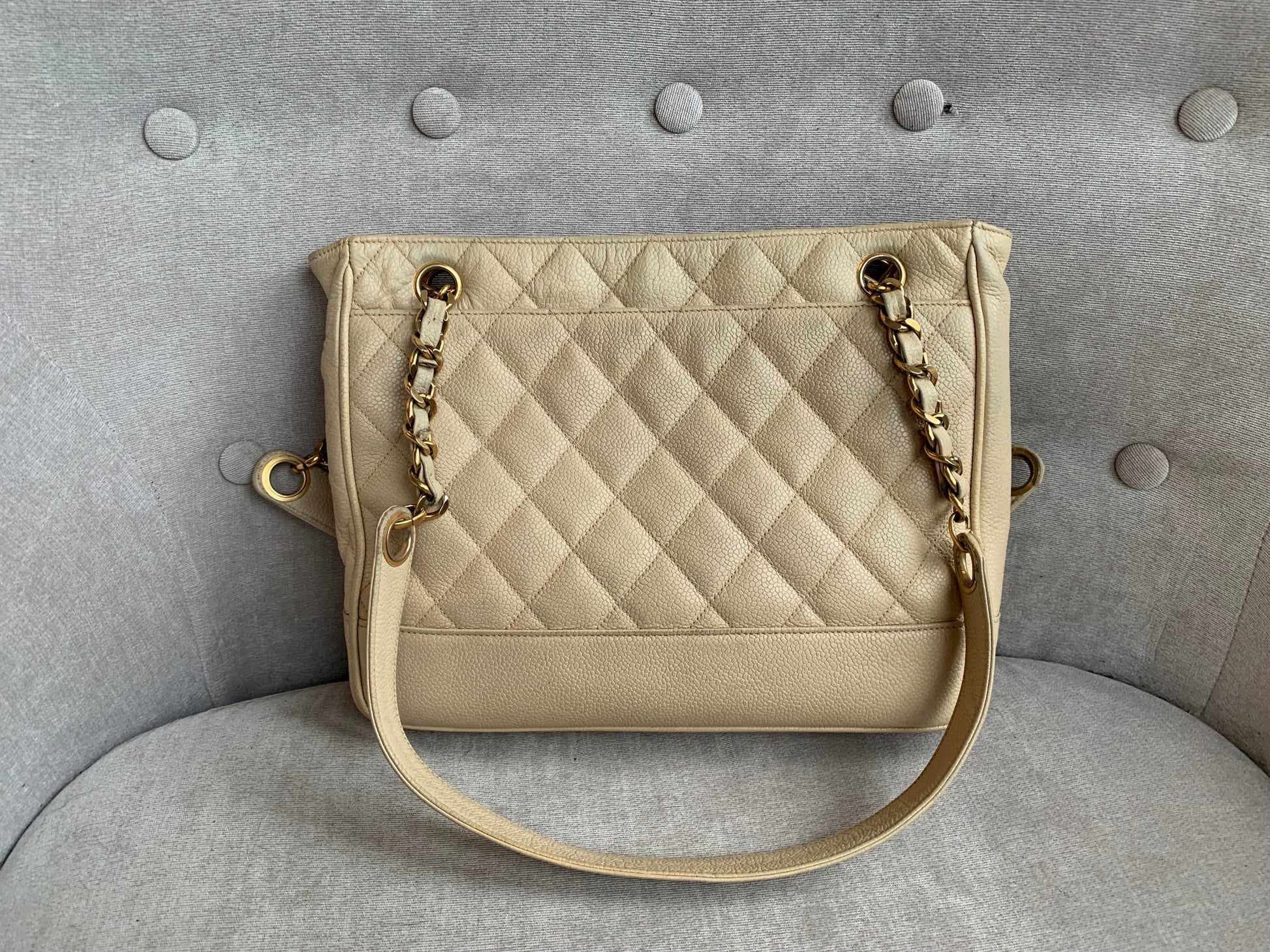 Chanel Chain Tote in Quilted Beige Caviar leather with gold hardware. This small - medium sized tote is ideal for day to day use. Featuring magnetic popper closure and CC ball charm. Can be over shoulder or carried in the arm using the interwoven leather and chain strap. In a gorgeous neutral beige shade, this colour goes with almost any outfit. The caviar leather is robust and resilient to marks making it an ideal day to day bag. Ideal for those looking for a lower priced Chanel.