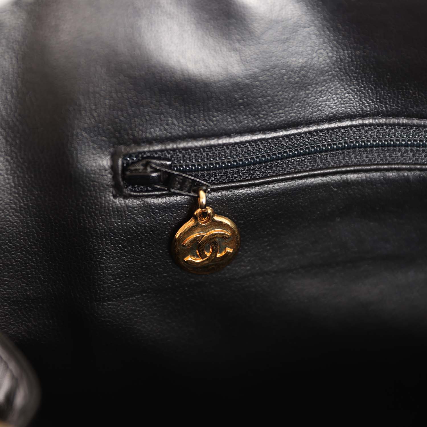 The interior is lined in black leather and features a zipper pocket with Chanel pull.