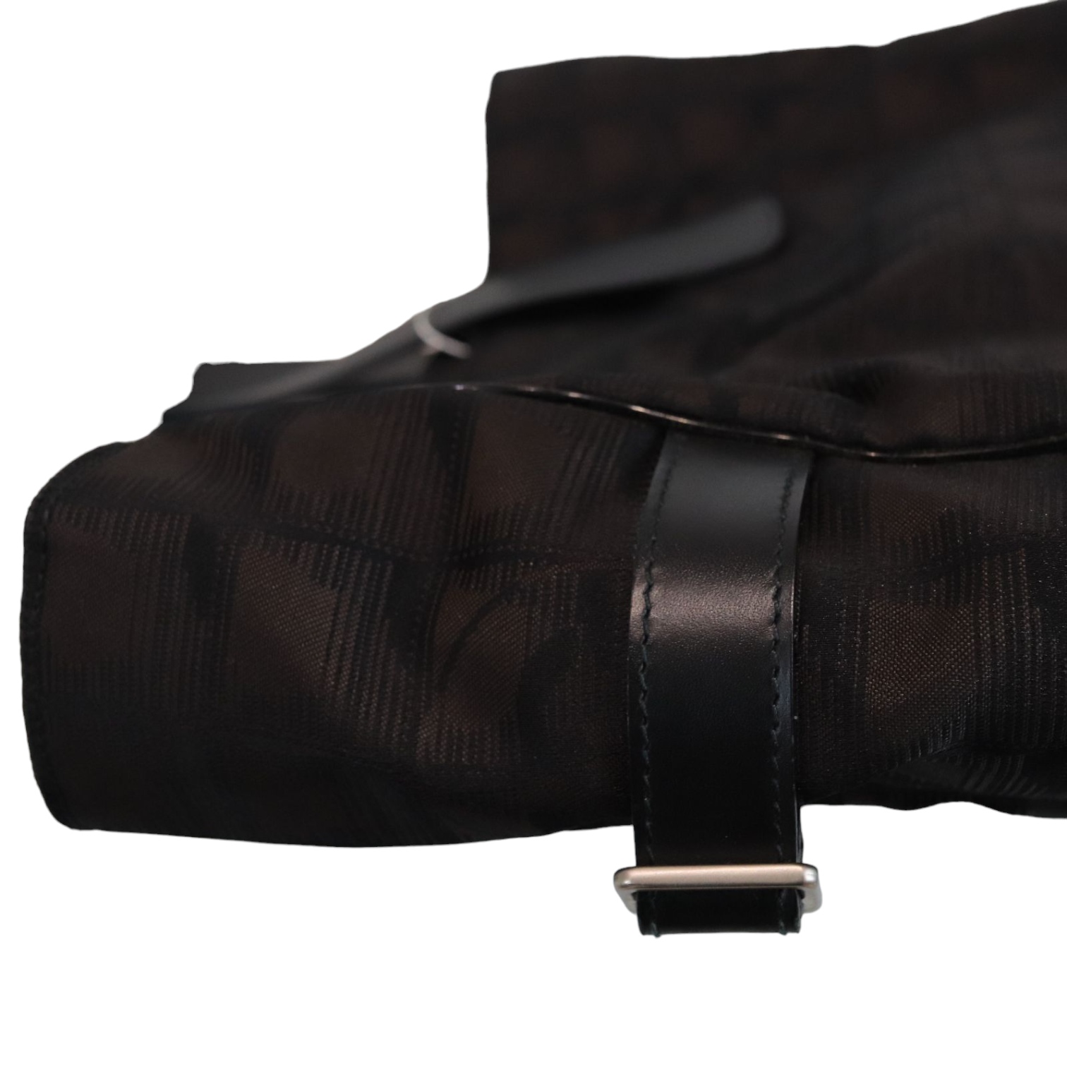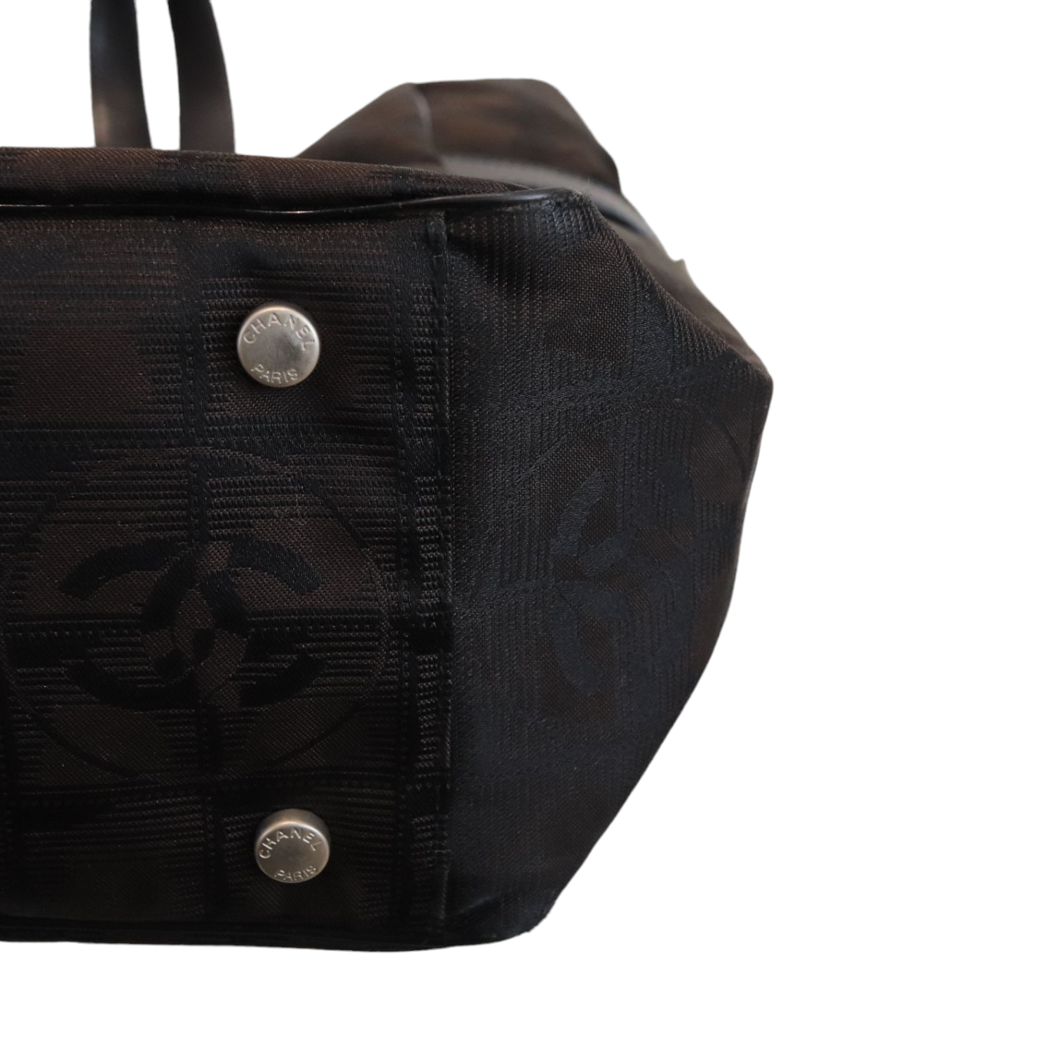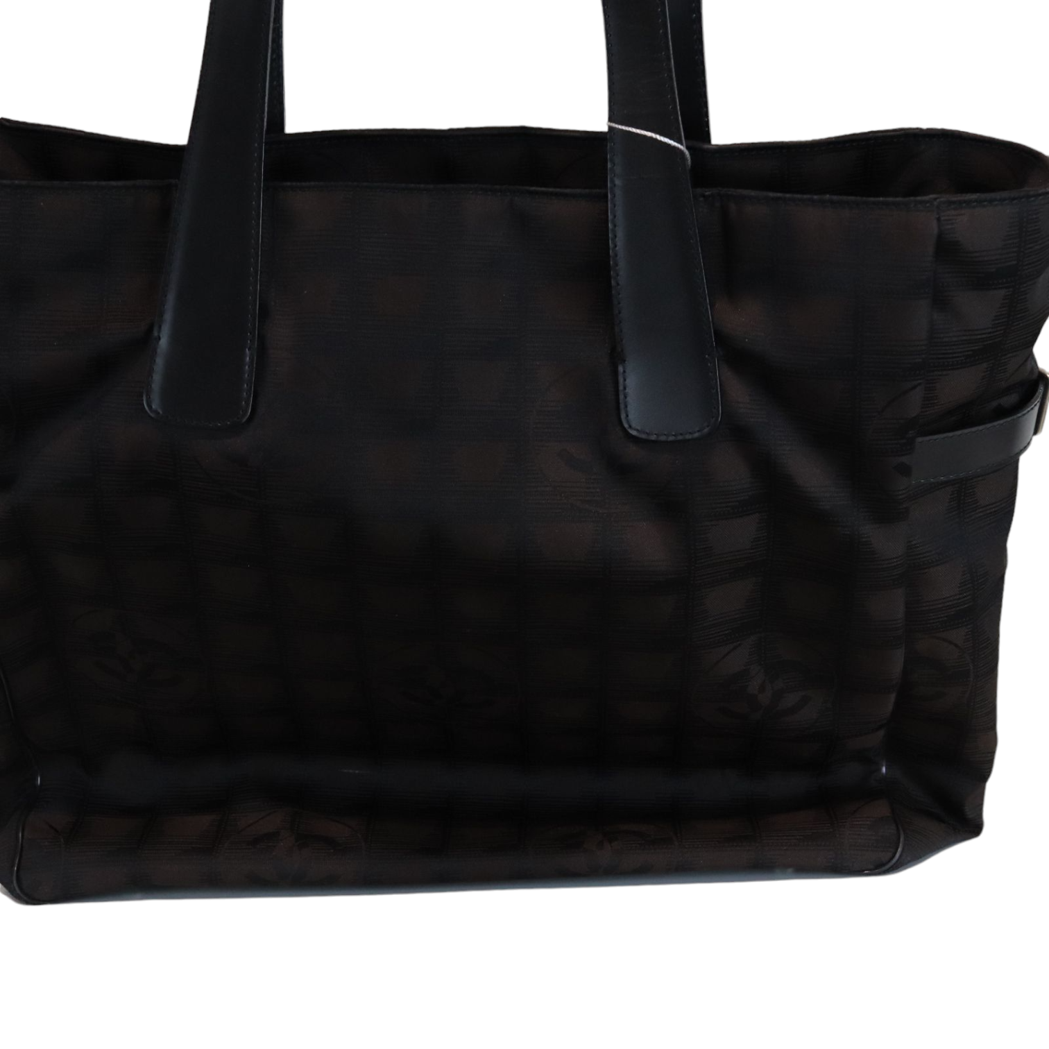 This is an Chanel Vintage Travel Tote in Chocolate Brown. This stunning tote is beautifully created of fine nylon with squared impressions. The bag features black cowhide leather top handles and Chanel CC logo impressions across the bag. The top zipper opens to a nylon interior with zipper and patch pockets.